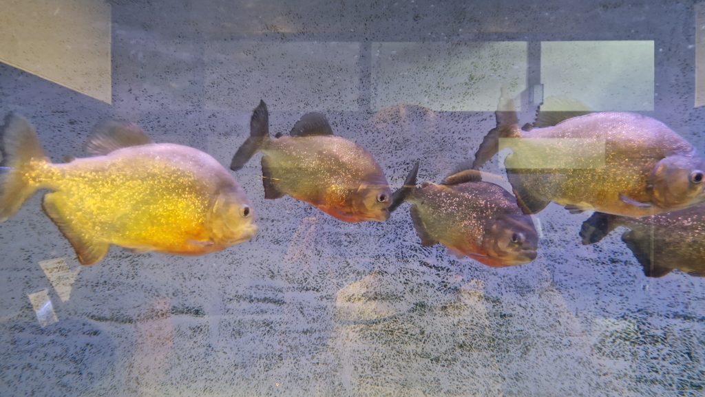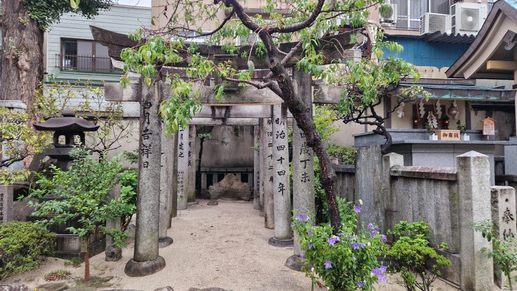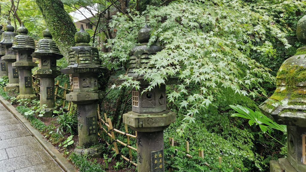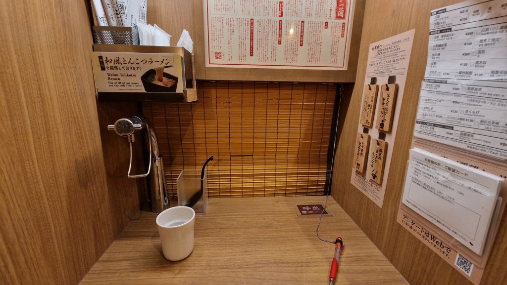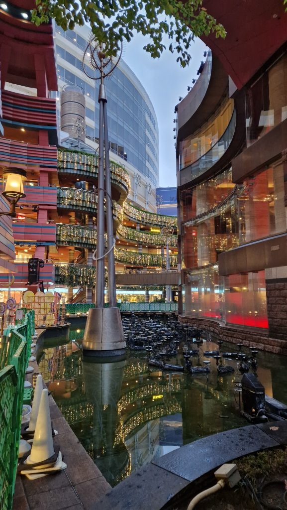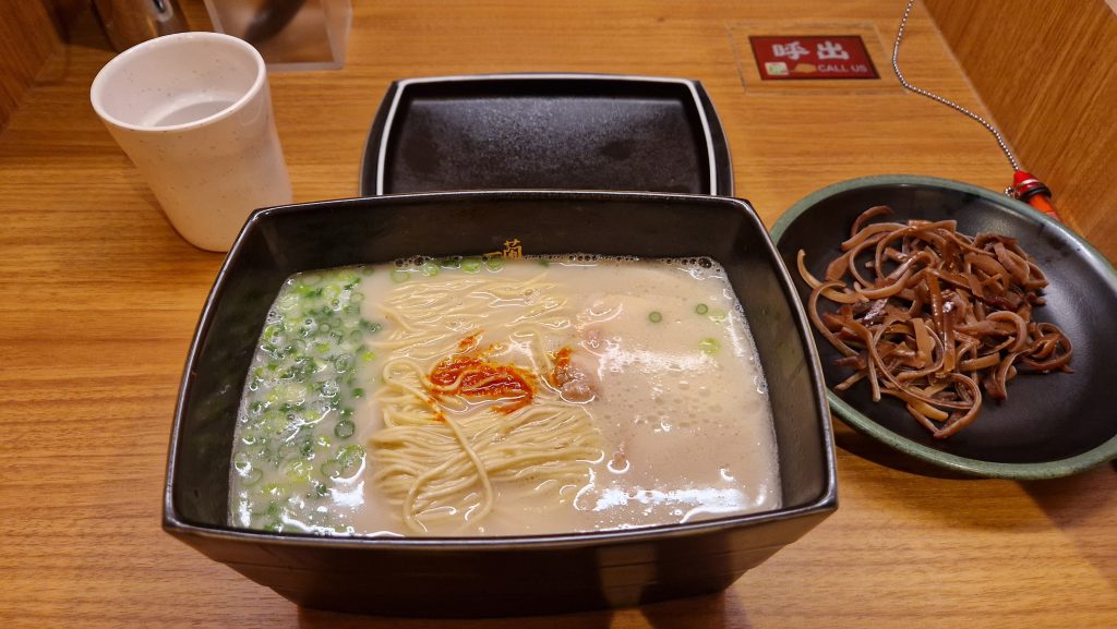 Mit dem Shinkansen fahren wir also direkt weiter nach Fukuoka. Auf dieser Strecke macht der Schnellzug seinem Ruf wirklich alle Ehre – 600km in 2,5 Stunden. Im strömenden Regen laufen wir zum Hotel. Zum einchecken ist es noch zu früh, deshalb warten wir völlig übermüdet im Aufenthaltsraum. Selbst, wenn wir fit gewesen wären, hätte Sightseeing bei dem Regen keinen Sinn gemacht. Am Abend ist es etwas trockener und wir machen uns auf den Weg zur bekanntesten Shopping-Mall der Stadt, Canal City. Auf dem Weg dahin sehen wir uns einen kleinen Schrein an. In der Dämmerung sieht er besonders schön aus. Der Schrein ist bekannt für ein Festival bei dem große Skulpturen durch die Stadt getragen werden. Diese Skulpturen sind hier ausgestellt. In der Mall gehen wir Ramen essen. Die Ichiran-Kette bietet die beliebte Tonkotsu Variante an, die ihren Ursprung in Fukuoka hat. Bei Ichiran sitzten die Kunden in kleinen Abteilen, sodass sie weder mit Sitznachbarn noch dem Personal interagieren müssen. Die Suppe steht im Mittelpunkt und man geht nach dem Essen gleich wieder. Das ist heute genau das richtige für uns. Wir schlendern noch ein bisschen durch die ungwöhnliche Mall (die Läden sind alle auf einer Seite und zum namensgebenden Kanal hin orientiert, aber es gibt kein Dach). Die Anlage ist hübsch beleuchtet, aber im Kanal ist fast kein Wasser und der beliebte Brunnen ausgeschaltet.