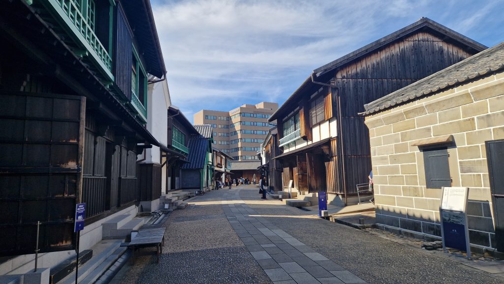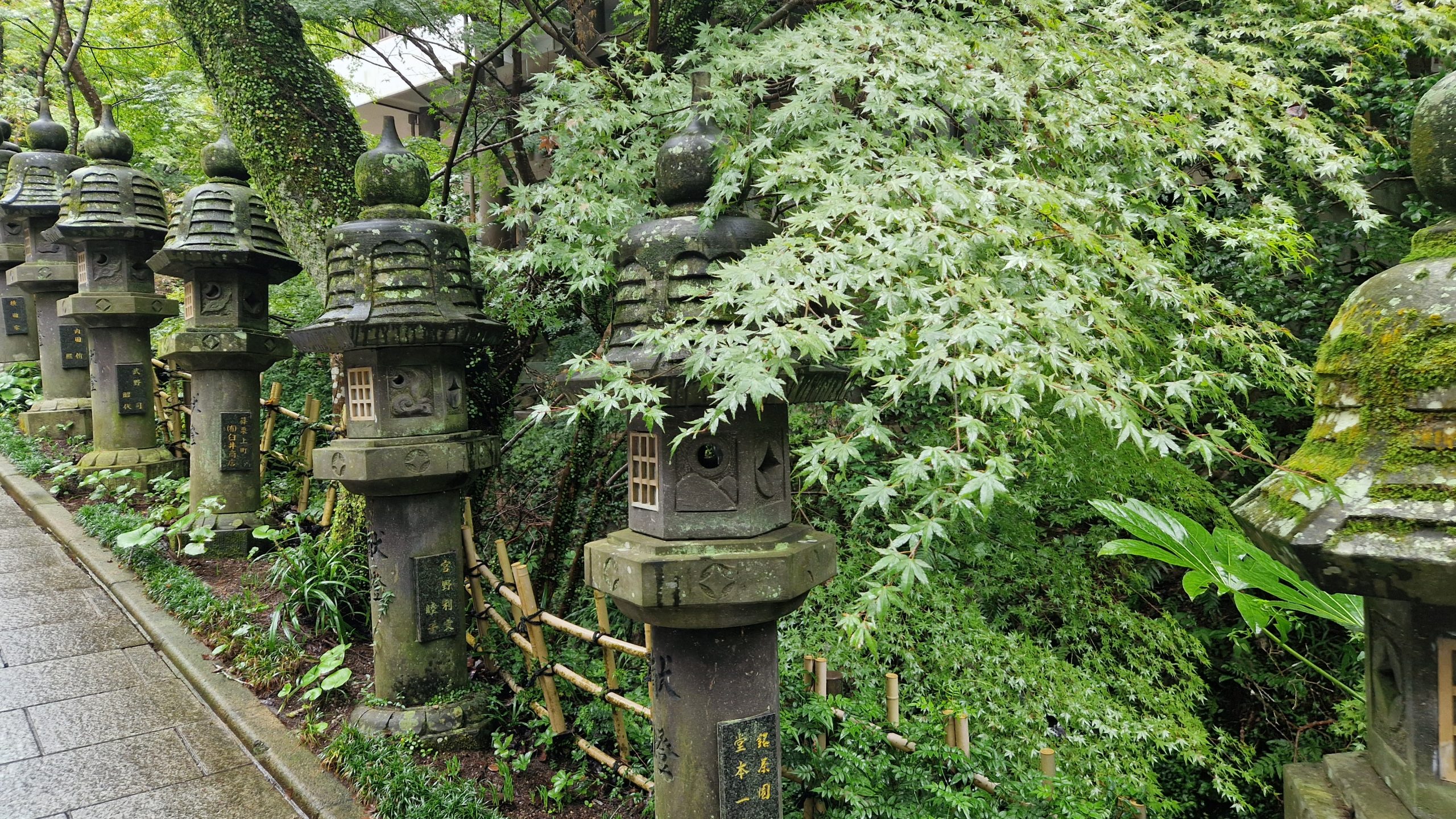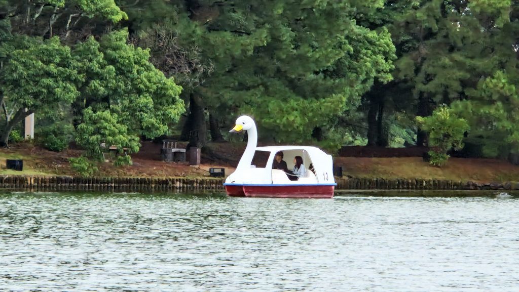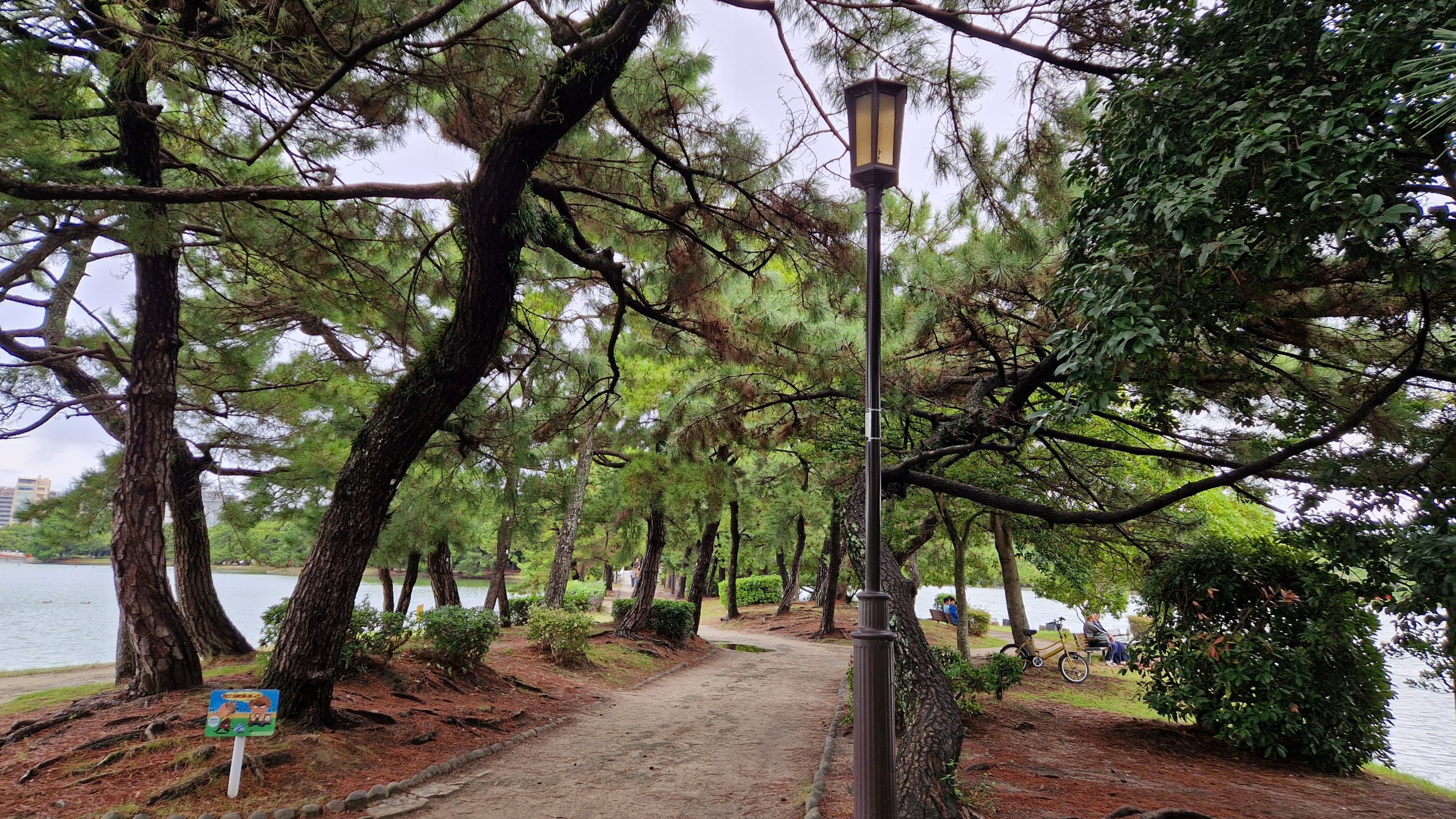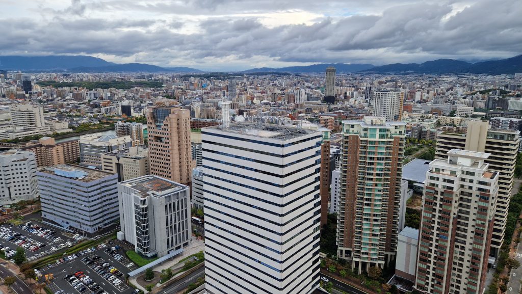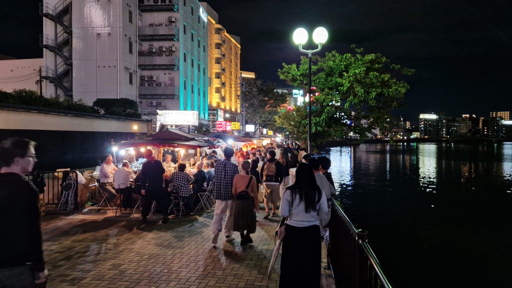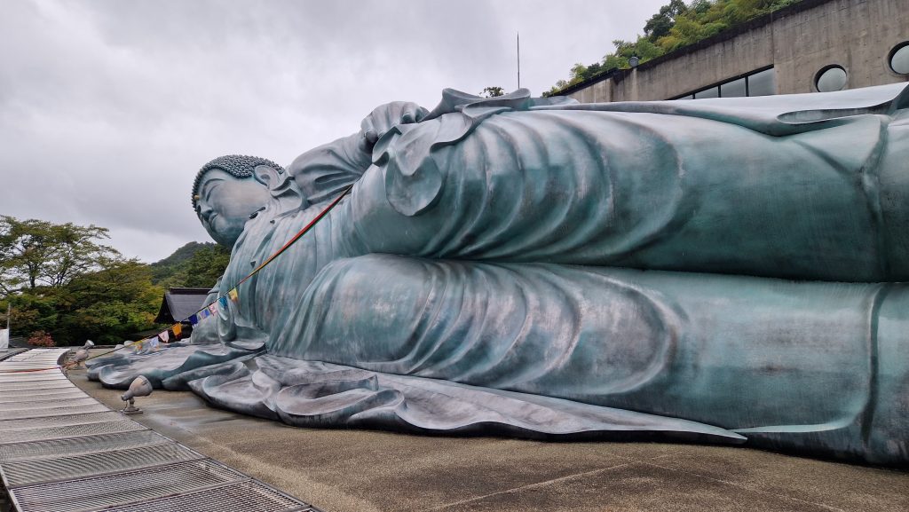 Immer noch angeschlagen, aber zumindest wach erkunden wir am nächsten Tag die Stadt. Zuerst fahren wir an den Stadtrand zum Nanzoin Tempel. Er liegt an einem tropisch bewachsenen Hang. Bei dem Nieselregen sehen die moosbewachsenen Laternen und Statuen besonders hübsch aus. Es gibt viele winzige Teiche mit Kois und Schildkröten. Die Hauptattraktion ist der gigantische liegende Buddha, den die Mönche hier gebaut haben. Leider ist er gerade teilweise eingerüstet. Die Dimensionen sind trotzdem beeindruckend. Anschließend geht es zum Ohori Park, wo Patrick mich überredet ihn in einem Schwanentretboot über den See zu fahren. Danach gehen wir zu Fuß am Ufer entlang und über die mit Brücken verbundenen Inseln. Von hier aus ist es nicht mehr weit bis zum Strand (wohl künstlich aufgeschüttet), den wir bei diesem Wetter für uns alleine haben. Noch besser sieht man ihn von oben, von der Aussichtsplattform des Fukuoka Tower. Die Stadt ist für eines besonders bekannt: Yatai, kleine Stände, die Streetfood verkaufen. Was in Südostasien gang und gäbe ist, ist in Japan eine Seltenheit – außer eben in Fukuoka. Wir bestellen Yakitori (gegrillte Fleischspieße), Gyoza (gefüllte Teigtaschen) und Oden (Suppe, bei der man die Einlage stückweise auswählt). Später am Abend laufen wir noch am Ufer des Naka Flusses entlang. Hier stehen die bekanntesten Yatai. Es ist voll und die Atmosphäre sehr touristisch, wir sind froh zuvor einen anderen Stand gewählt zu haben.