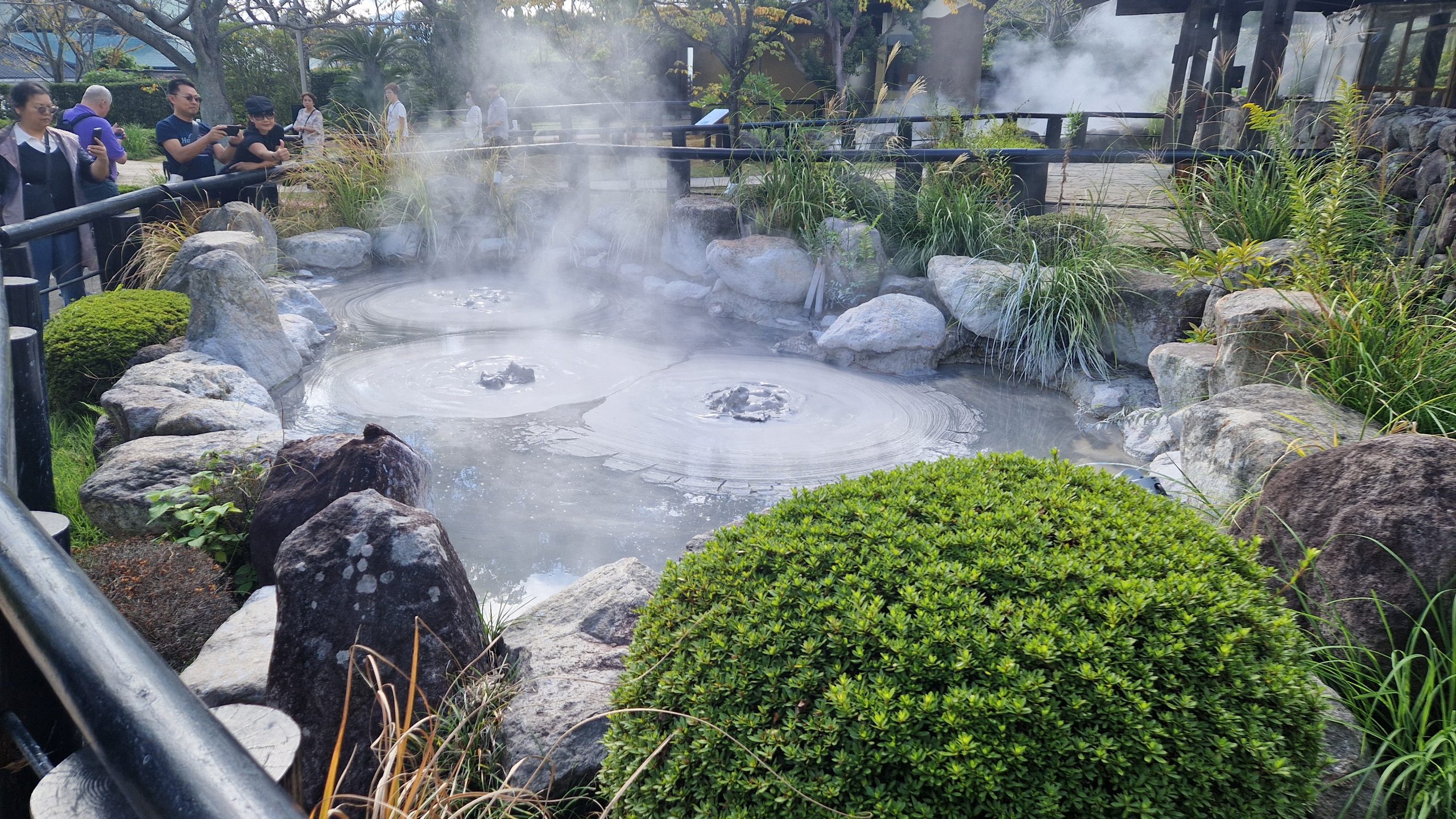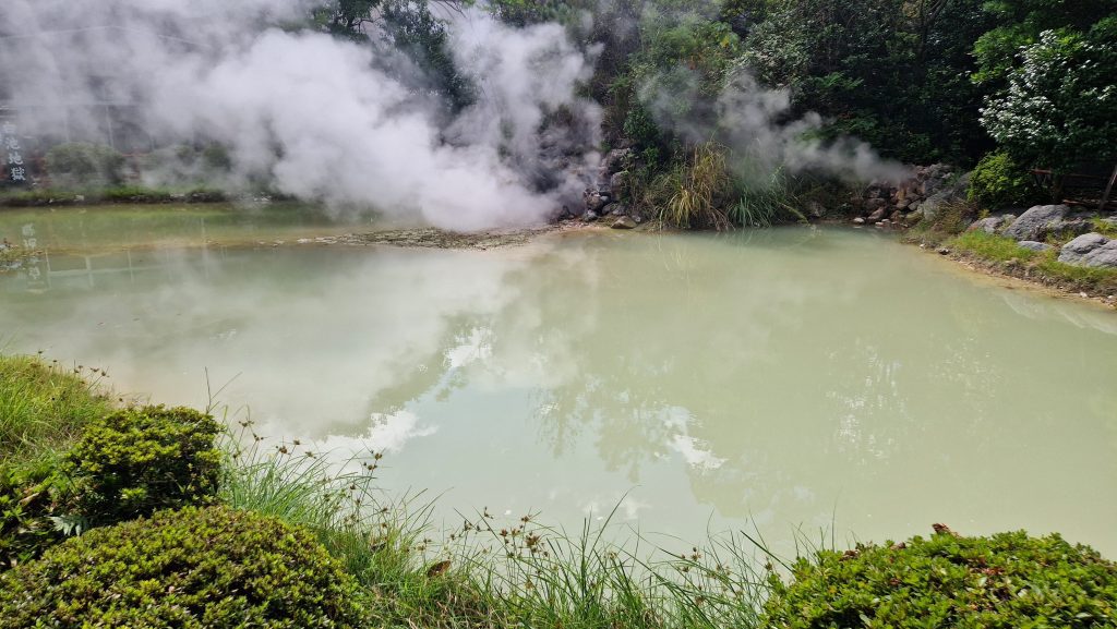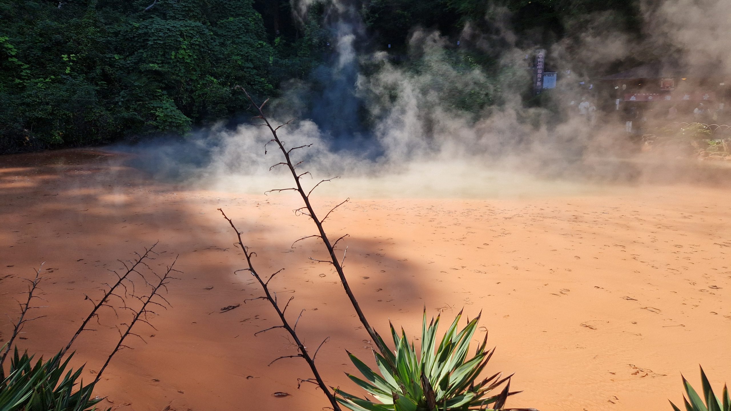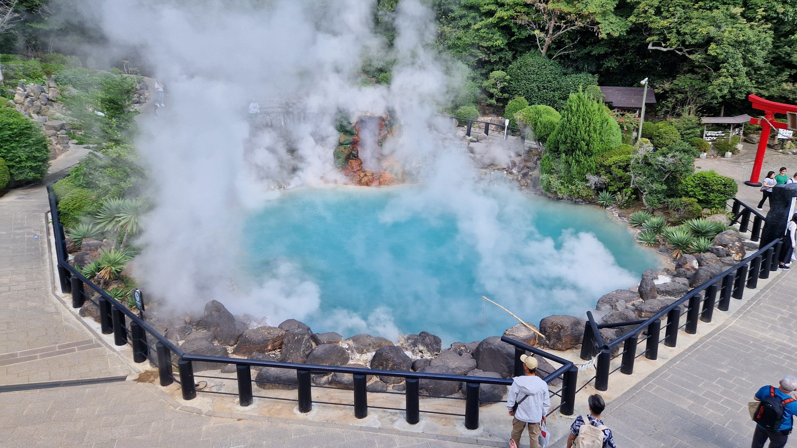 Beppu an sich ist nicht besonders hübsch. Hierher kommt man wegen der Onsen (Thermalwasserbäder). Da unser Hotel über ein eigenes Onsen verfügt, verzichten wir auf den Besuch in einem öffentlichen Bad. Stattdessen sehen wir uns die zweitbekannteste Attraktion an, die auch mit Thermalwasser zu tun hat. Es gibt eine Reihe von Quellen, die Jigoku genannt werden. Das bedeutet wohl so etwas wie „Hölle“. Der Name ist nicht ganz abwegig, denn die teils farbigen Wasserquellen haben Temperaturen zwischen 75 und 99 Grad. Sie befinden sich im Norden der Stadt, recht weit oben am Berg. Die erste Hölle, die wir anschauen, ist keine Quelle im eigentlichen Sinn, sondern eine Ansammlung von heißen Schlammlöchern. Die bei den Touristen Beliebteste ist Umi Jigoku, die in fotogenem Blau erstrahlt und von einem hübschen Park umgeben ist. Die optisch weniger ansprechenden Quellen locken Besucher mit exotischen Tieren oder im Wasserloch gegarten Eiern. Noch etwas weiter oben am Berg befindet sich eine Quelle mit roten Eisenoxid Ablagerungen und daneben ein kleiner Geysir. Die Besichtigungen haben länger gedauert, als gedacht und es ist sehr heiß heute, wir sind erschöpft. Vielleicht ist Patrick deswegen der Meinung, die letzten beiden Jigoku hätten sich nicht gelohnt. Am Abend fahren wir noch auf den Global Tower, dessen Aussichtsplattform wir ganz für uns alleine haben.