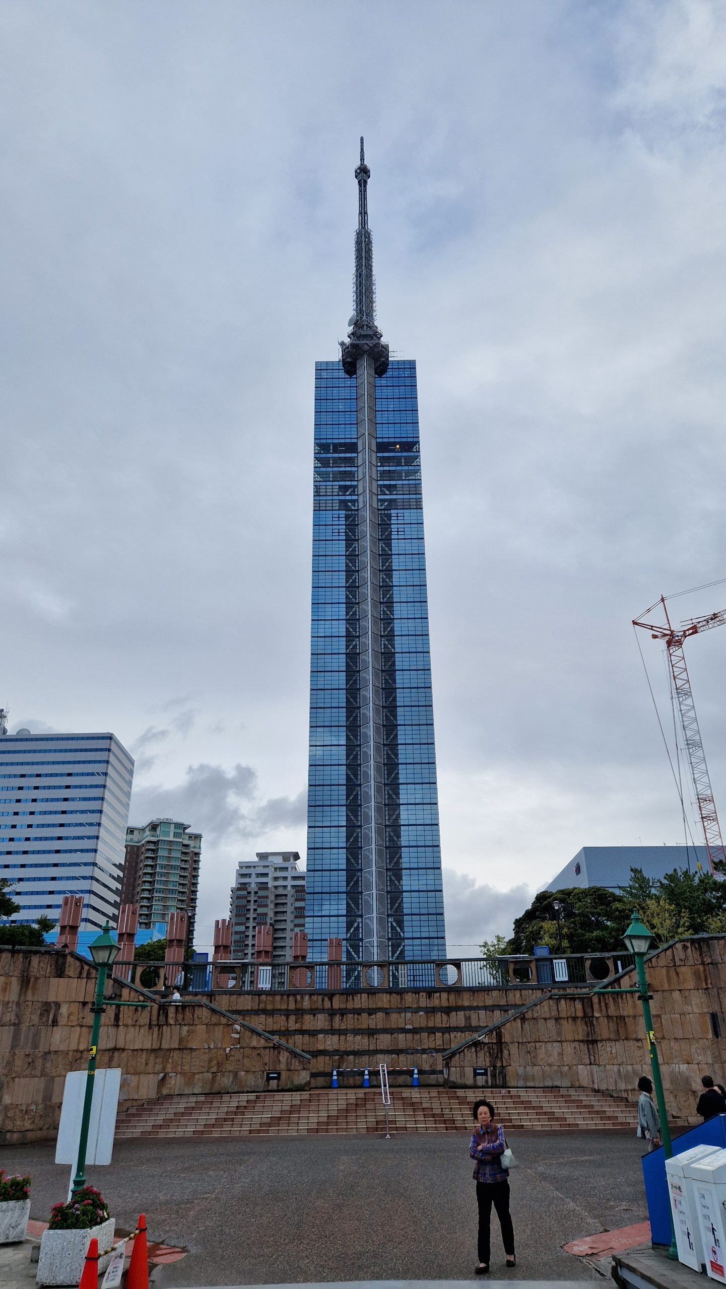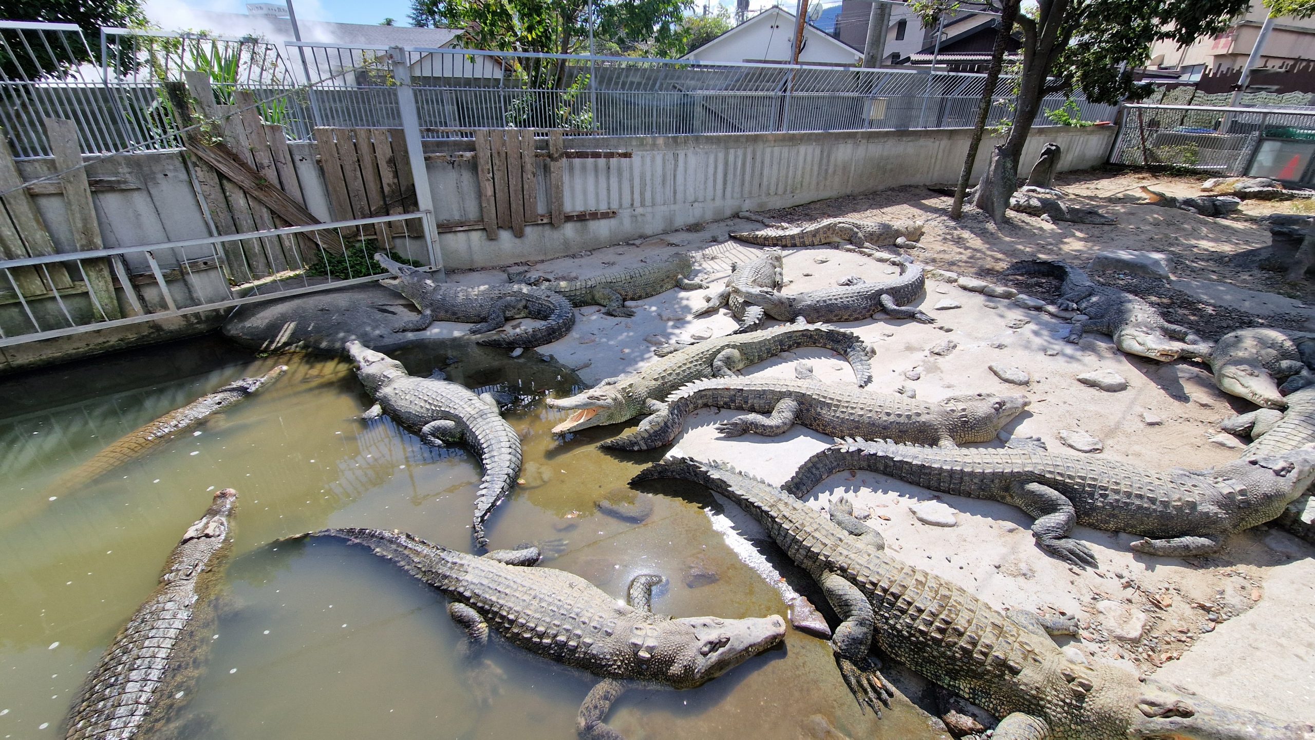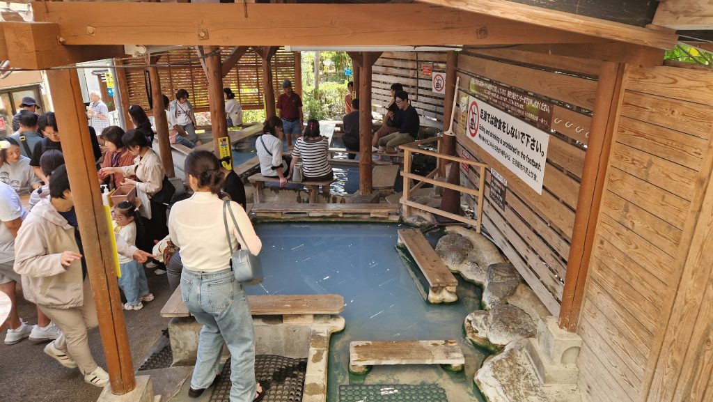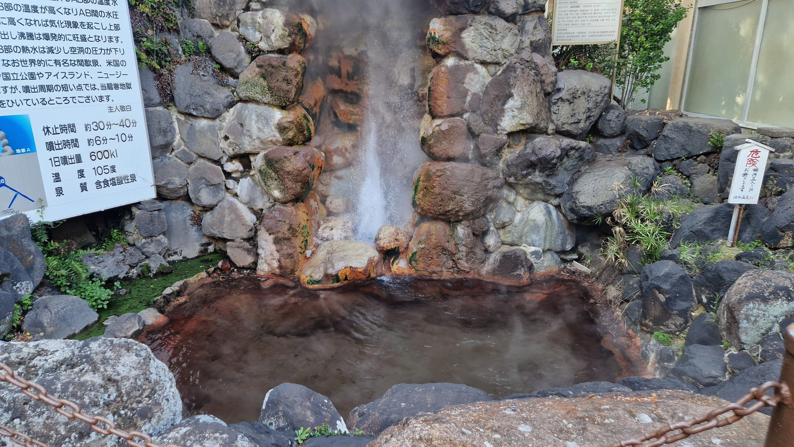 Beppu an sich ist nicht besonders hübsch. Hierher kommt man wegen der Onsen (Thermalwasserbäder). Da unser Hotel über ein eigenes Onsen verfügt, verzichten wir auf den Besuch in einem öffentlichen Bad. Stattdessen sehen wir uns die zweitbekannteste Attraktion an, die auch mit Thermalwasser zu tun hat. Es gibt eine Reihe von Quellen, die Jigoku genannt werden. Das bedeutet wohl so etwas wie „Hölle“. Der Name ist nicht ganz abwegig, denn die teils farbigen Wasserquellen haben Temperaturen zwischen 75 und 99 Grad. Sie befinden sich im Norden der Stadt, recht weit oben am Berg. Die erste Hölle, die wir anschauen, ist keine Quelle im eigentlichen Sinn, sondern eine Ansammlung von heißen Schlammlöchern. Die bei den Touristen Beliebteste ist Umi Jigoku, die in fotogenem Blau erstrahlt und von einem hübschen Park umgeben ist. Die optisch weniger ansprechenden Quellen locken Besucher mit exotischen Tieren oder im Wasserloch gegarten Eiern. Noch etwas weiter oben am Berg befindet sich eine Quelle mit roten Eisenoxid Ablagerungen und daneben ein kleiner Geysir. Die Besichtigungen haben länger gedauert, als gedacht und es ist sehr heiß heute, wir sind erschöpft. Vielleicht ist Patrick deswegen der Meinung, die letzten beiden Jigoku hätten sich nicht gelohnt. Am Abend fahren wir noch auf den Global Tower, dessen Aussichtsplattform wir ganz für uns alleine haben.