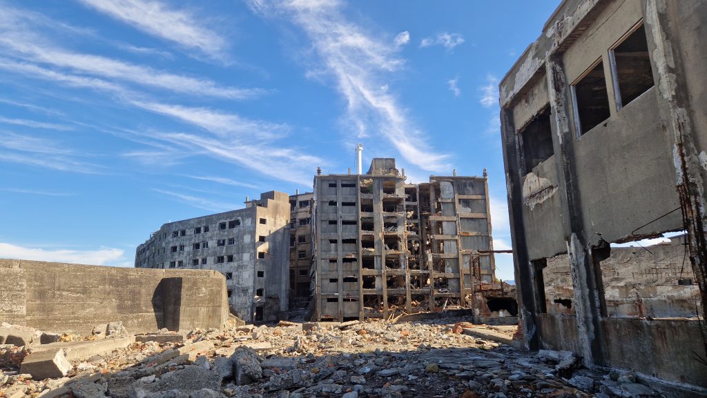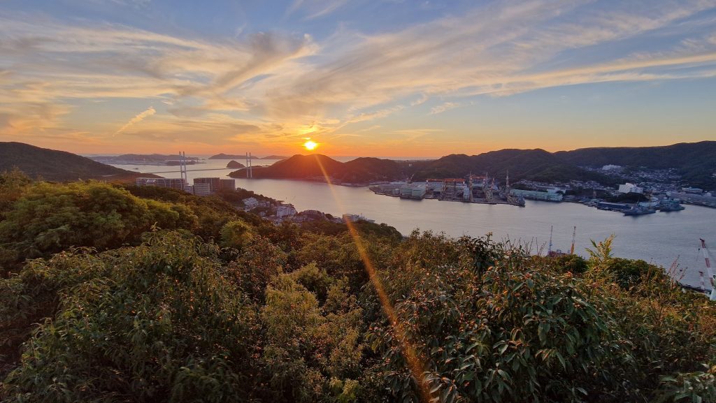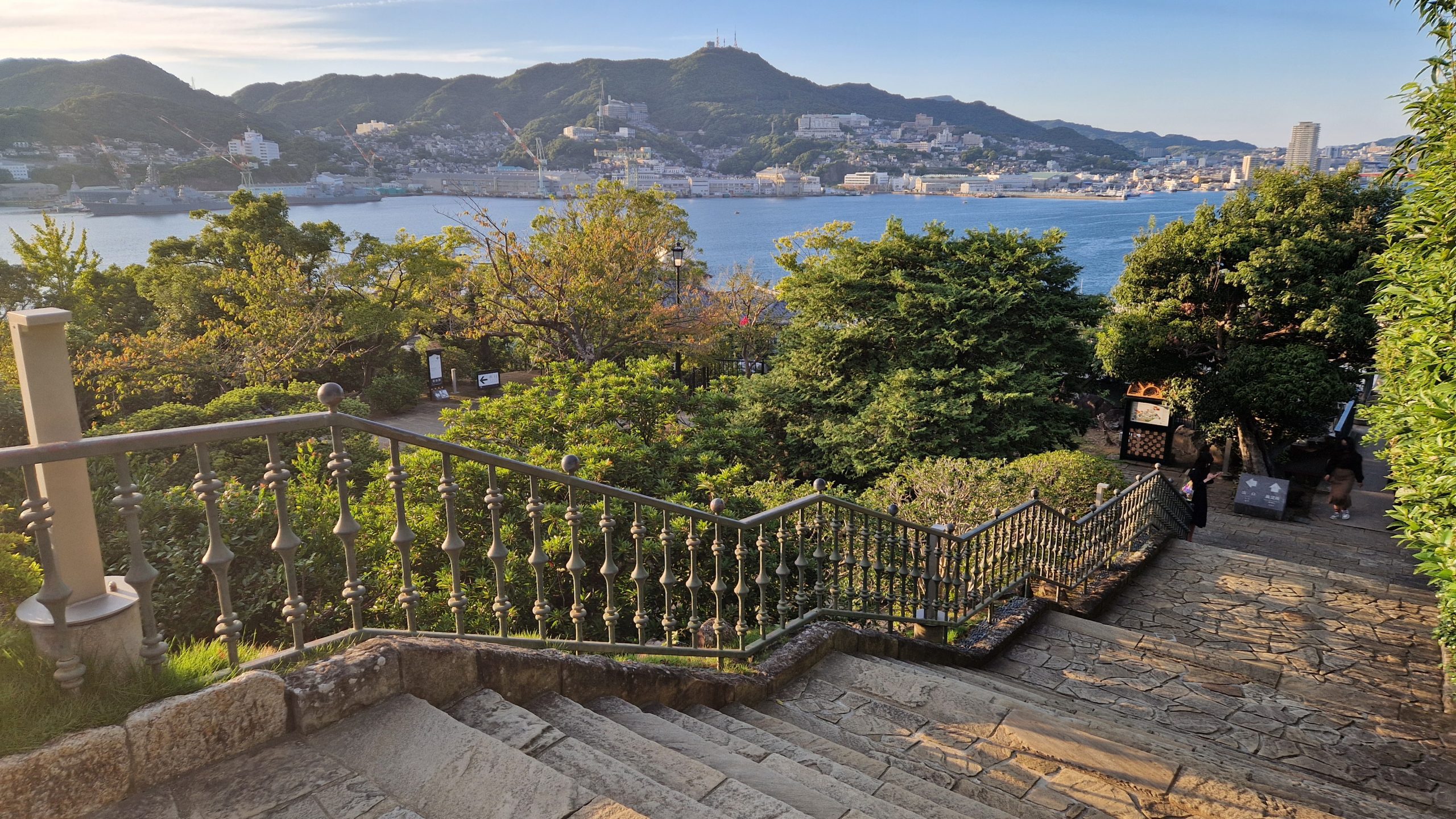Früh am nächsten morgen gehen wir zum Fähranleger. Wir haben eine Tour zur Insel Hashima gebucht. Sie ist auch als „Battleship Island“ oder Gunkanjima bekannt. Wir hatten erwartet, dass die Führung nur japanisch sein würde und wir nur Fotos machen können, aber nichts verstehen würden. Umso größer die Freude, dass es doch einen englischen Guide gibt. Sogar in doppelter Hinsicht gut, denn während nur ungefähr ein Dutzend ausländische Besucher da sind, besteht die japanische Gruppe aus gefühlt 50 Leuten. Hashima gehörte der Firma Mitsubishi und war bis in die 70er Jahre eine Kohlemiene. Ein Schacht führte mehrere hundert Meter nach unten, wo sich unter dem Meeresgrund eine riesige Abbaufläche befand. Die eigentlich kleine, felsige Insel wurde wiederholt künstlich erweitert, um Platz für die Arbeiter und ihre Familien zu schaffen. Am Ende war sie dreimal so groß wie ursprünglich. Hier entstanden die ersten Stahlbeton-Hochäuser in Japan. Jetzt ist alles verrostet und die Häuser beginnen einzustürzen. Die meterhohe Befestigungsmauer (gegen die hohen Wellen bei Taifunen) trägt maßgeblich zum Erscheinungsbild „Battleship“ bei. Nachmittags sehen wir uns Dejima an. Im 17. Jahrhundert wurde sie als künstliche Insel aufgeschüttet. Dies war der einzige Ort, an dem ausländische Händler, im ansonsten abgeriegelten Japan, gedultet wurden. Heute ist Dejima von der modernen Stadt umgeben und dient als Museum. Alte Wohnhäuser und Lagerräume wurden restauriert bzw. nachgebaut. Die Beschriftungen sind zu ausführlich, um sie alle lesen zu können. Wir laufen weiter nach Glover Garden. In diesem Open-Air-Museum stehen die Häuser einiger europäischer Handelsleute aus dem 19. Jahrhundert. Sie vereinen japanische und deutlich westliche Architektur und wurden teils extra an diesem Ort wieder aufgebaut. Der Park am Hang ist ein bisschen kitschig (aus Lautsprechern tönt altmodische Musik und man kann Kostüme ausleihen), aber trotzdem ein schönes Ausflugsziel. Der Blick über die Bucht von Nagasaki ist traumhaft. Wir laufen hinter dem Park sogar noch ein bisschen höher hinauf und genießen von hieraus den Sonnenuntergang.