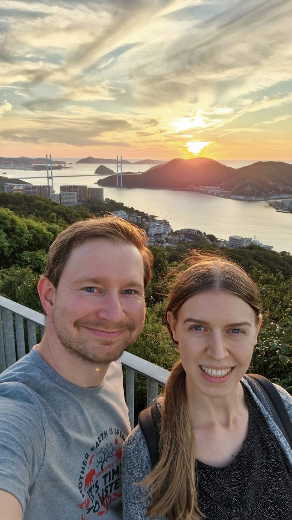 Wir haben lange überlegt, wo wir unsere Flitterwochen verbringen möchten und dann sehr spontan entschieden, dass es nochmal nach Japan gehen soll. Nochmal, weil wir letzten Herbst schon dort waren (davon gibt es keinen Blogeintrag – sorry). Nach einem 13 Stunden Flug landen wir in Osaka. Patrick ist noch ziemlich erkältet und dementsprechend mitgenommen von der langen Zeit im kalten Flugzeug. Ich habe schmerzende Augen vom vielen Bildschirmgestarre (schlafen ging nicht, ich war überhaupt nicht müde, die Landung war um Mitternacht deutscher Zeit). Da wir bei der letzten Reise die bekannten, zentralgelegenen Städte auf Honshu schon gesehen haben, möchten wir jetzt eine der anderen Inseln besuchen. Es geht nach Kyushu im Südwesten.