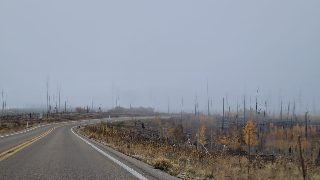 Wir besuchen das North Rim, die nördliche Abbruchkante des Canyons. Es liegt höher als die Südseite, ist viel weniger touristisch und im Winter nicht zugänglich. Ab dem ersten Schneefall ist die Route 67 gesperrt. Jetzt zum Glück noch nicht, obwohl seit heute Visitor Center und Tickethäuschen geschlossen sind. Es ist dementsprechend einsam. In der Stunde von der letzten Abzweigung bis zum Parkplatz begegnet uns quasi kein anderes Auto. Die Straße führt durch von Bränden zerstörte Wälder, Wolken hängen über der Straße (wir befinden uns auf 2400m Höhe), die Atomsphäre ist irgendwie gespenstisch.