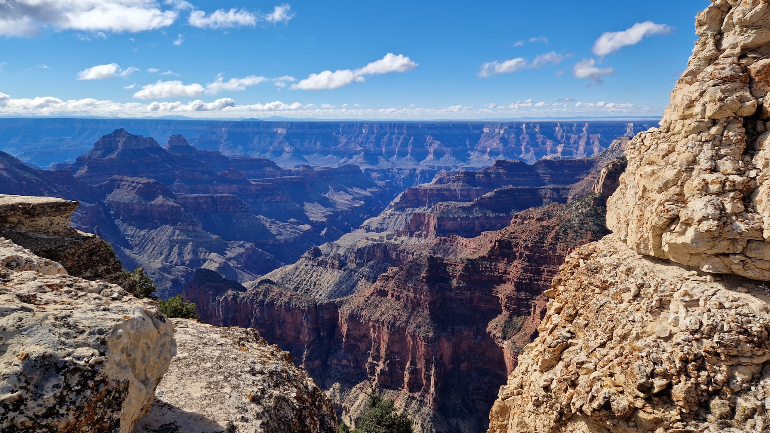 Der zweite Stopp ist der Bright Angel Point. Von hier führt ein kurzer Weg zu einem Aussichtspunkt. Das Panorama ist viel beeindruckender. In der Ferne ist das South Rim zu erkennen und auch den Verlauf des Hauptcanyons kann man erahnen, obwohl der Fluss von oben natürlich nicht zu sehen ist. Ganz in der Nähe ist der Startpunkt des Wanderwegs, der in die Tiefe führt. Die klassischen Grand Canyon Bilder, die man kennt, sind von innerhalb der Schlucht aufgenommen, diesen umwerfenden Ausblick haben wir natürlich nicht. Aber die unfassbare Größe dieses Naturwunders, die ist zu sehen. Und die vielen verschiedenfarbigen Steinschichten sind einfach wunderschön. Auch, wenn wir nur kurz bleiben und keine Wanderung unternehmen, hat sich der Ausflug auf jeden Fall gelohnt.
