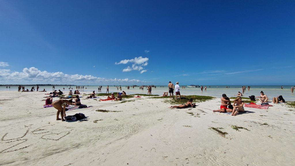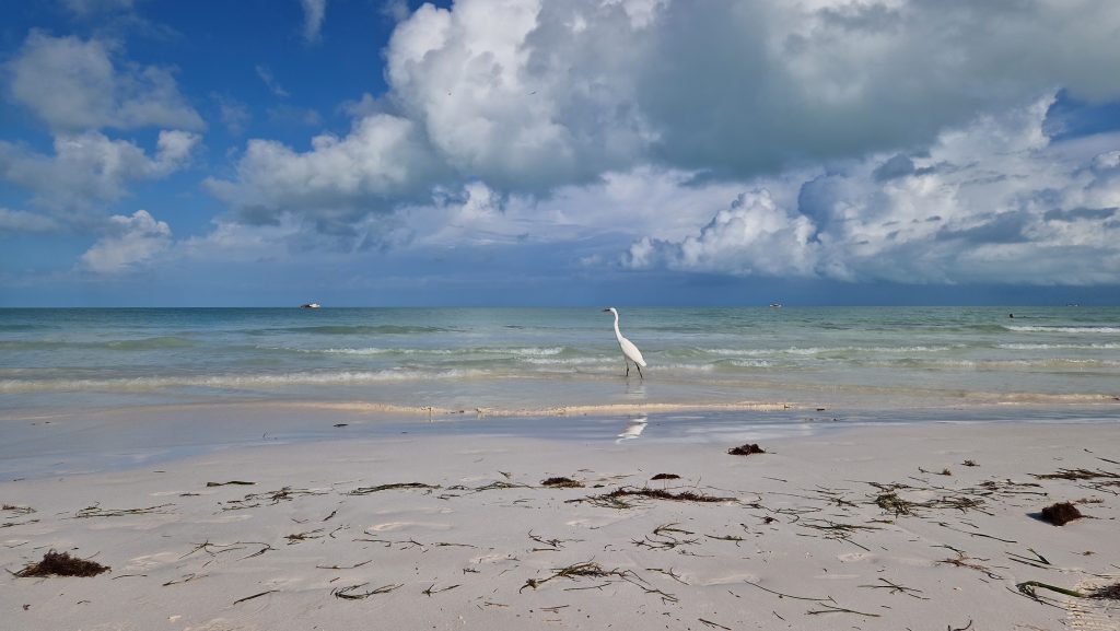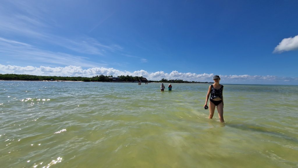 Der nächste Morgen sieht schon ganz anders aus. Es sind zwar noch immer dunkle Wolken am Himmel, aber sie verdecken die Sonne nicht und auch der Wind ist verschwunden. Jetzt sieht das Wasser blassgrün aus. Es ist so flach, man könnte hunderte Meter weit hinaus laufen. Wir beobachten die verschiedenen Vögel (unter anderem Reiher) und bewundern die vielen Muscheln am Strand.