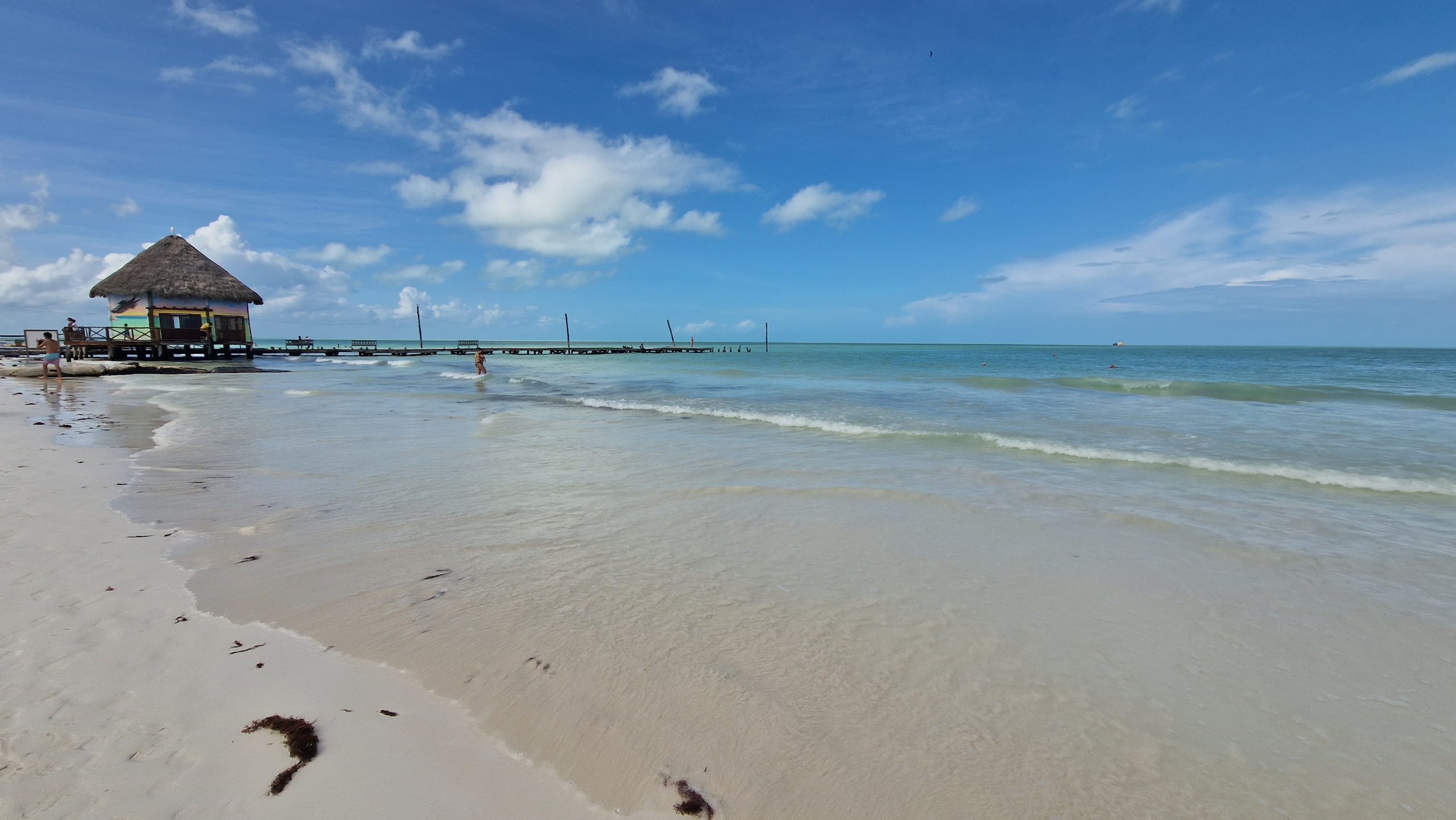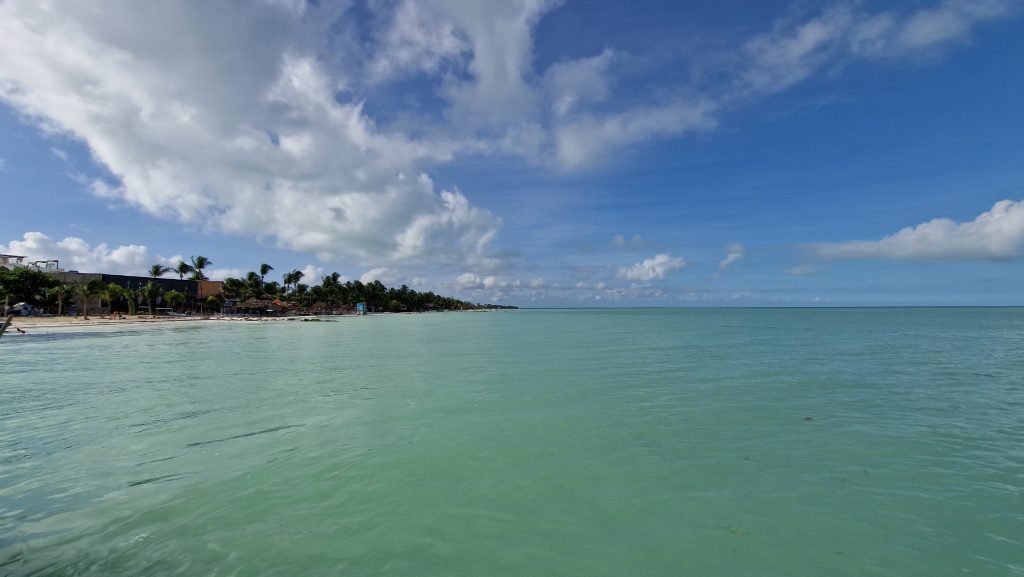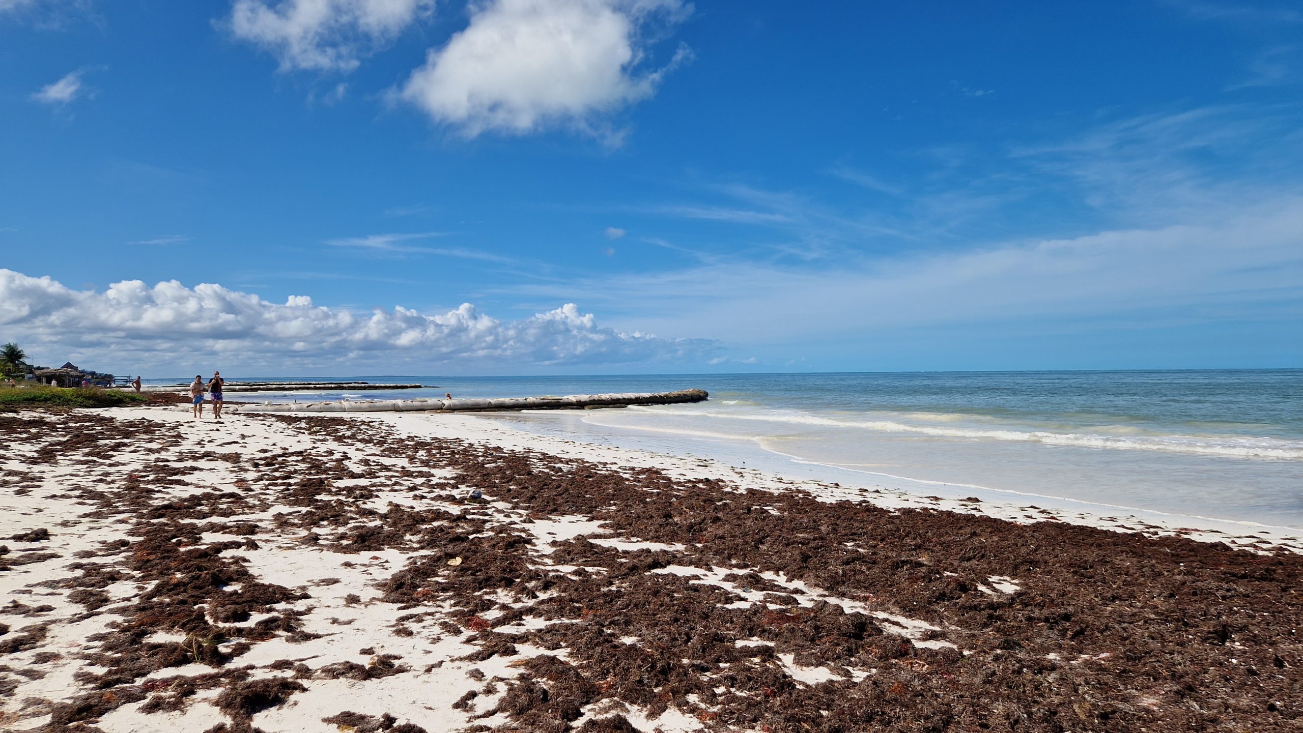 Wir können es gar nicht erwarten das Meer zu sehen, das gerade mal fünf Minuten entfernt liegt. Und dann bin ich doch ein bisschen enttäuscht. Nach dem Traumstrand von Cancún sieht hier alles ein kleines bisschen weniger perfekt aus. Der Sand ist fest verbacken, das Meer trüb und nicht wirklich blau, außerdem liegt viel Seetang herum. Allerdings ist es auch gerade bewölkt. Der Wind weht so stark, dass ich friere, obwohl es weit mehr als 20 Grad hat.