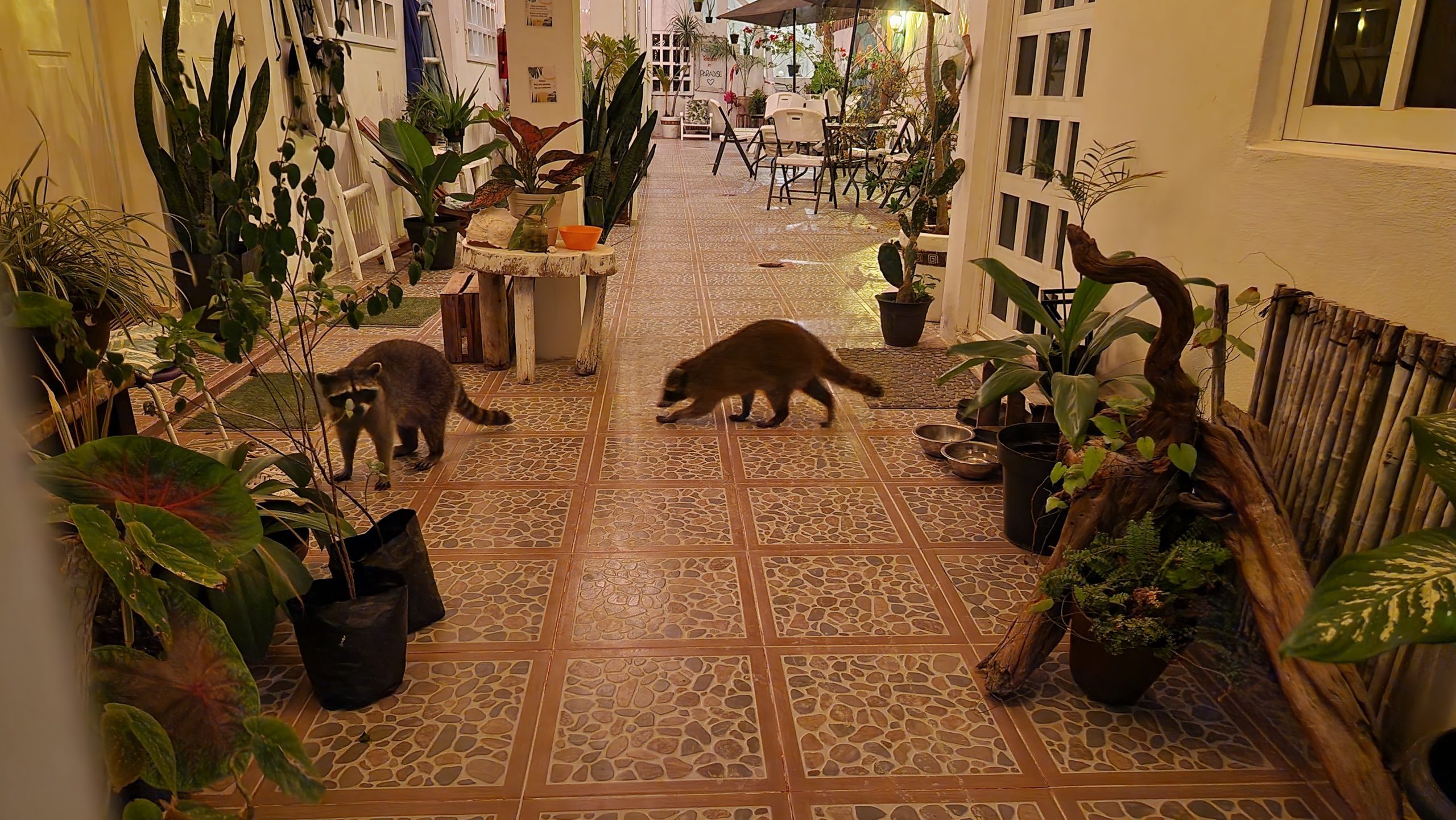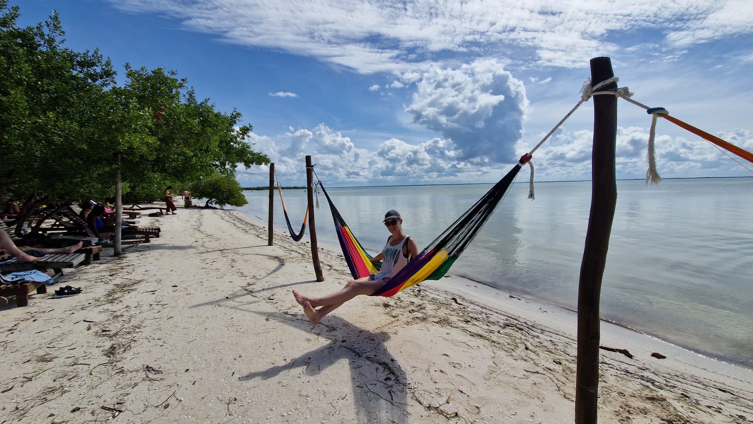 Das Paradies hat eine lange Anfahrt. Knapp zwei Stunden fährt man mit dem Bus von Cancún schnurgerade durch den Dschungel bis an die Küste in Chiquilá. Von dort bringt einen die Fährte in einer weiteren halben Stunde zum kleinen Hafen von Holbox. Eine ganze Reihe Golfkart-Taxis wartet schon. Die günstigen Unterkünfte sind aber alle in Laufweite, deswegen gehen wir zu Fuß. Unser Zimmer für die nächsten sieben Tage ist hübsch eingerichtet mit Topfpflanzen und Hängematte. Im buntbemalten Innenhof gibt es noch viel mehr Pflanzen und Lichterketten. Hier kann man es wirklich aushalten.