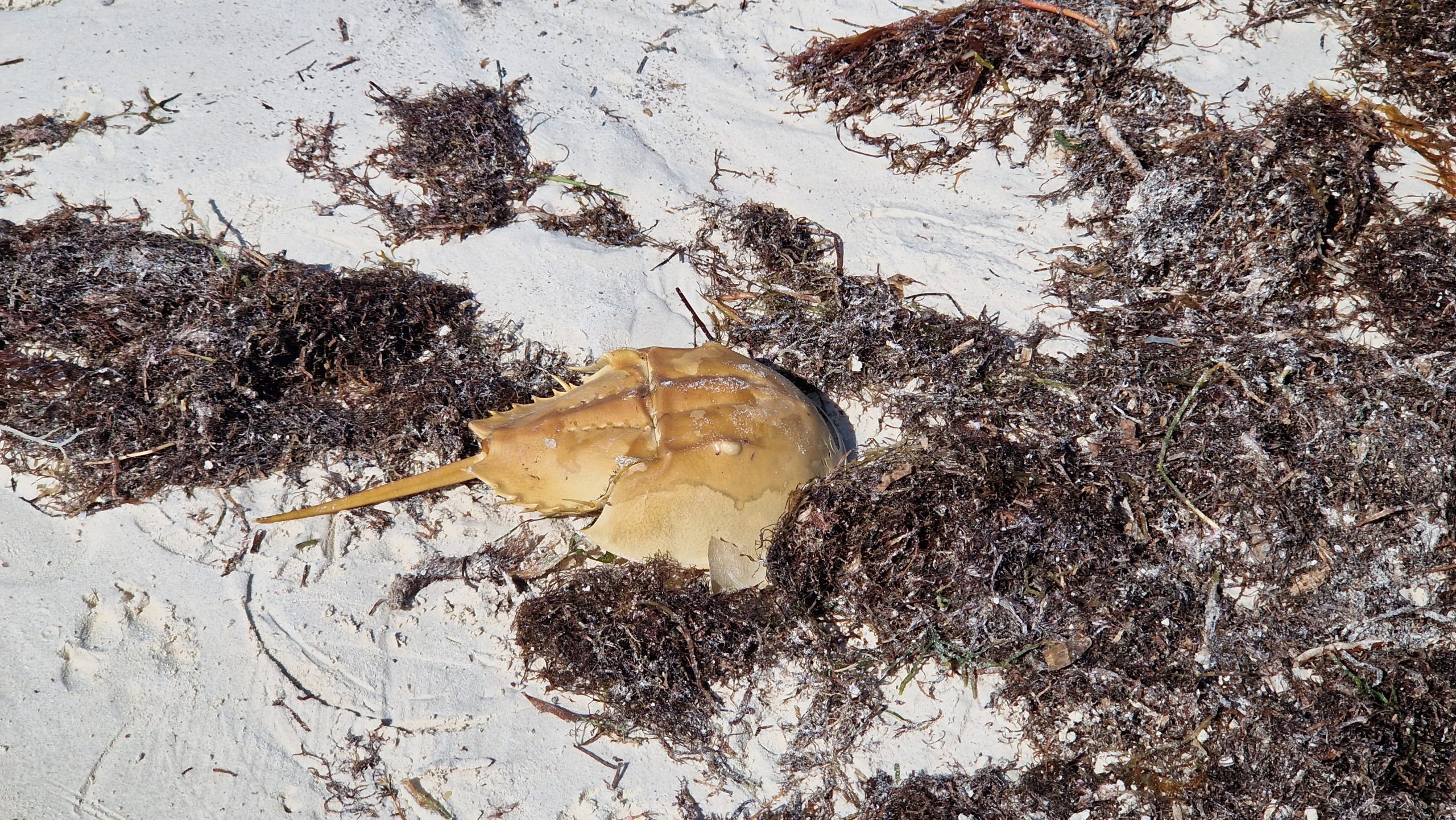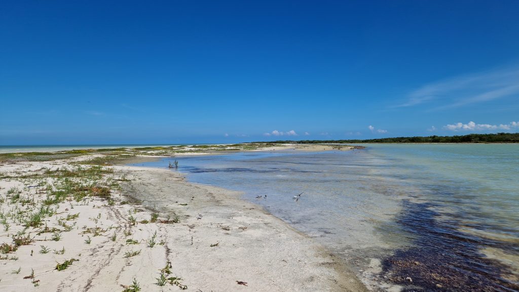 Holbox ist eine schmale, sehr langgestreckte Insel. Der größte Teil ist Naturschutzgebiet. Aber von der Stadt aus kann man zum Westende laufen. Wir nehmen den Weg am Strand entlang. Hier sind viel weniger Leute als im Zentrum und je weiter wir kommen, desto teurer sehen die Resorts aus. Es liegt tonnenweise Seetang herum, darin tote Pfeilschwanzkrebse, die ich bisher nur im Biologieunterricht gesehen habe. Als das Gebüsch am Wasser zu undurchdringlich wird, laufen wir auf den Straßen im Landesinneren weiter. Ein Fehler. Sie bestehen quasi nur aus Pfützen. Den ersten können wir noch ausweichen, aber auf den letzten Metern bleibt uns nichts anderes übrig, als durch das knöcheltiefe Schmutzwasser zu waten. An dem schmalen Strand hier merkt man den Übergang zur Mangrovenlandschaft. Das Meer ist noch flacher und trüber und es gibt überhaupt keine Wellen. Wir bleiben nur kurz und entscheiden uns auf dem Rückweg gegen die Pfützen und für den unwegsamen Strandabschnitt.