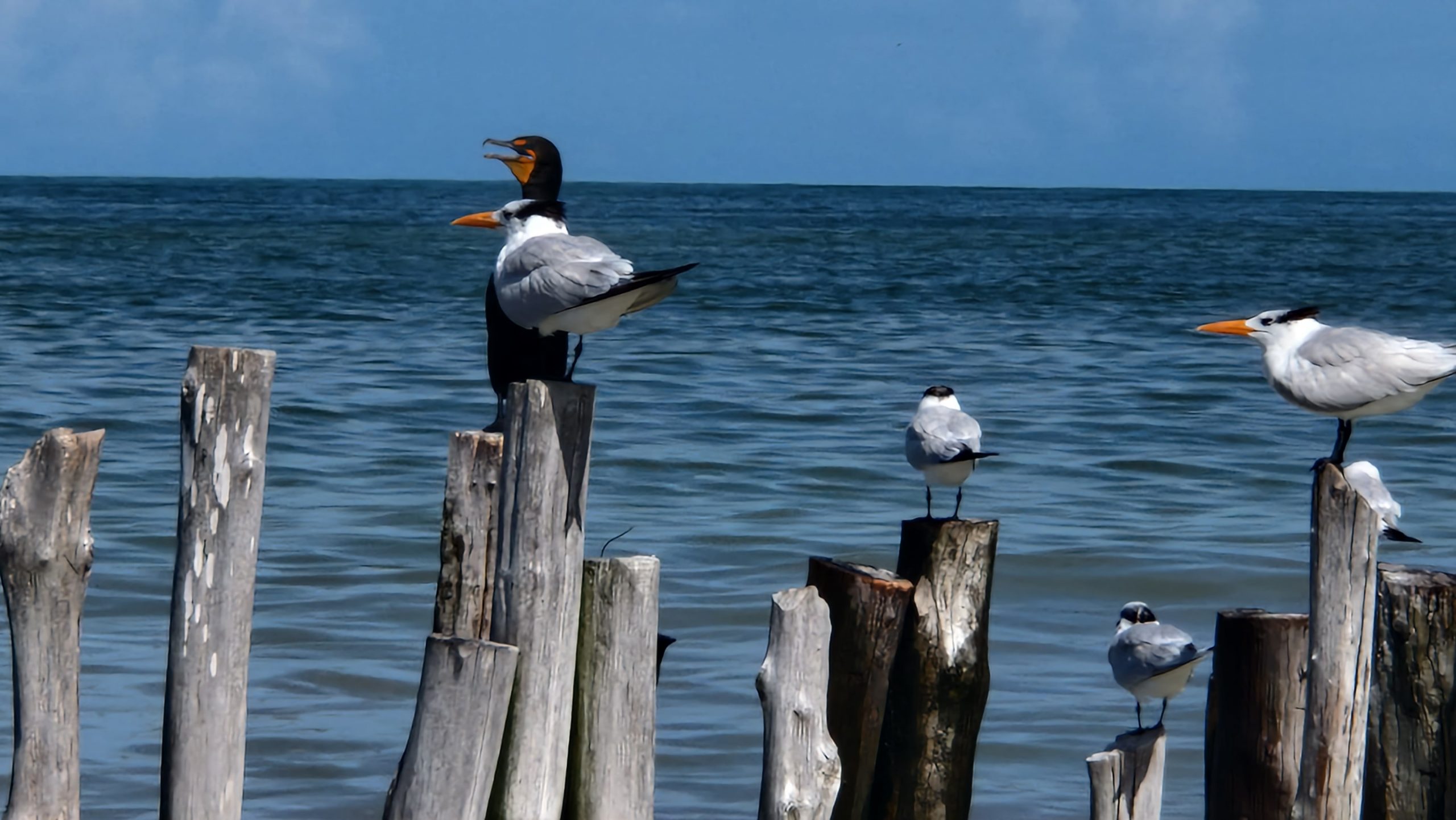 Am letzten Tag laufen wir zur Punta Mosquito, ohne genau zu wissen, was uns dort erwartet. Der Weg ist ungewöhnlich, denn er führt durchs Wasser. Eine Sandbank erstreckt sich knapp hundert Meter von Strand entfernt an der Küste entlang. Das Wasser ist meist knietief, nur an zwei oder drei Stellen wird man noch nasser. Es ist anstrengend gegen den Widerstand zu laufen, über ein Stunde brauchen wir. Ich bin ein bisschen angespannt, die Pflanzen im Wasser fühlen sich komisch an und angeblich gibt es Stachelrochen am Boden. Wir sehen tatsächlich Rochen, ob sie Stacheln haben weiß ich nicht, auch nicht, ob man versehenlich auf sie treten kann (schwimmen immer schnell weg). Jedenfalls ist das Wasser zu schmutzig um wirklich zu sehen, wohin man tritt. Nach der Hälte des Weges sehen wir das Ziel: Bestimmt zehn kleine Boote mit Touristen haben sich an einer Stelle versammelt. Dort wird das Wasser immer klarer und flacher, bis die Sandbank aus dem Wasser ragt. In die eine Richtung sieht man aufs offene Meer (hier ist es schön türkis), in die andere das Naturschutzgebiet und ganz weit entfernt sogar Flamingos.
