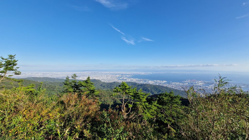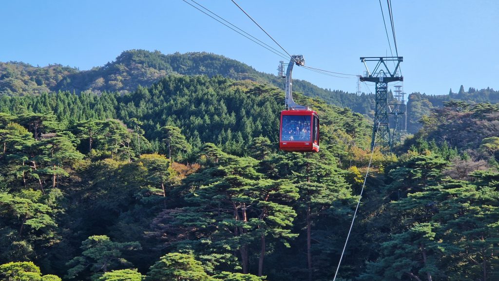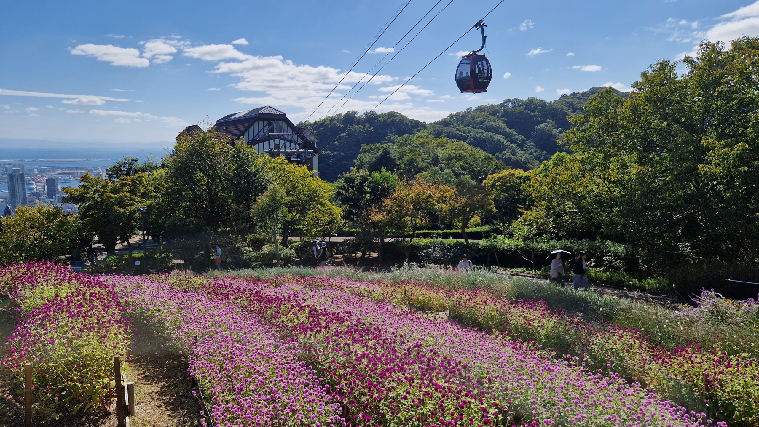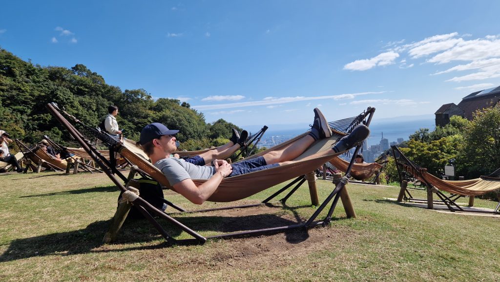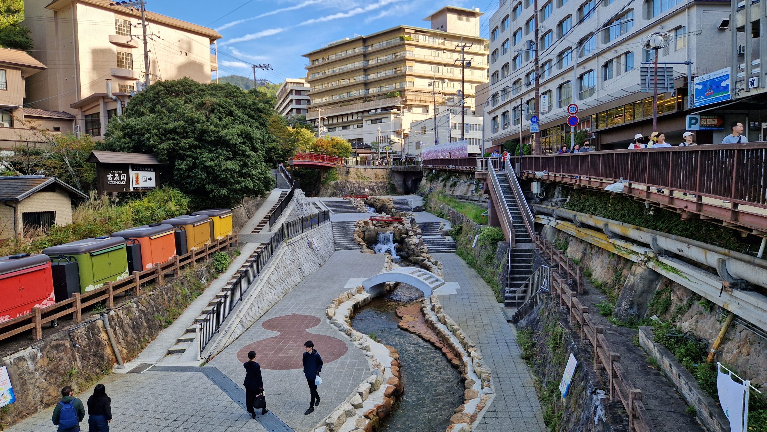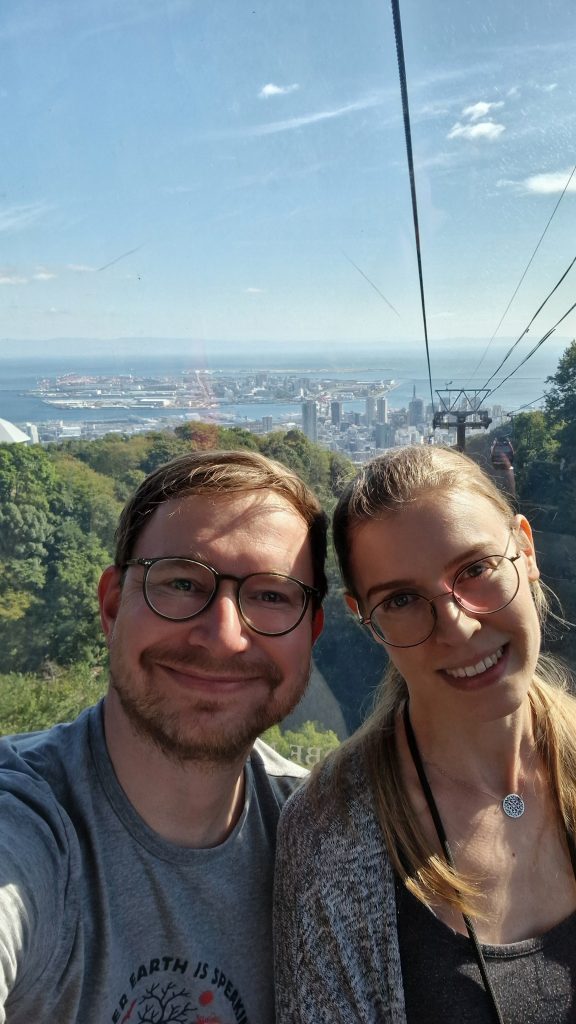 Da Arimaonsen auch ein beliebtes Ziel für Tagesausflügler ist, öffnen viele Läden erst um zehn oder elf Uhr, auch die, die Frühstück anbieten. Auf der Suche nach einem früher geöffneten laufen wir am Fluss entlang, über den sich hübsche kleine Brücken spannen. Am Nachmittag fahren wir mit einer Seilbahn auf den Berg Rokko. Schon die Aussicht von der Gondel aus ist beeindruckend. Dichter Wald erstreckt sich unter uns, alle paar hundert Meter ändern sich die vorherrschenden Baumarten. Oben angekommen wird die Sicht noch besser. Bei strahlendem Sonnenschein sehen wir große Teile der dicht bebauten Kansai-Region und der Bucht von Osaka. Auch an diesem Abend gehen wir in ein öffentliches Bad. Dieses wird von einer anderen Quelle gespeist. Das Wasser enthält Eisenoxid und ist entsprechend trüb und braun gefärbt.
