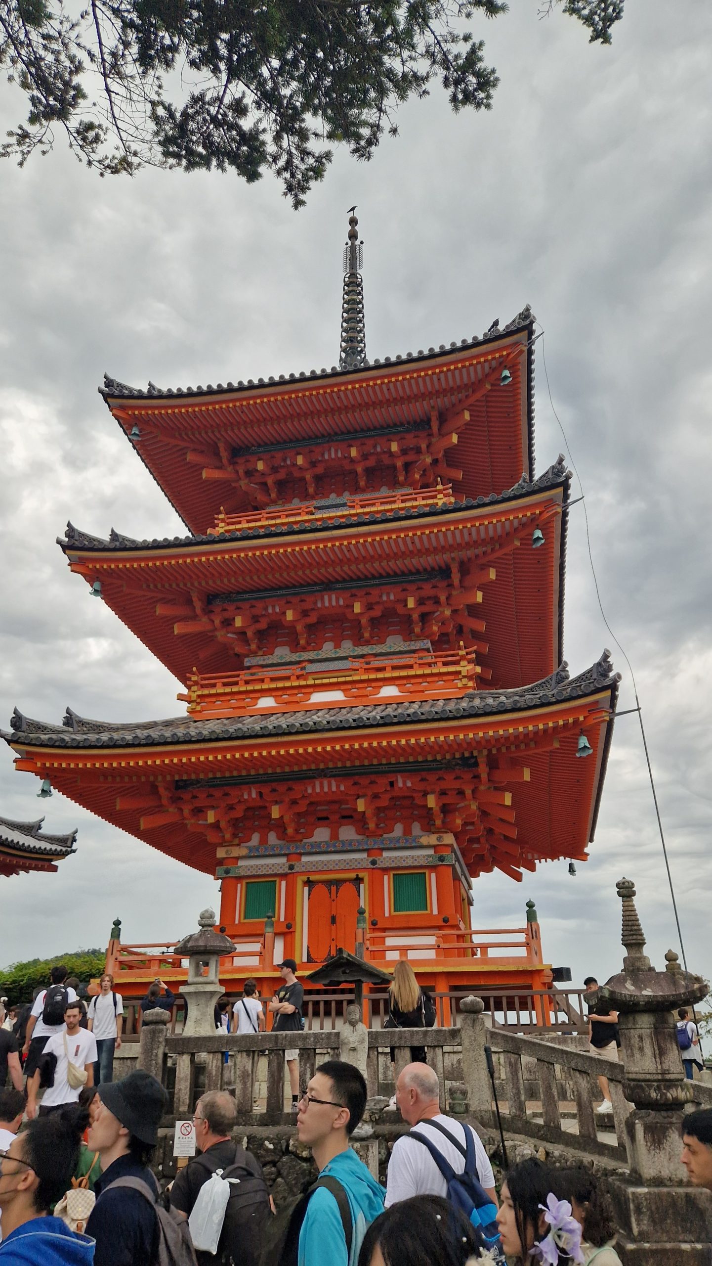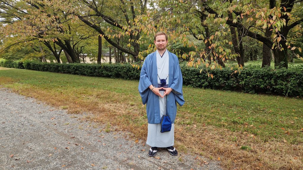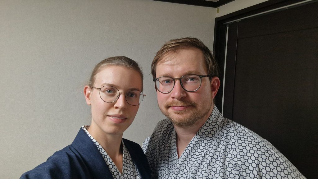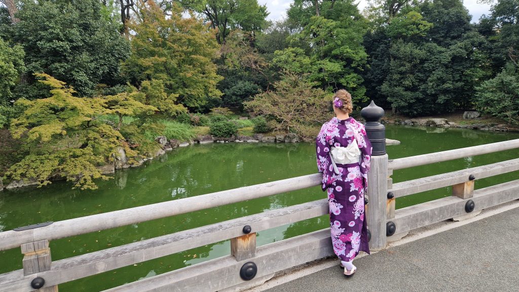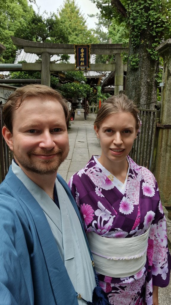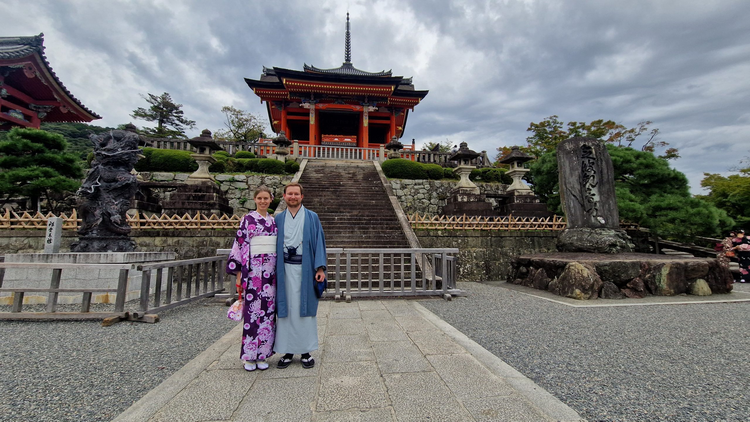 Direkt am nächsten Morgen fahren wir von Osaka ins nahegelegene Kyoto. Die Stadt ist für japanische Kultur bekannt, es gibt dort unzählige Tempel. Da wir im letzten Jahr schon einmal hier waren, sehen wir uns die bekannten Attraktionen nicht nochmal alle an. Wir sind hier, weil Patrick gerne Kimonos für uns ausleihen möchte (das ist hier sehr beliebt, es gibt viele Läden die Gewänder zum Verleih anbieten). Fertig angezogen (oder eher fest eingewickelt) fahren wir zum Nationalgarten. Hier machen wir Fotos im Grünen. Dann tun wir uns doch nochmal die Straße voller Souvenirläden an, die zum Kiyomizu-dera Tempel hoch führt. Das Eingangstor ist eine schöne Kulisse, den Eintritt zum Hauptgelände zahlen wir aber nicht (sonst wird es zu spät). Kurz vor Ende unserer Reise schaffen wir es auch endlich einmal Sushi essen zu gehen.