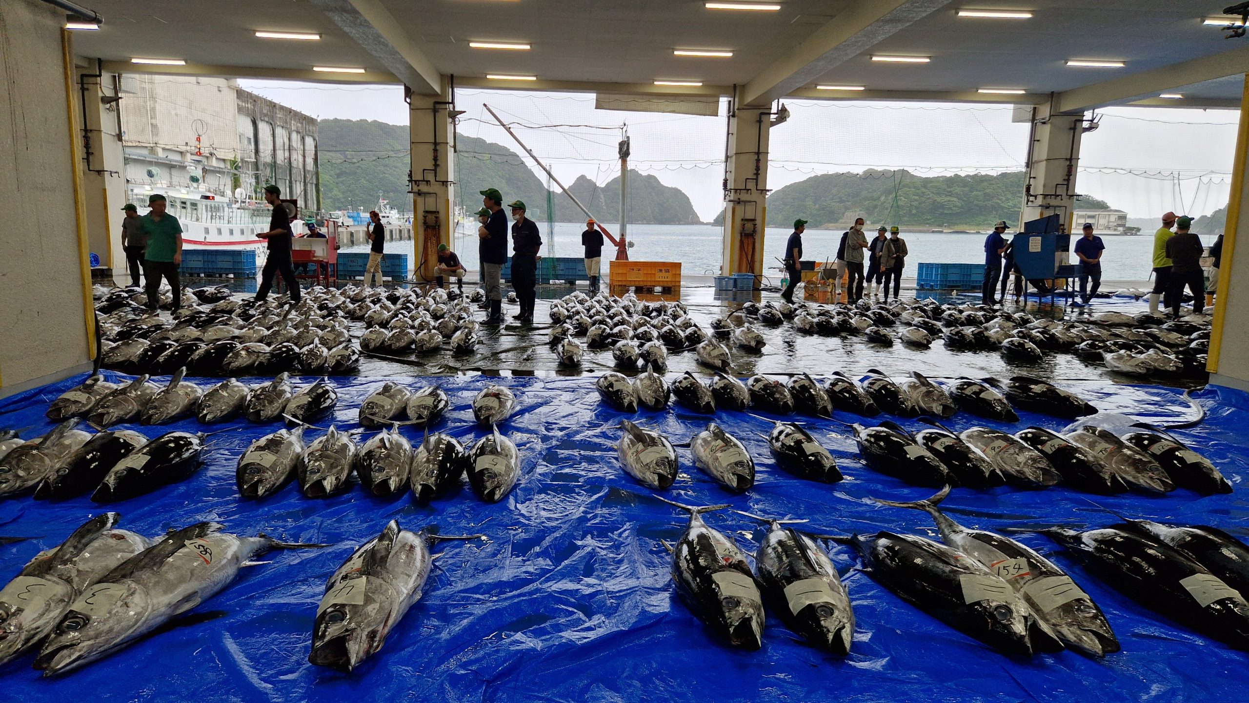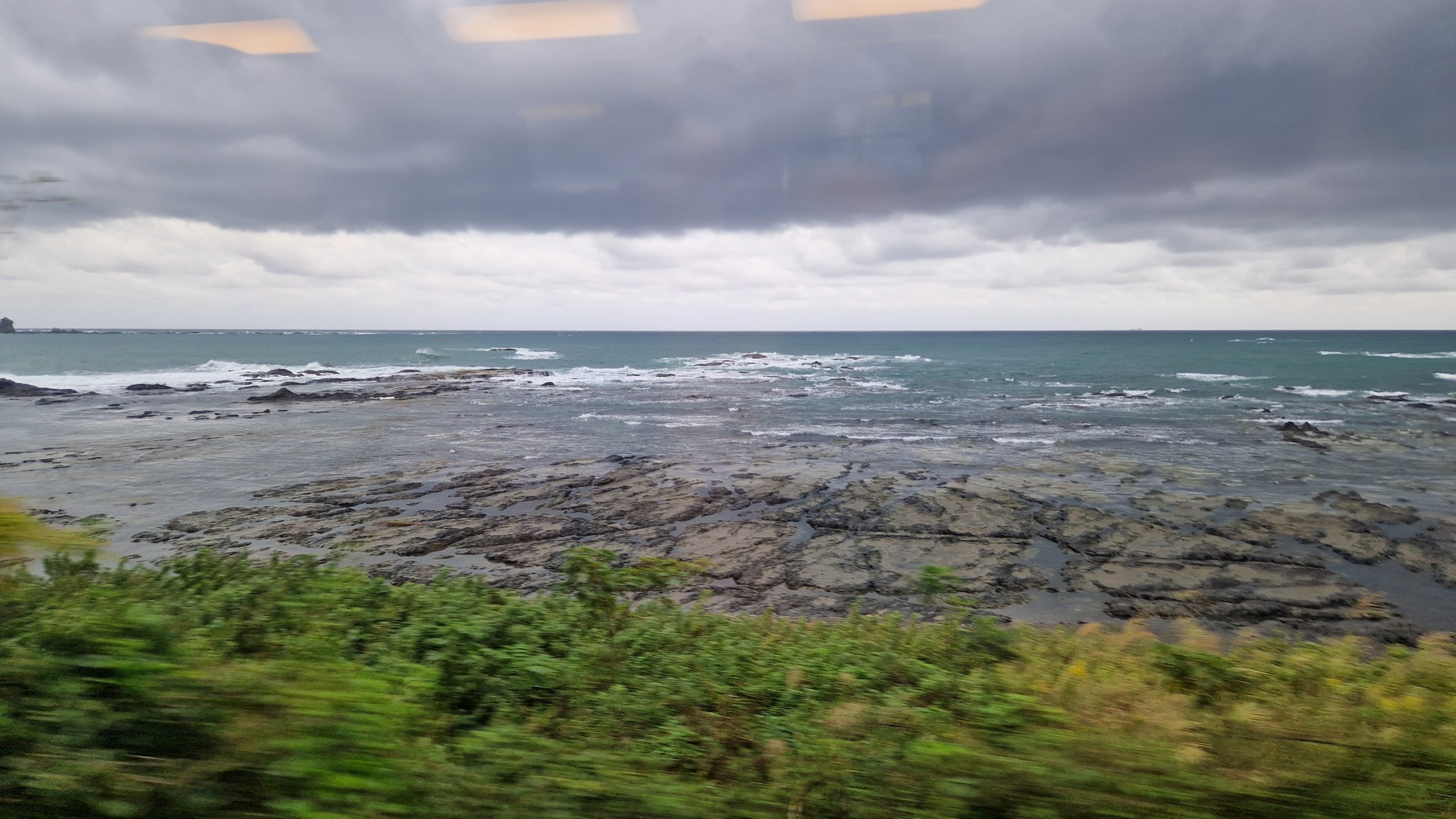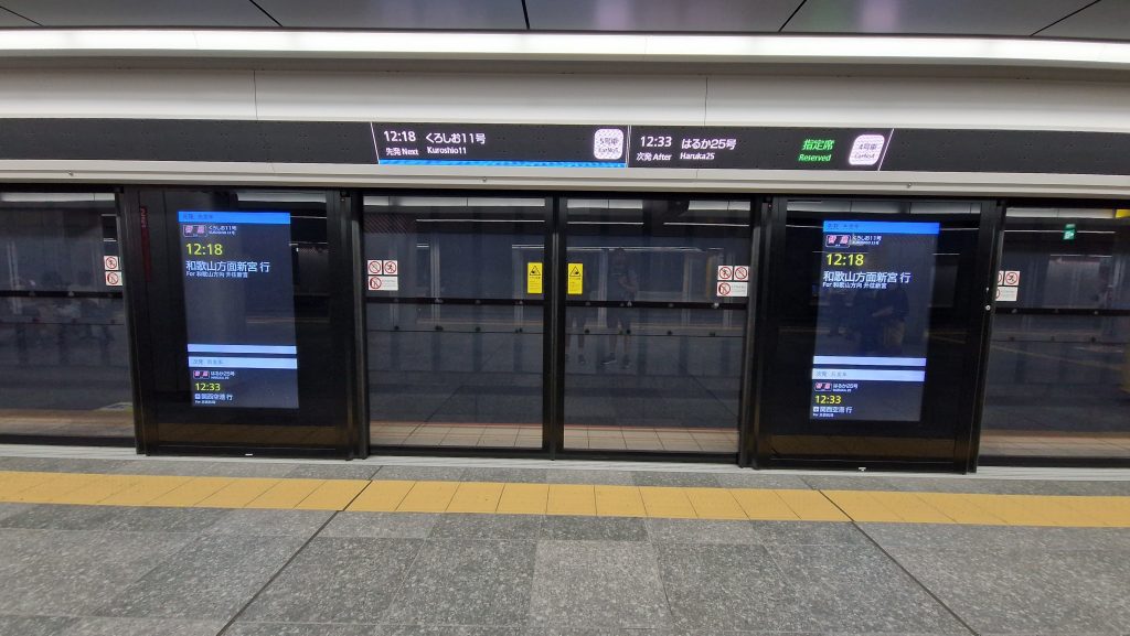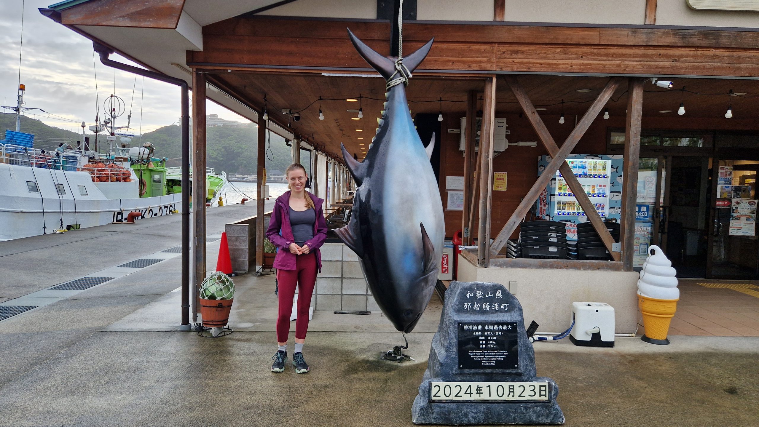 Der nächste Tag ist wenig ereignisreich. Mit Bus und Bahn fahren wir nach Osaka. Der dortige Bahnhof ist riesig und unübersichtlich. Wir müssen erst nach dem Weg fragen, um unser unterirdisches Gleis zu finden. Es ist hochmodern. Automatische Türen am Bahnsteig sind in Japan zwar nicht ungewöhnlich, aber hier sind sie in eine LED-Wand eingelassen. Diese zeigt Wagenreihung, Warnhinweise und Werbung an. Knapp vier weitere Stunden dauert unsere Fahrt nach Katsuura. Jeder Sitz im Zug ist mit einer Karte zur Verhaltensweise bei Tsunami-Warnung ausgestattet. Kein Wunder, denn der Zug fährt stellenweise nur wenige Meter vom Meeresufer entfernt. Der Ort lebt von der Fischerei, also gibt es Thunfisch zum Abendessen.