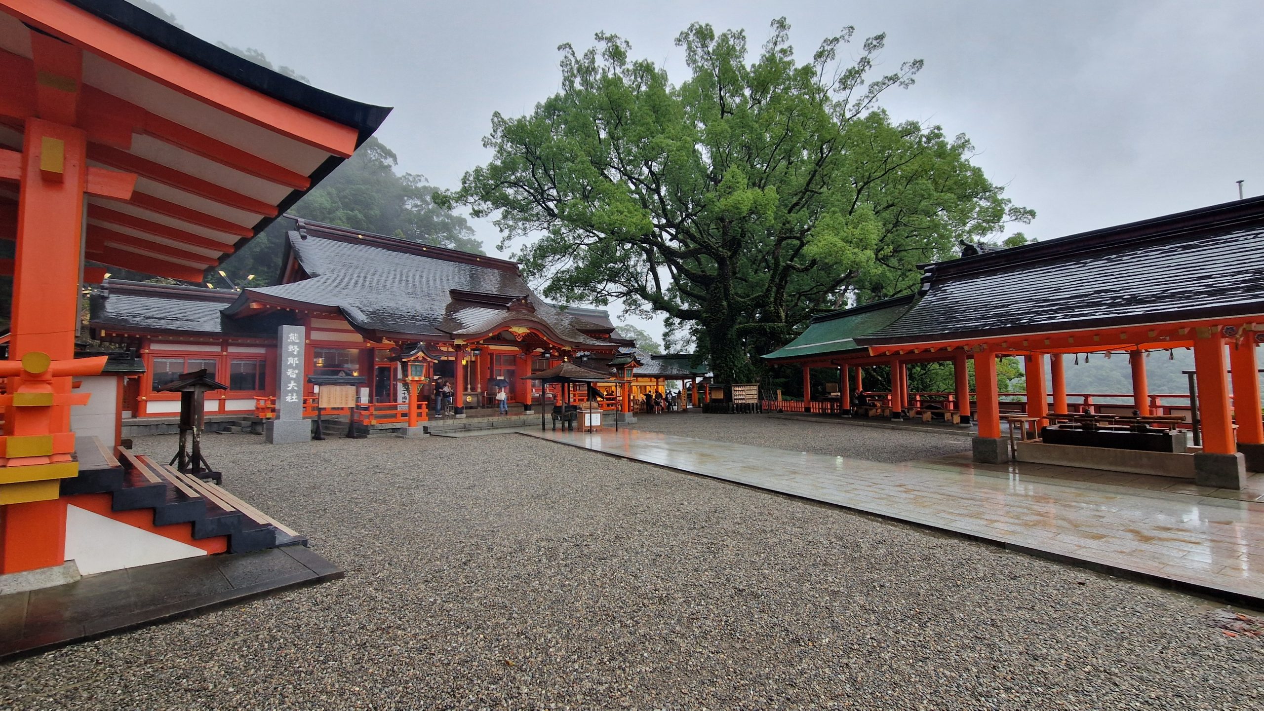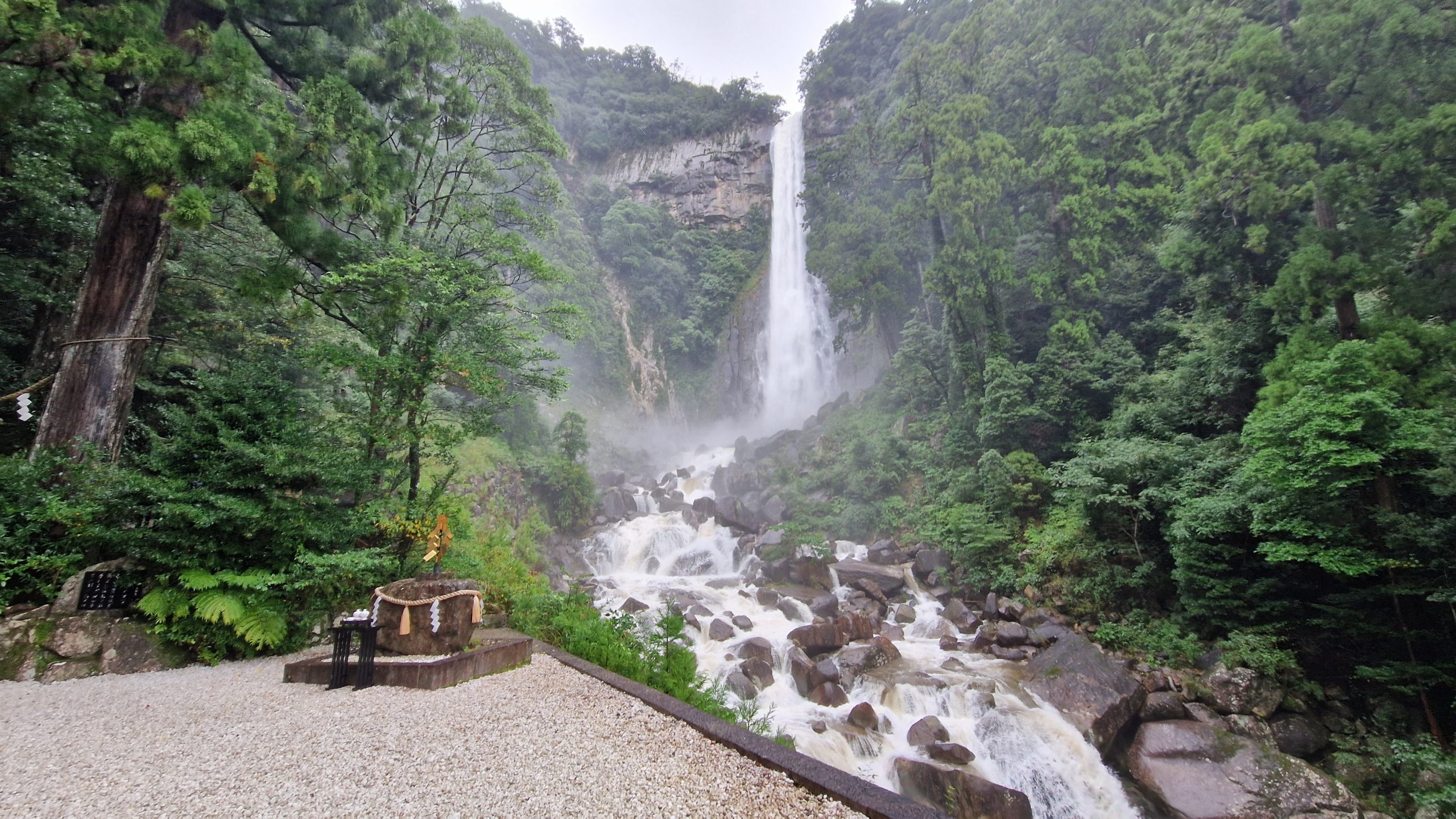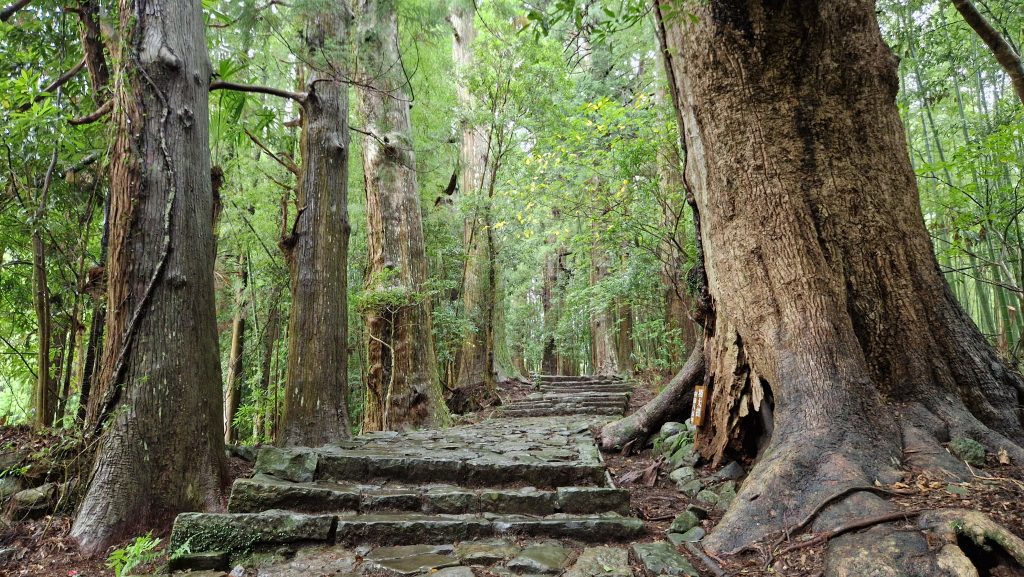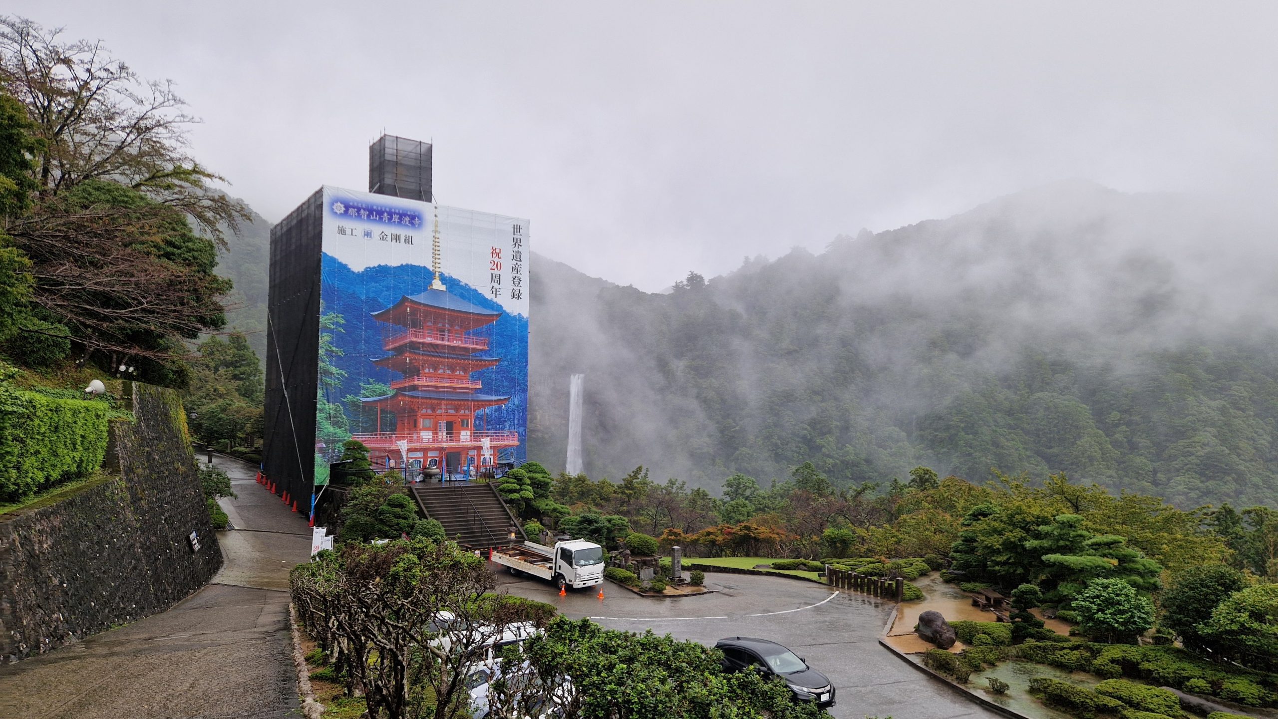 Unsere Unterkunft liegt direkt gegenüber vom Hafen. Hier findet morgens um sieben eine Thunfisch-Auktion statt. Hunderte Fische liegen ordentlich aufgereiht auf Planen. Gemeinsam mit vielen anderen Touristen sehen wir zu wie die Händler die Fische mit einem hakenförmigen Werkzeug begutachten. Vom Verkauf bekommt man nicht besonders viel mit, allerdings verstehen wir die Sprache ja auch nicht. Die verkauften Tiere werden jedenfalls mit Aufklebern markiert und zugeordnet. In der Hoffnung dem stärksten Regen zu entgehen, fahren wir erst am späten Vormittag mit dem Bus zum Beginn (oder Ende – je nach dem) eines Pilgerpfades. Die bewaldeten Berge der Kii-Halbinsel sind durchzogen von solchen Jahrhunderte alten Wegen, die zusammengefasst Kumano Kodo genannt werden. Im Daimon-zaka Hang sind die Steinstufen gesäumt von riesigen Zedern. Entgegen der Wettervorhersage fängt es jetzt erst an zu regnen. Nebelschwaden steigen aus dem Wald auf. Wir erreichen den Kumano Nachi Taisha Schrein. Direkt daneben liegt der buddhistische Seiganto-ji Tempel und noch ein Stück weiter die zugehörige mehrstöckige Pagode. Sie ist zusammen mit dem Nachi-Wasserfall eine bekannte Sehenswürdigkeit der Region. Leider ist das Gebäude aktuell komplett eingerüstet und der Anblick weit weniger beeindruckend als sonst. Wir laufen ein paar Meter auf dem Pilgerpfad, der tiefer in den Wald hinein führt. Die Stufen verlieren sich zwischen den hohen Bäumen. Die Atmosphäre ist mystisch. Gerne würde ich noch ein bisschen weiter wandern, aber bei dem Wetter macht es keinen Sinn. Der Regen ist stärker geworden. Wir laufen zu dem Aussichtspunkt, der am nächsten am Wasserfall liegt, bleiben aber nur kurz. Auf dem Weg zum Mittagessen beginnt es zu schütten. Nach wenigen Minuten sind wir klatschnass. Obwohl es noch nicht spät ist, beschließen wir heute nichts mehr anzuschauen. Wir nehmen sogar einen früheren Zug nach Osaka als geplant war. Dort haben wir ein Zimmer in einem ziemlich großen Hotel mit Pool auf der Dachterrasse. Von hier aus hat man einen schönen Ausblick auf die Lichter der nächtlichen Stadt.