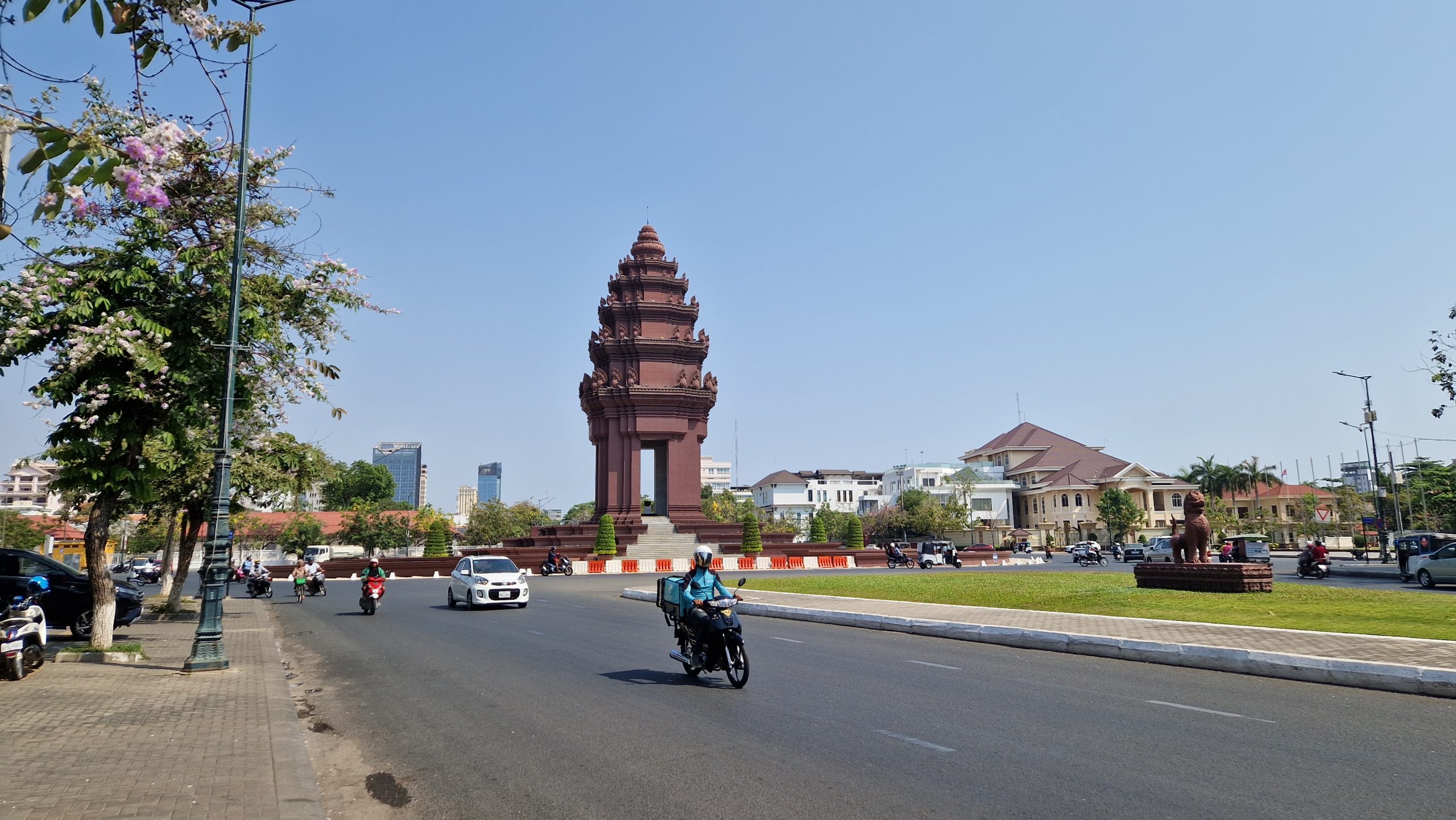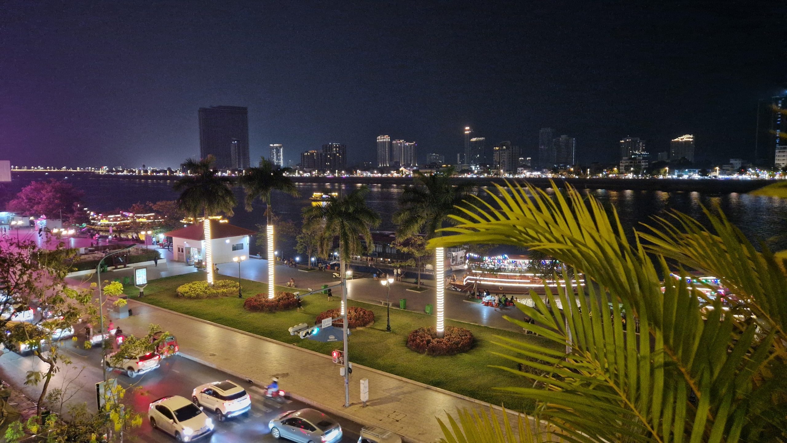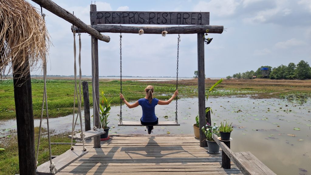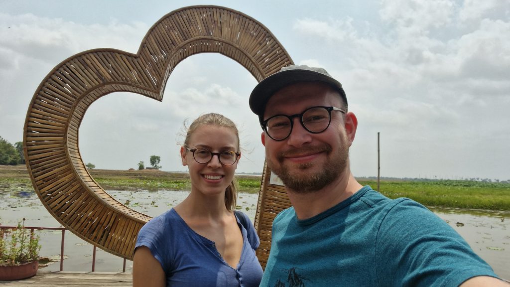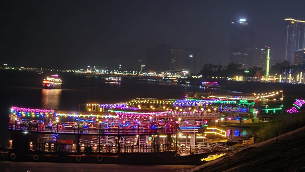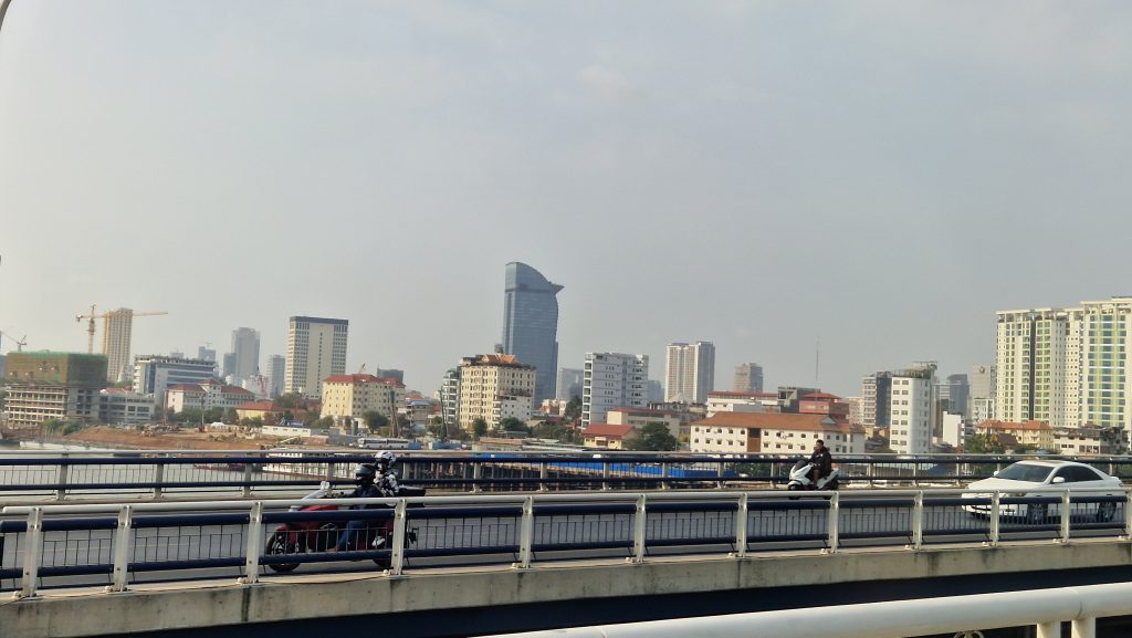 Die bereits bewährte Busgesellschaft nutzen wir auch für die nächste Etappe. Es gibt eine Mittagspause an einem kleinen See, ansonsten ist die Fahrt unspektakulär. Auf den letzten Metern ins Zentrum von Phnom Penh wird der Verkehr dichter. Unser Hostel in der Hauptstadt liegt recht zentral und hat einen Pool mit Blick auf den Fluss. Dort verbringen wir den Rest dieses Nachmittags. Nach Sonnenuntergang laufen wir ein Stück die, erstaulich bunt beleuchtete, Promenade am Wasser entlang. Dann schlendern wir noch kurz über den Nachtmarkt. Die Schuhe und Uhren, die dort verkauft werden, reizen uns nicht wirklich. Die einzige Besonderheit ist der „Picknickbereich“. Dort sitzen Einheimische und Touristen gleichermaßen auf Matten auf dem Boden und lassen sich Essen von den angrenzenden Ständen servieren. Wir lassen den Abend bei einem Cocktail in der Rooftop-Bar, neben dem Pool, ausklingen.