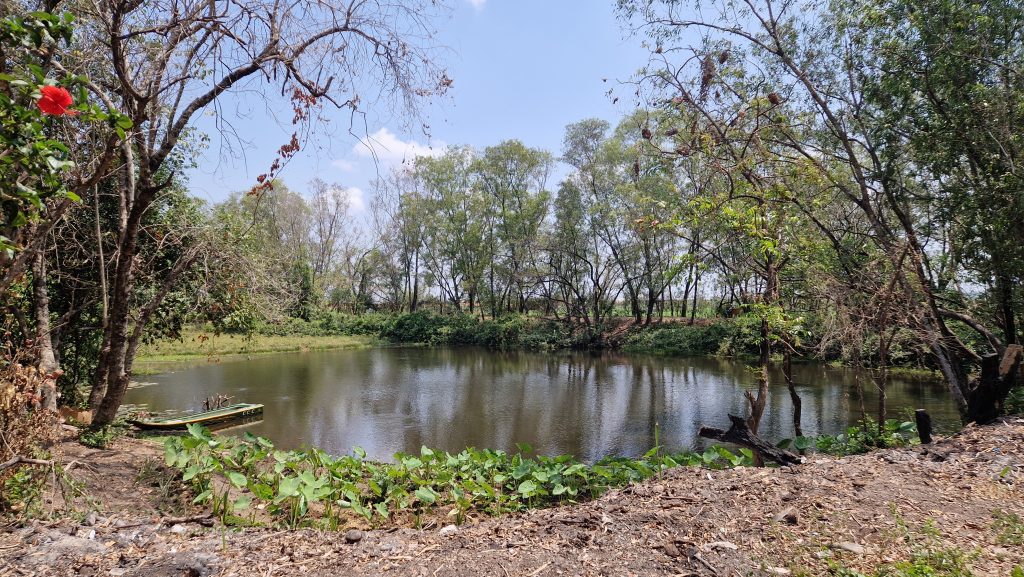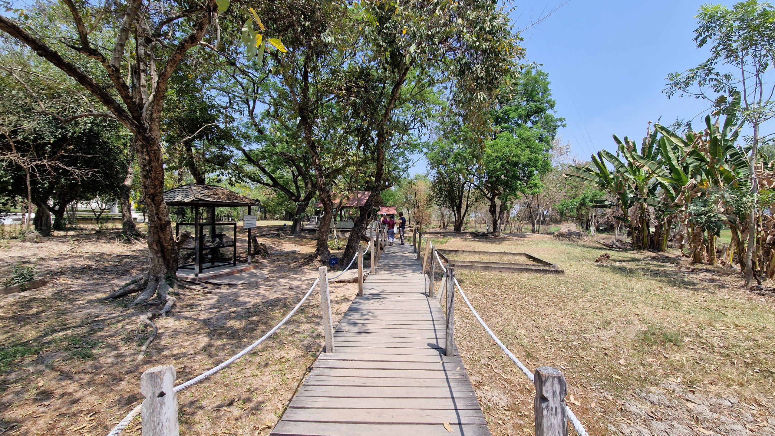 Wir fahren zuerst einige Kilometer aus der Stadt heraus zum Choeung Ek Gedenkzentrum, einem der einstigen Killing Fields. Hierher wurden Gefangene gebracht, um sie zu töten und in Massengräbern zu beerdigen. Es gibt im ganzen Land um die dreihundert solcher Gräber, wenn auch nicht alle so groß sind. Die Überreste von mehr als achttausend Menschen wurden hier geborgen, tausende weitere werden noch in der Erde vermutet. Am Eingang erhält man einen Audioguide, der von den politischen Hintergründen erzählt, aber auch Details der grausamen Tötungen und persönliche Schicksale Überlebender beschreibt. Es herrscht eine seltsame Atmosphäre. Die grüne Wiese und die blühenden Bäume vermitteln einen friedlichen Eindruck. Aber die unglaubliche Hitze und die furchtbaren Geschichten lassen alles irgendwie bizarr wirken. Dass man auf dem Boden Kleidungsfetzen sieht, die der Regen auch nach dieser langen Zeit immer noch freilegt, macht es noch unangenehmer. Der Besuch endet mit der Besichtigung des Gedenktstupa, in dem die gefundenen Knochen aufbewahrt werden.