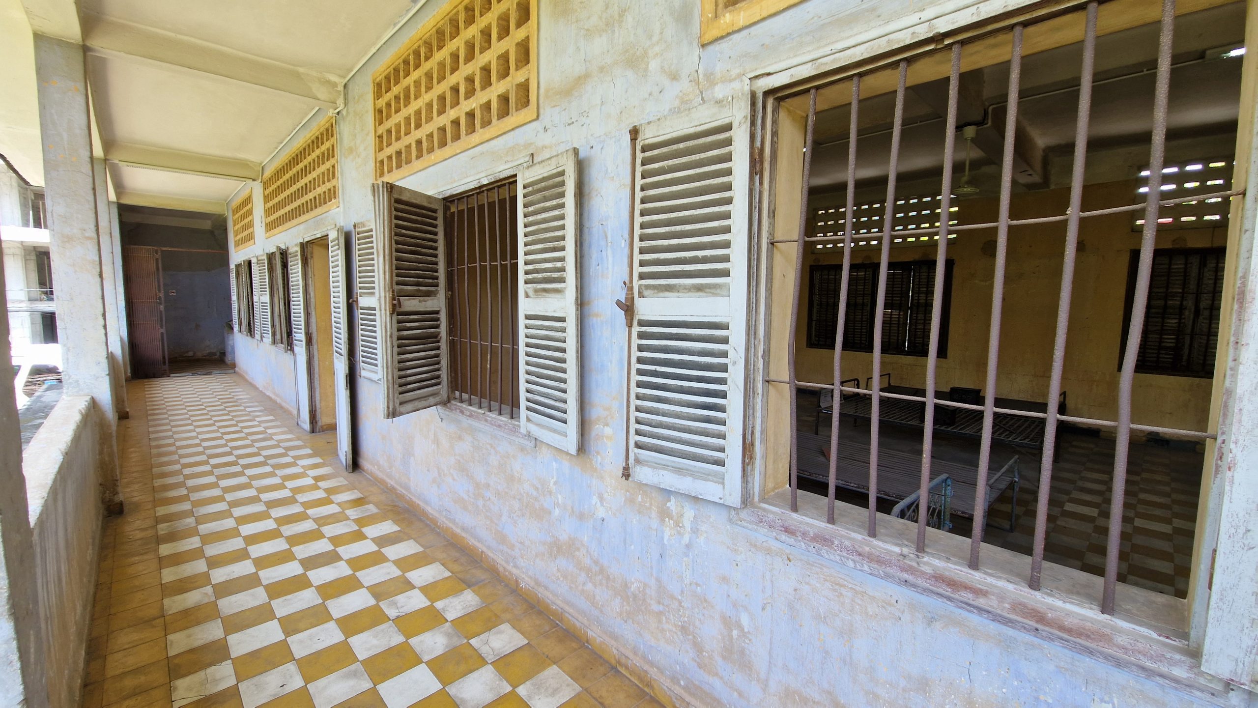 Zurück in der Stadt, sehen wir uns das Tuol Sleng Museum an, früher als Gefängnis S-21 bekannt. Die vier Gebäude einer ehemaligen Schule sind um einen hübschen, grünen Innenhof gruppiert. Dort hat man die Opfer begraben, die bei der Befreiung des Gefängnisses gefunden wurden. Die Klassenräume wurden in winzige Gefängniszellen aufgeteilt, manche auch in Folterkammern umgewandelt. Fast alles wurde im Originalzustand belassen, auch der Stacheldraht um das Gelände ist noch vorhanden. Zu sehen sind Zeichnungen von Foltermethoden und Fotos der eingewiesenen Häftlinge. Tausende wurden hier gefangen gehalten, überlebt haben weniger als zehn. Auch hier gibt es einen Audioguide. Die Erzählungen sind schwer zu ertragen. Sie werden mich noch eine ganze Weile verfolgen.