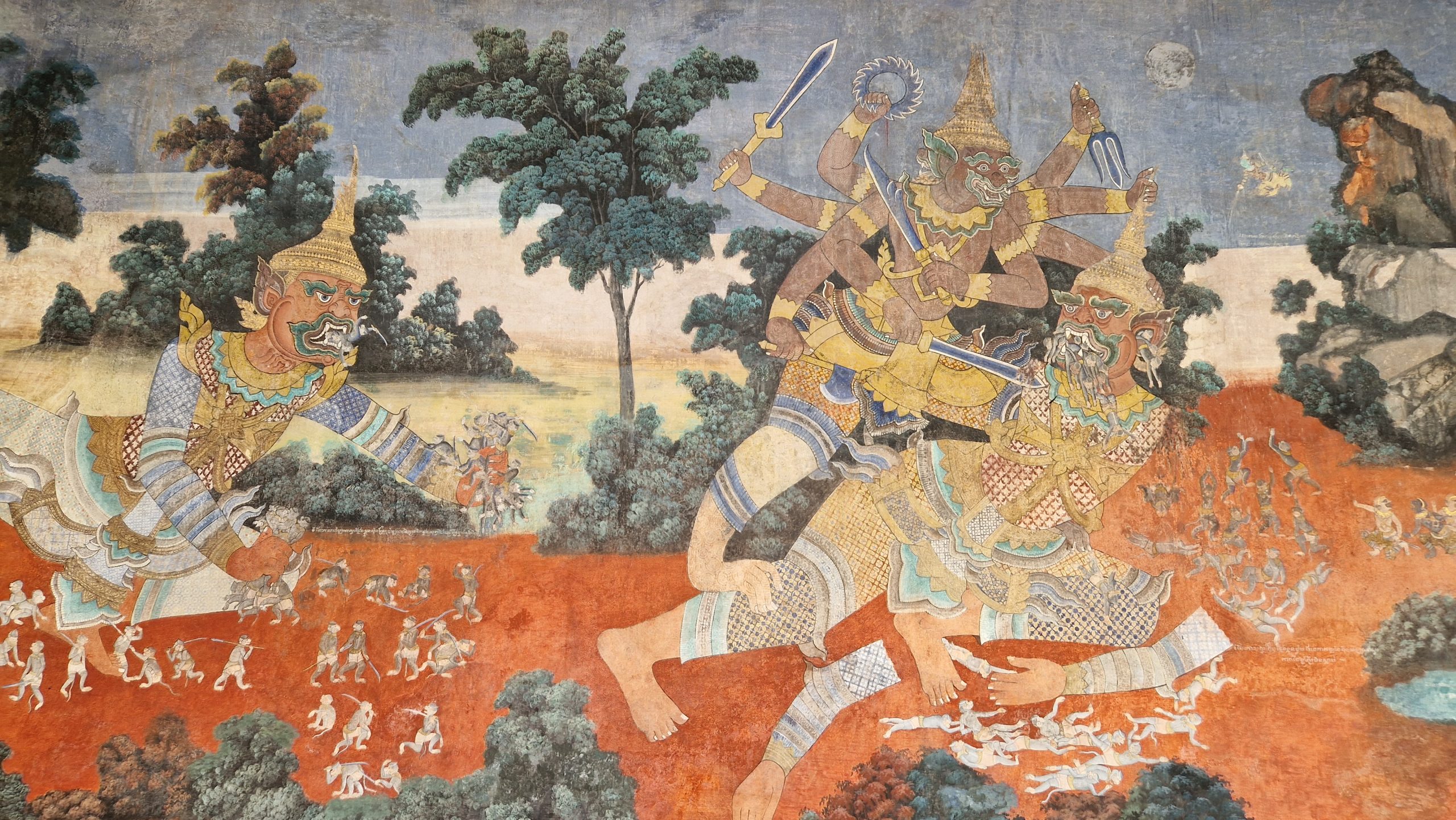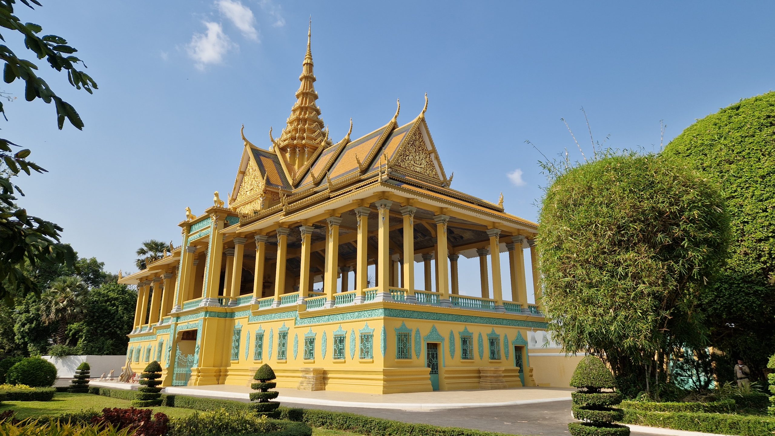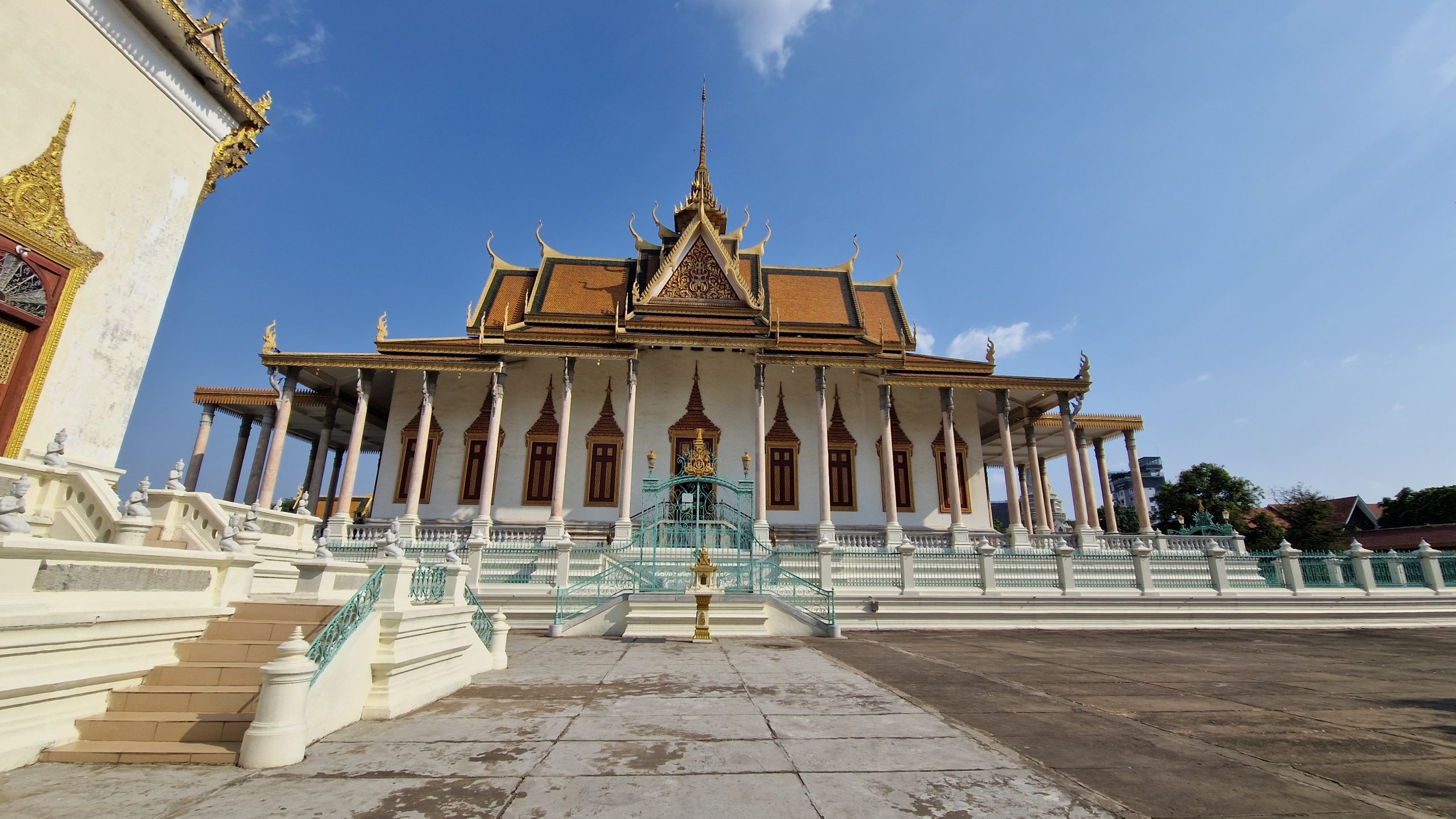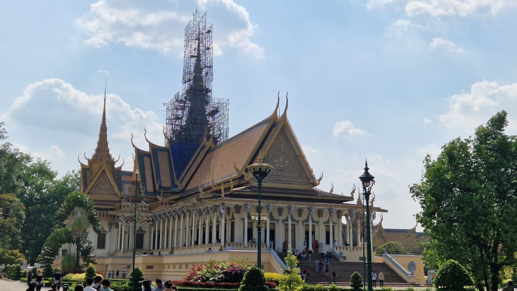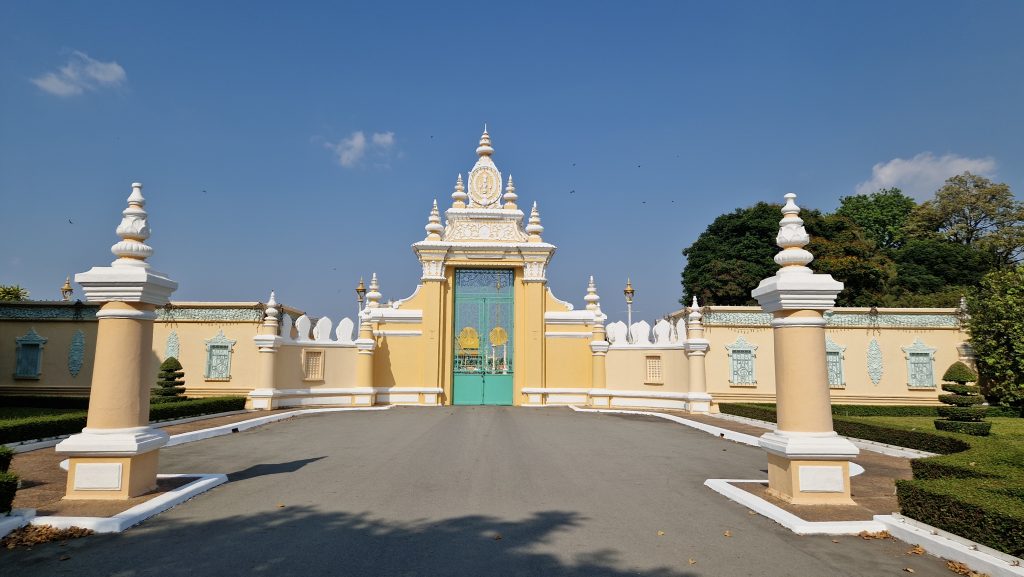 Am Nachmittag soll etwas Erfreulicheres unsere düsteren Gedanken vertreiben: Der Palast des Königs. Am Eingang beschließt Patrick nicht mit rein zu gehen, weil Maskenpflicht besteht (außer dem Tempel ist fast alles unter freiem Himmel, die Maßnahme ist also ein bisschen übervorsichtig). Der Rundweg führt am Haupteingangstor des Geländes vorbei (nur der König selbst darf durchgehen), an einer hübschen Tanzhalle und dem Thronsaal (betreten verboten, Fotos von innen auch). Dann führt er in den Hof mit der berühmten Silberpagode (der Fußboden besteht aus silbernen Fliesen) und ihrem Emerald Buddha. Darum herum gruppiert sind mehrere Stupas als Begräbnisort von Mitgliedern der königlichen Familie. Umschlossen wir der Hof von einer Gallerie mit einem gigantischen Wandgemälde. Leider ist es an vielen Stellen durch Wasser beschädigt worden.