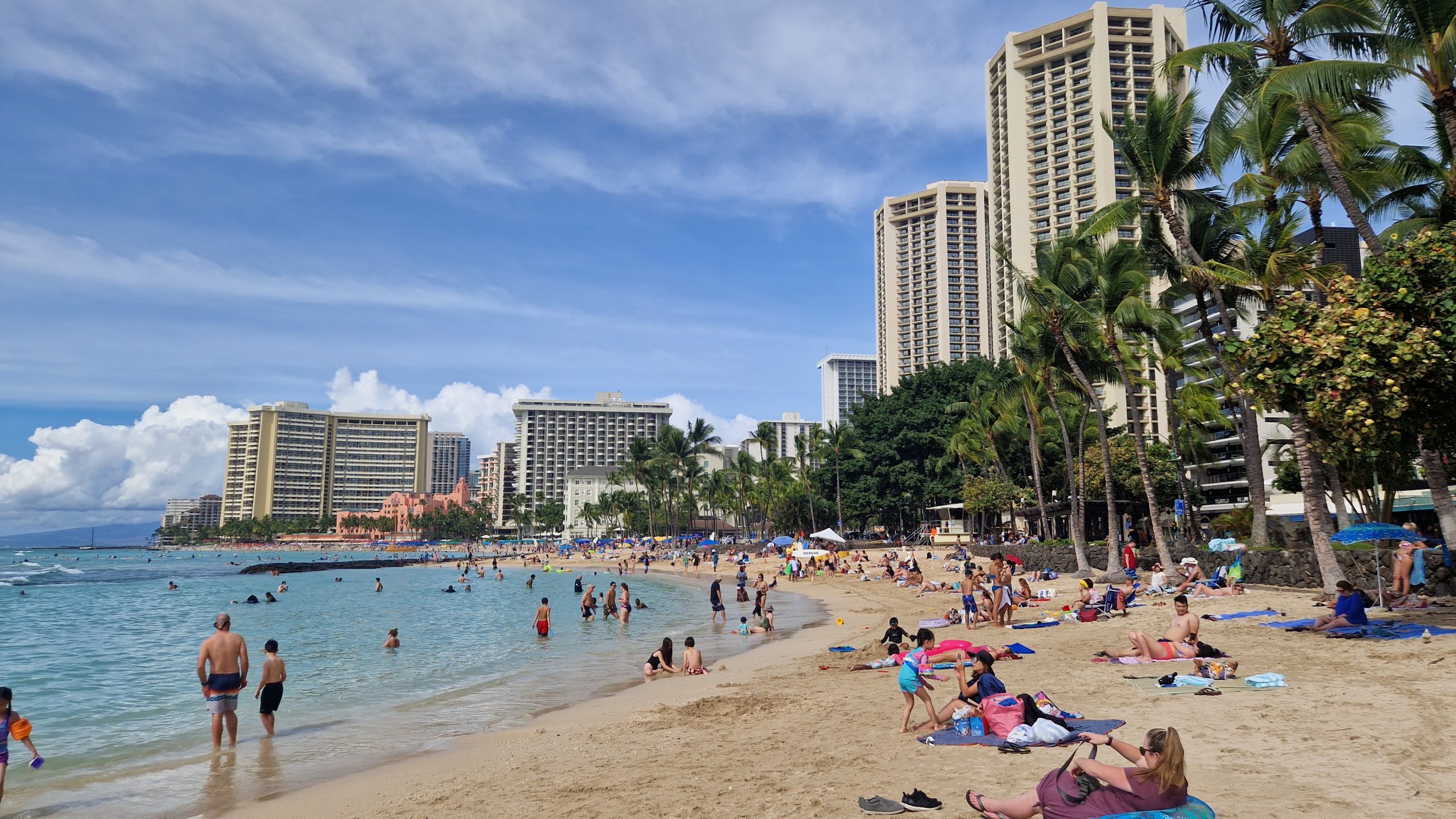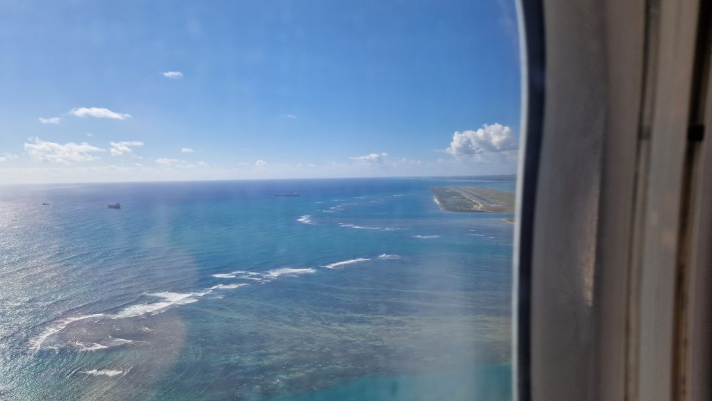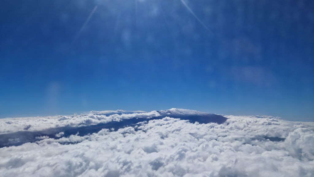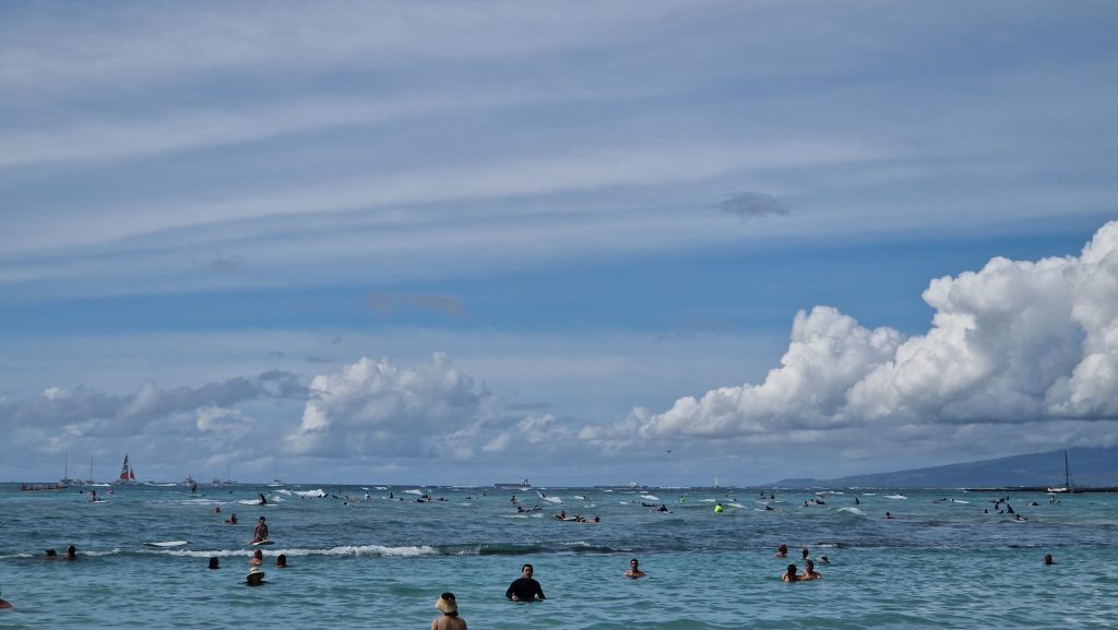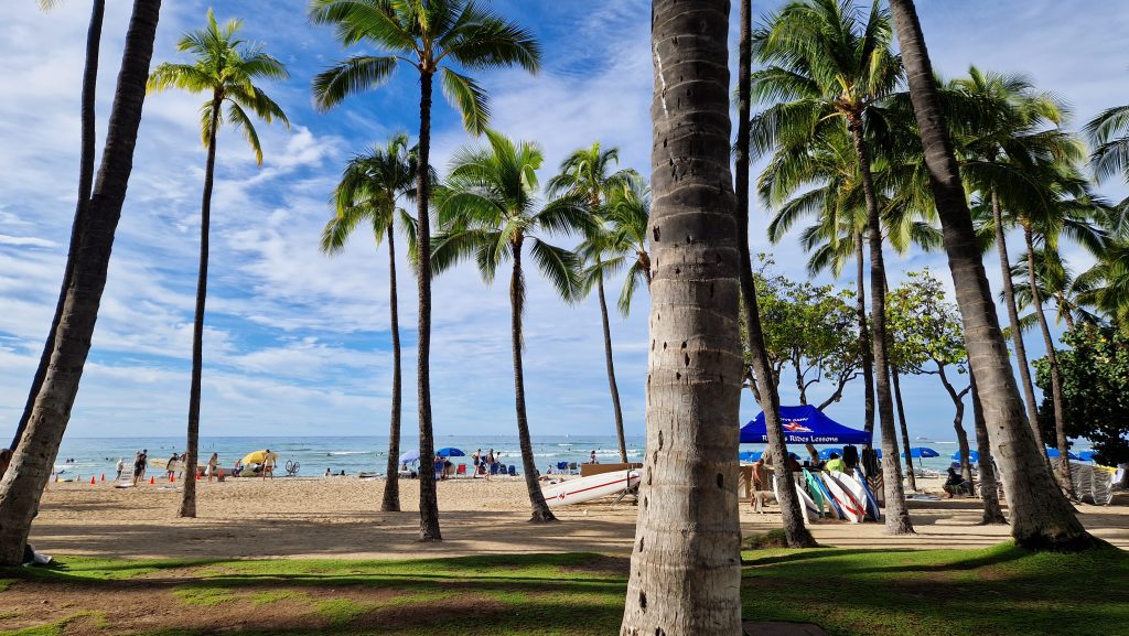 Ein weiterer Kurzstreckenflug (auch, wenn man Zeit hätte – es gibt keine Fährverbindungen) bringt uns von der größten zur wichtigsten Insel Hawaiis. So bekommen wir immerhin noch die beiden höchsten Berge zu sehen: Mauna Kea und Mauna Loa (der bis vor ein paar Tagen noch aktiv war) auf Big Island. Auf O´ahu liegt Hawaiis Hauptstadt Honolulu und die ist deutlich größer als alle anderen Städte auf der Inselgruppe. Eine Stunde braucht der Bus vom Flughafen zu den Hotels am Waikiki Beach. Eine interessante Stimmung erwartet uns dort. Tropisch und gleichzeitig super amerikanisch, auf jeden Fall aber sehr lebendig. Viele Menschen, beleuchtete Palmen, Weihnachtsdeko und Blumenketten – es gefällt mir.
