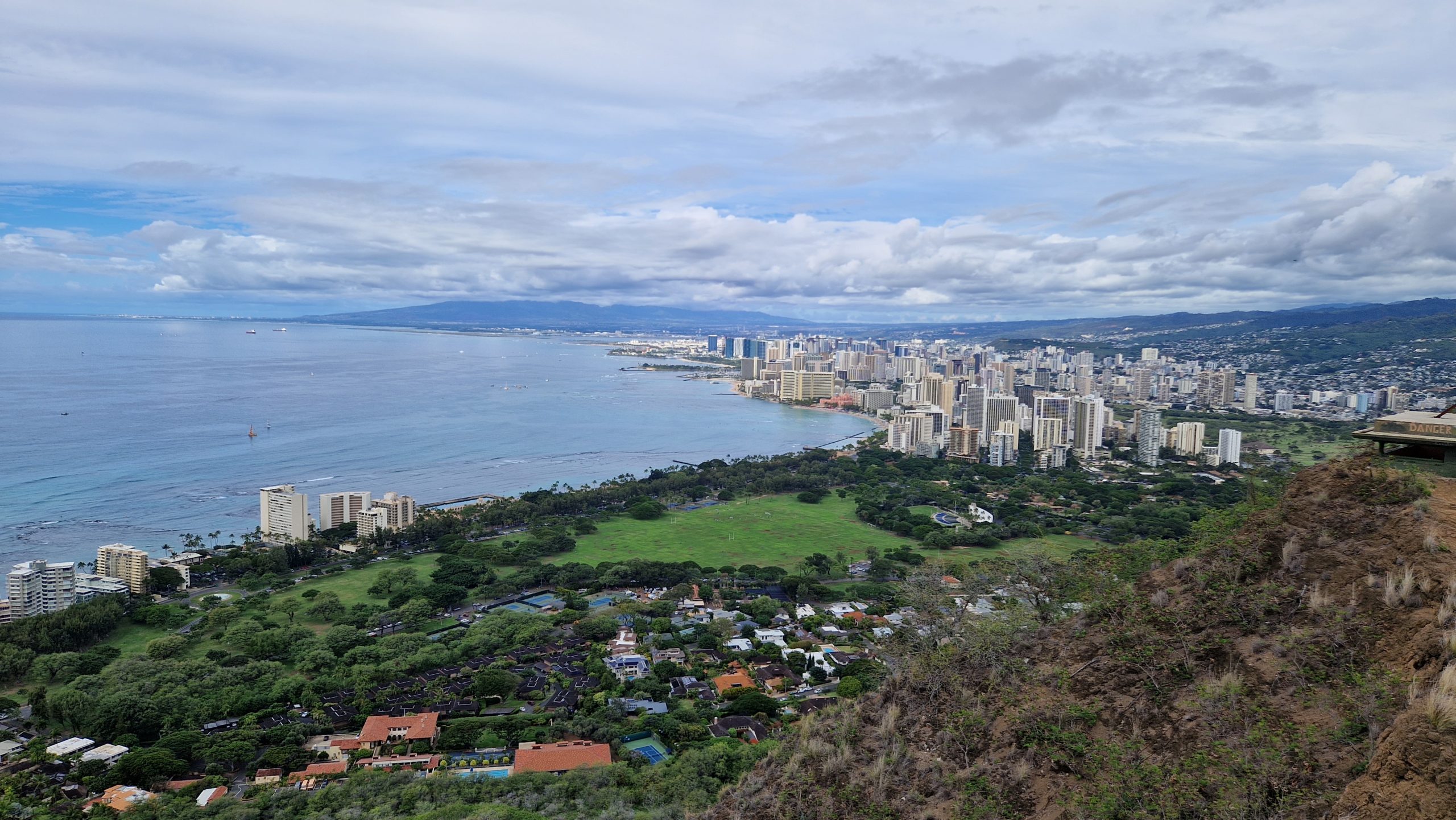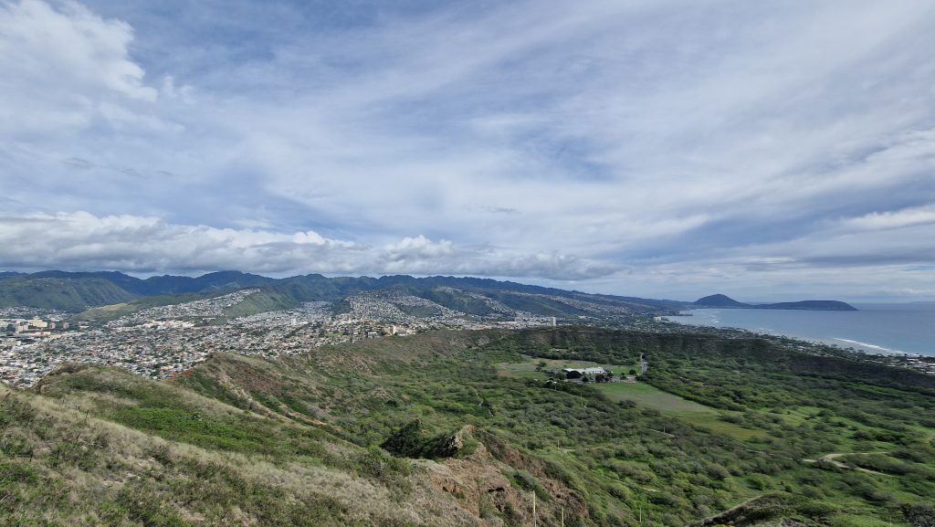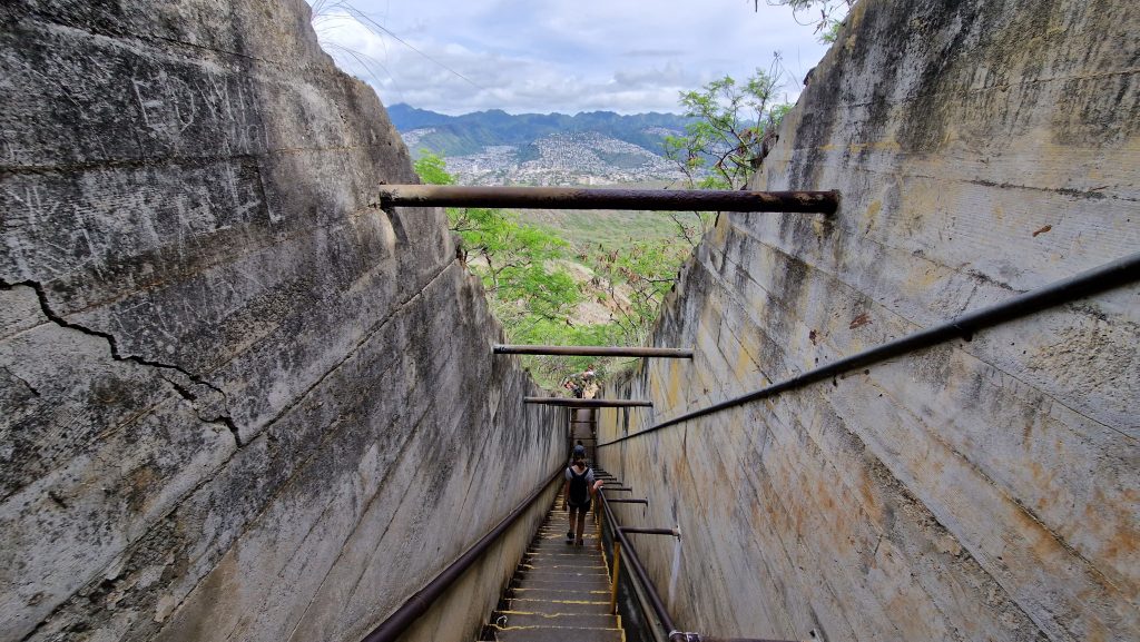 Wir haben es geschafft Permits für die beiden bekanntesten Attraktionen zu bekommen. Wir starten mit der Wanderung auf den Diamond Head. Der Weg ist gut ausgebaut und nicht besonders lang, aber stellenweise sehr steil. Anstrengend wird es durch das tropische Klima, schon nach ein paar Minuten sind wir schweißgebadet. Auf dem höchsten Punkt des Kraterrandes befindet sich ein alter Bunker. Ich verstehe, warum der Zutritt begrenzt ist. Auch so sind wahnsinnig viele Menschen hier oben. Dafür bekommt man eine nette Sicht auf die Skyline am Waikiki Beach, den Krater und das Ko’olau Gebirge im Hintergrund.