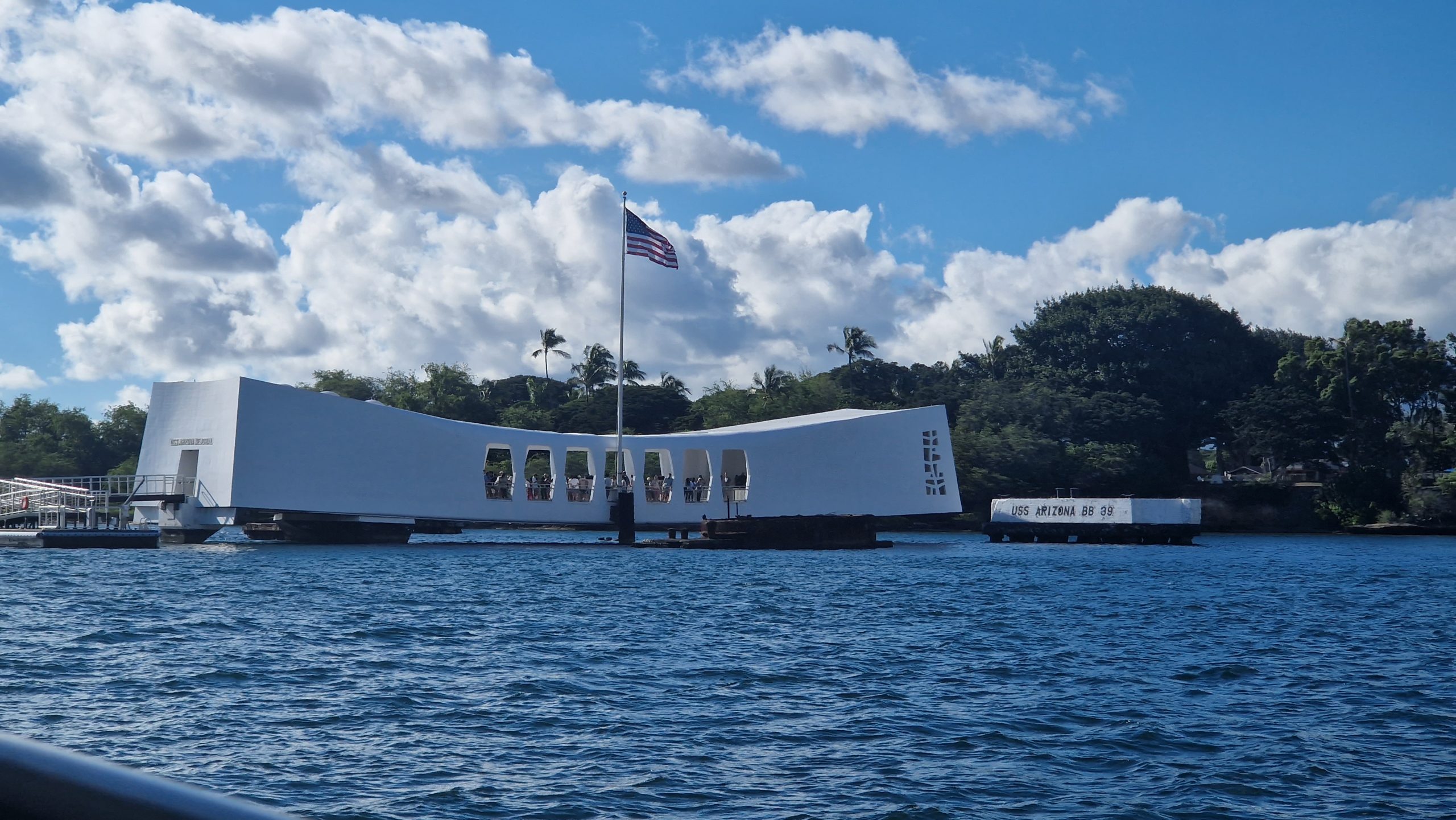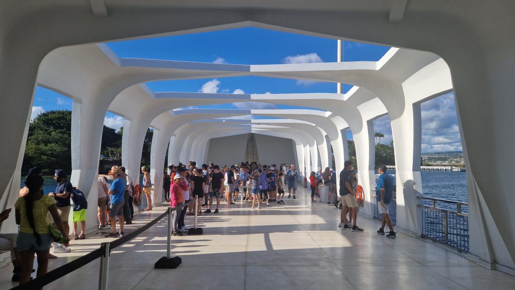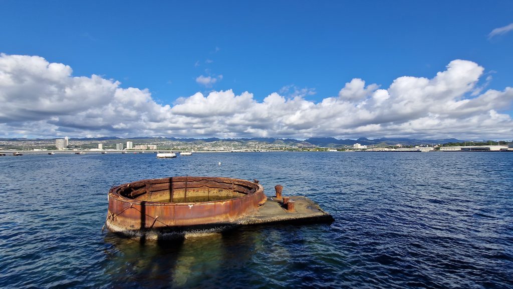 Die zweite Station für heute liegt genau auf der anderen Seite der Stadt: Pearl Habor. Der Ort, an dem die Japaner 1941 die amerikanische Pazifikflotte zerstört haben, woraufhin Amerika dem zweiten Weltkrieg begetreten ist. Hier gibt es Denkmäler für die vielen damals Getöteten und mehrere Museen. Am bekanntesten ist das Denkmal, das über der USS Arizona errichtet wurde. Das Kriegsschiff ist nach einer Explosion gesunken und wurde nie geborgen. Noch heute kann man seine Umrisse im flachen Wasser erkennen.