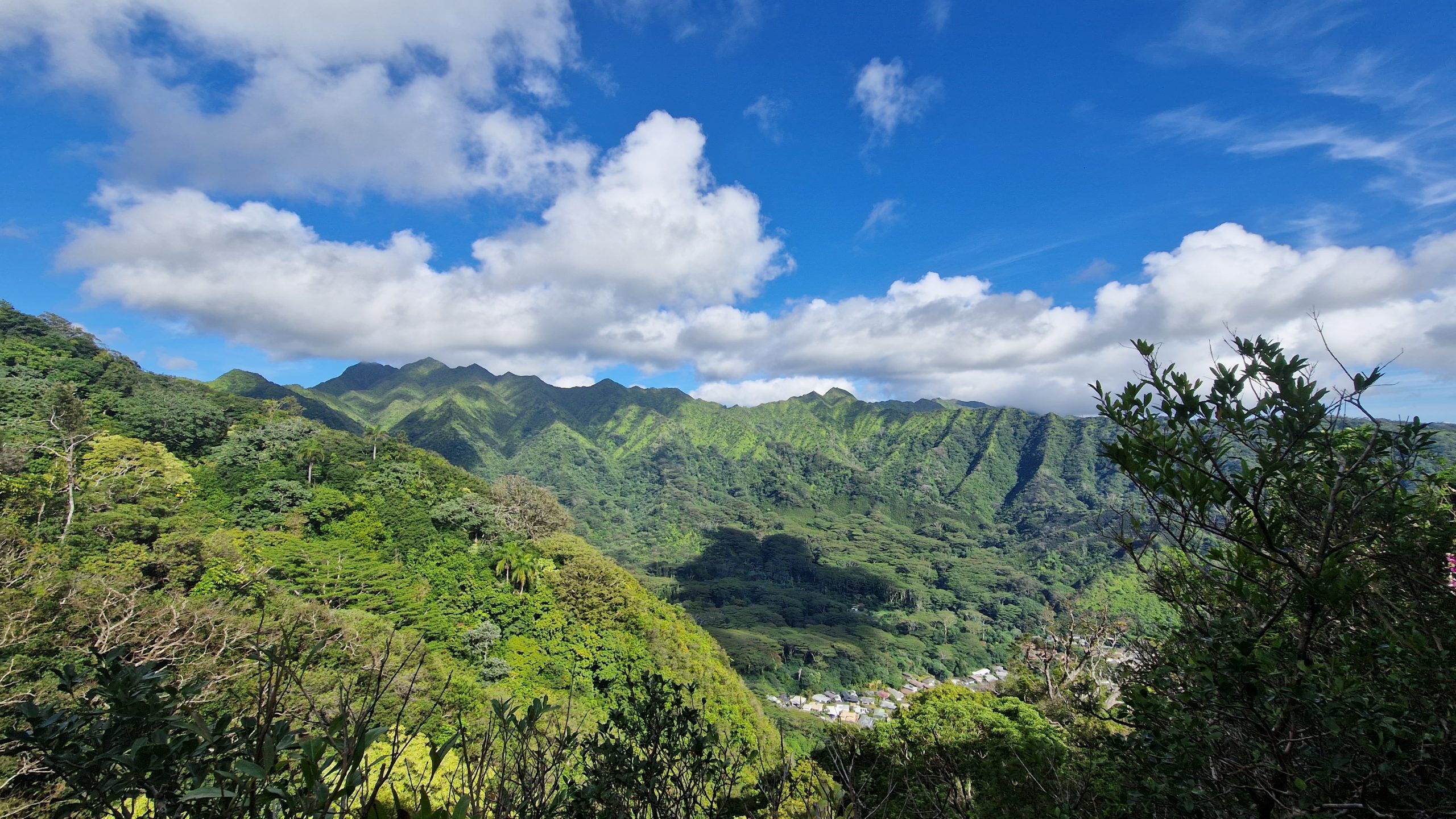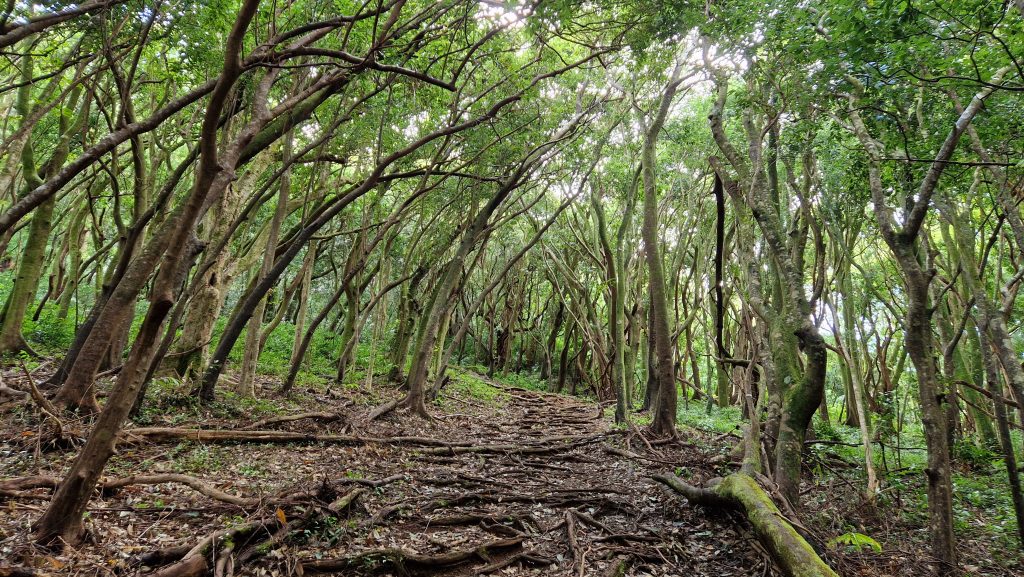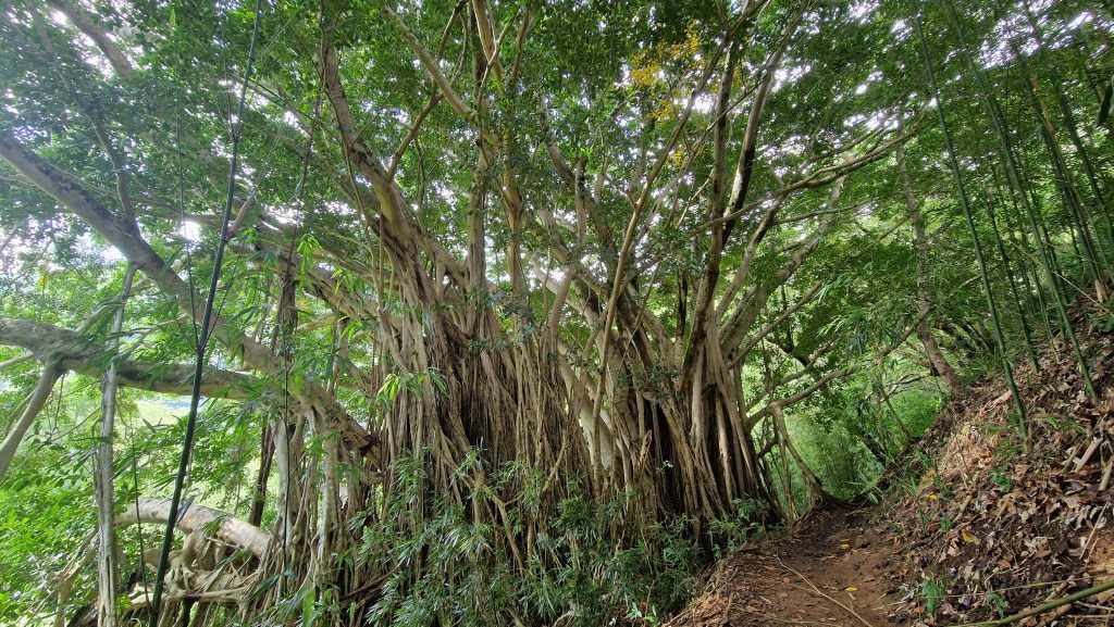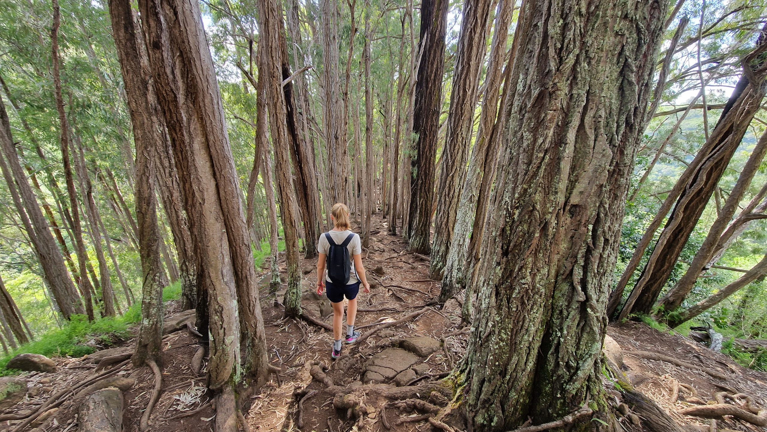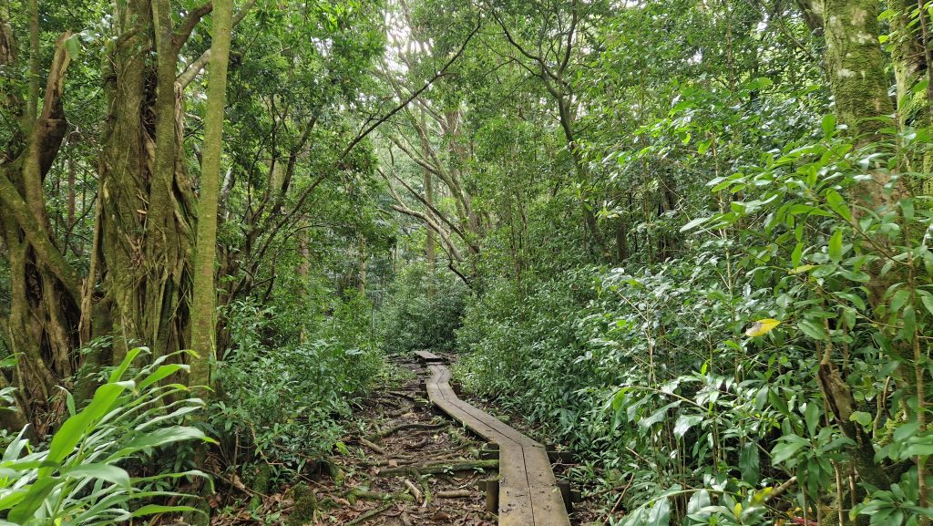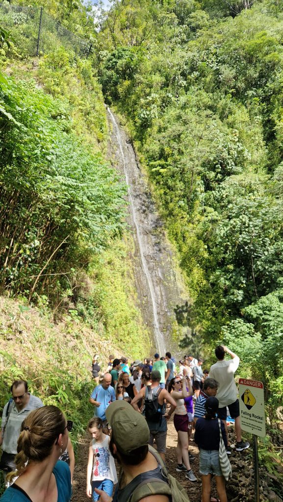 Am Christmas Day gehen wir wandern. Ohnehin hat heute in der Stadt fast alles geschlossen. Zum Nordrand der Stadt kommt man mit dem Bus. Von dort laufen wir zum Manoa Wasserfall. Der Weg ist breit und nicht sehr lang. Geeignet auch für unsportliche Menschen, dementsprechend viel ist hier los. Obwohl es nachts geregnet hat, fließt nur wenig Wasser über den Felsen herab. Das „Betreten verboten“ Schild wird fleißig ignoriert, alle wollen im Fluss baden gehen. Das Gedränge ist anstrengend, hatte ich so nicht erwartet. An der nächsten Gabelung biegen wir auf einen schmalen Pfad ab und sofort haben wir die Natur für uns. Fühlt sich wie eine Befreiung an. Der Weg ist schlammig, die Umgebung dafür umso schöner. Und so vielfältig. Bambuswälder unterbrochen von Banyan-Bäumen, blühenden Stauden und Farnen. Mal sind die Bäume über den Weg gekrümmt, mal hoch und gerade. Zwischendurch bietet sich eine wunderbare Aussicht auf die für Hawaii so typischen dicht bewachsenen Berge. Wir sind mehrere Stunden unterwegs und kommen mit schmerzenden Füßen nach Hause. Aber es hat sich gelohnt. Ein toller Ausflug an unserem letzten Tag hier.