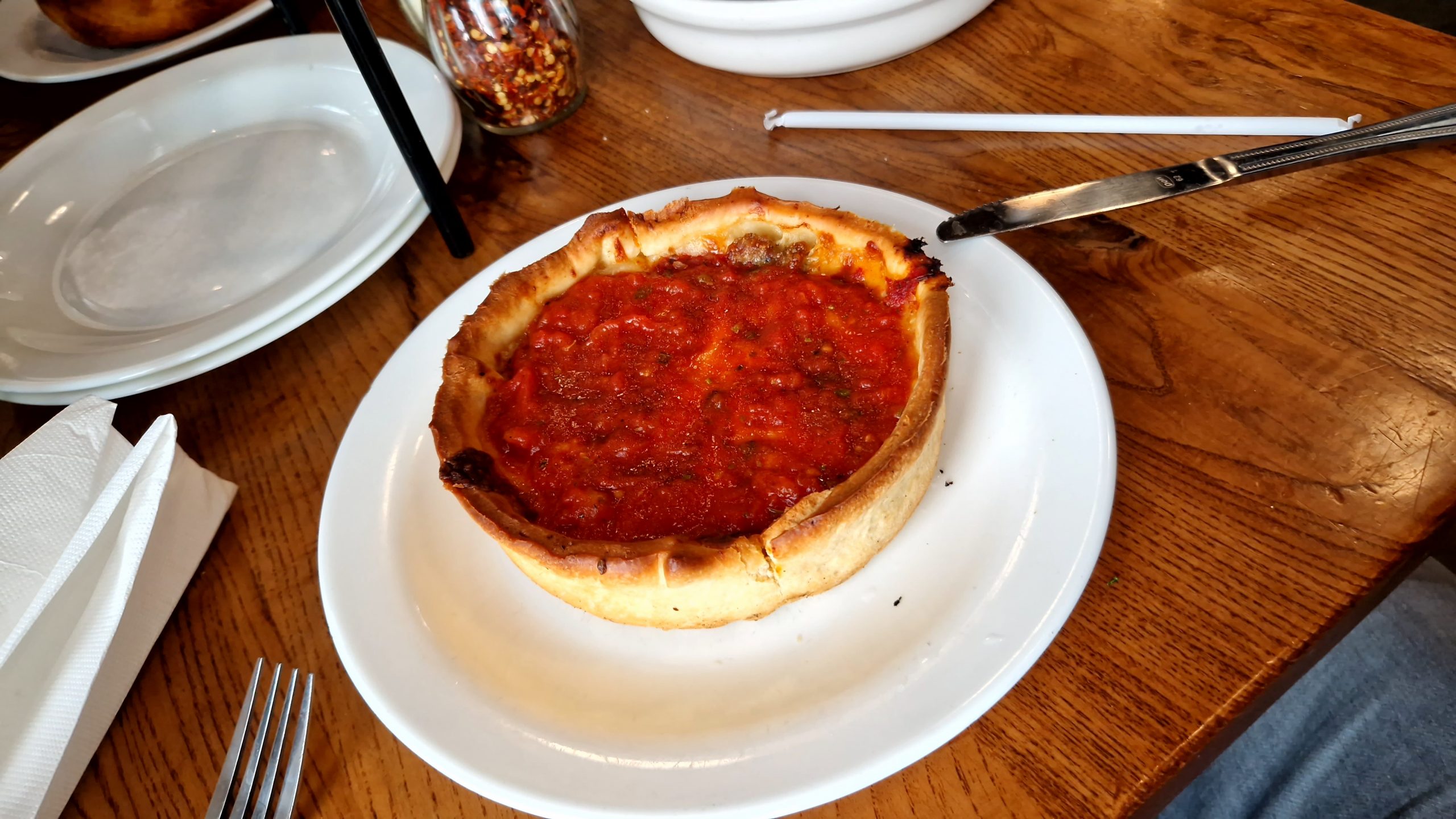 Beim Thema Essen gibt es natürlich den Klassiker, die Deep Dish Pizza. Mehr oder weniger eine Quiche im Pizza Still. Wir waren bei Giordano’s zum Mittagessen und das kann ich definitiv Empfehlen. Man bekommt eine kleine Deep Dish nach Wahl + Beilage für $12. Der Geschmack war super!