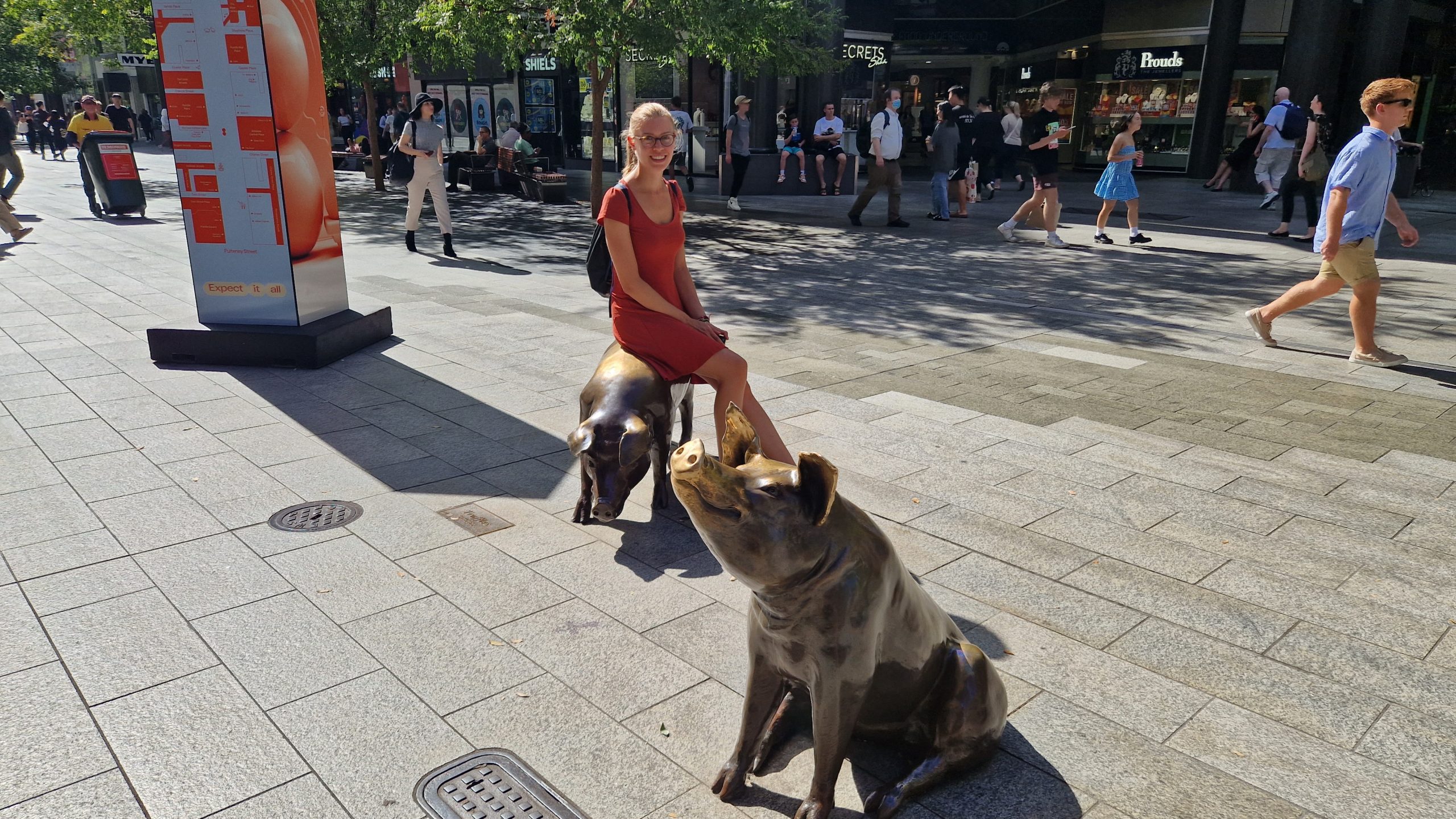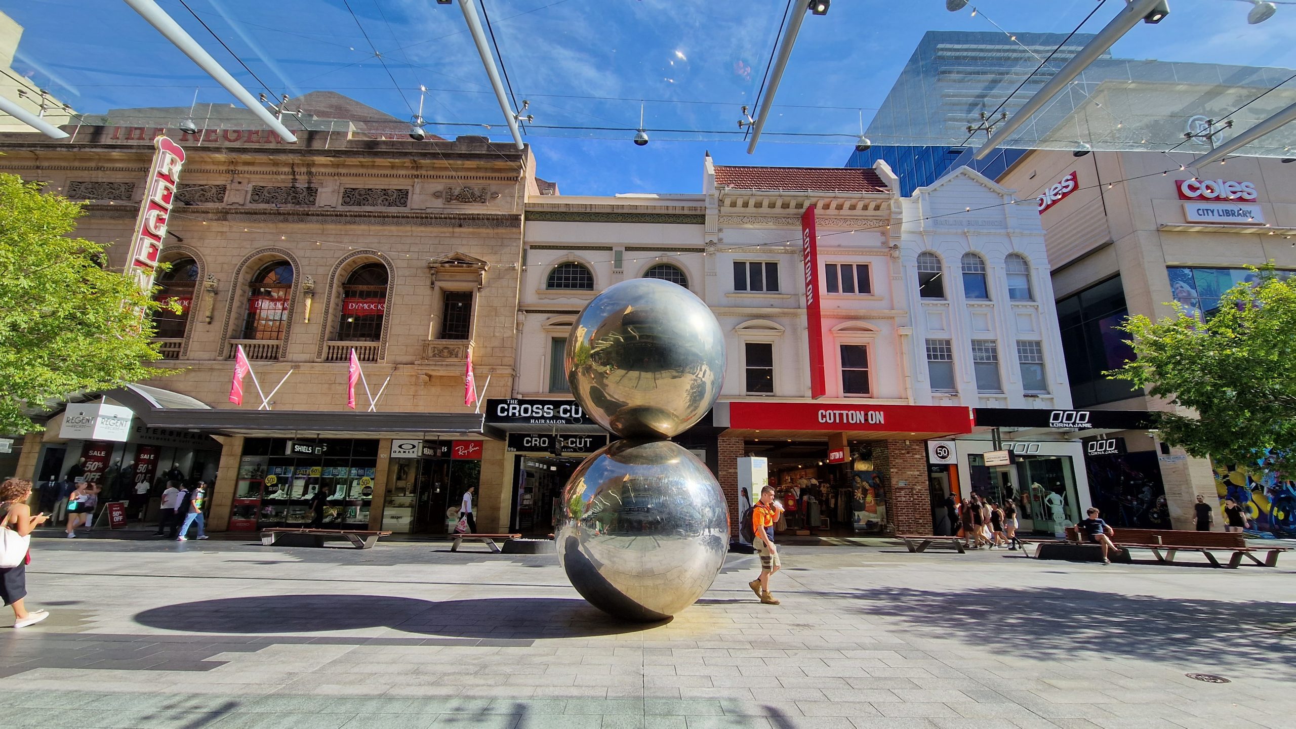 Der Central Market ist ziemlich groß. Man kann leicht ein bis zwei Stunden dort verbringen und die Auslagen bewundern. Wir essen Kuchen und kaufen ein bisschen frisches Gemüse. Die beiden größten Innenstadt-Supermärkte befinden sich aber in der Rundle Mall. Der Name ist irreführend, die Mall ist kein Gebäude, sondern gleicht eher einer typischen Fußgängerzone. Verglichen mit der sonst recht ruhigen Stadt, ist hier immer was los.