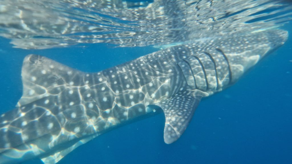 Um 6 Uhr morgens werden wir abgeholt und zur Küste gefahren. Dort bekommen wir Schwimmwesten, eine Taucherbrille und eine kurze Einweisung. Die Attraktion, für die wir hier sind: Walhaie. Jeweils zehn Leute steigen in ein schmales Fischerboot, dann wird man circa 300 Meter aufs Meer rausgefahren (wo schon ein Dutzend andere Boot dümpeln). Dort dürfen wir ins Wasser und die riesigen, gepunkteten Fische aus nächster Nähe beobachten. Es ist wirklich ein Erlebnis, sie nur wenige Meter entfernt vorbei schwimmen zu sehen. Das Wasser ist so klar, dass man bis auf den Meeresgrund sieht und auch die abgetauchten Walhaie erkennt. Nach einer halben Stunde geht es zurück an Land. Gelohnt hat sich der Ausflug auf jeden Fall. Ob es den Tieren allerdings so gut tut, ständig mit Futter angelockt zu werden (war mir vorher nicht bewusst), das darf man ruhig anzweifeln.