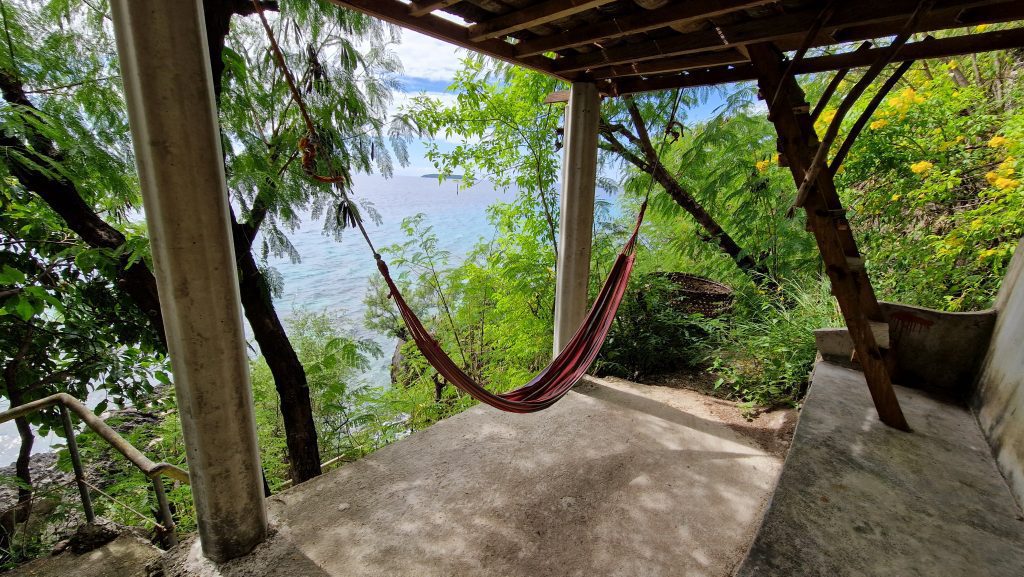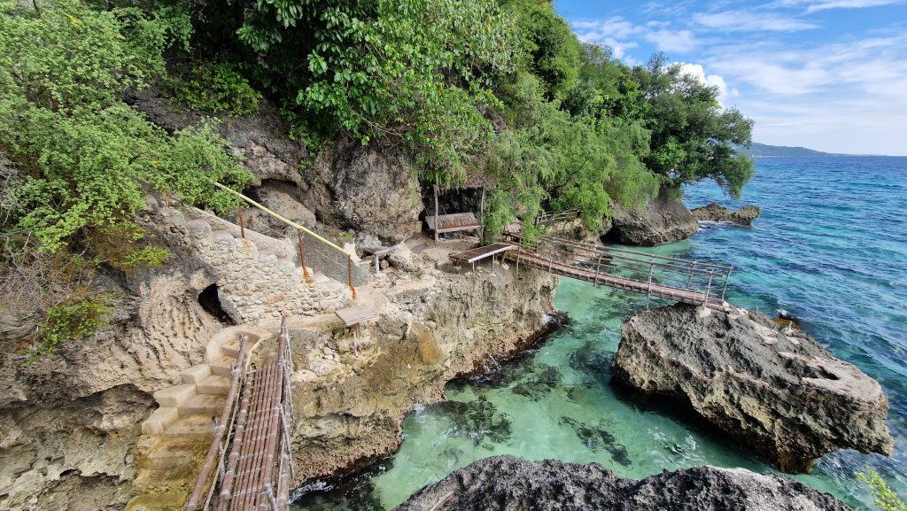 Nach dem Frühstück erkunden wir das aufwendig gestaltete Grundstück unserer Unterkunft, einschließlich des privaten Meerzugangs (kein Strand, nur Stufen im Fels). Schwimmen gehen wir nicht, ich habe für heute genug Zeit im Wasser verbracht. Die einzige andere Ausflugsmöglichkeit in der Nähe ist ein Wasserfall. Die Anfahrt ist uns aber zu teuer. Da wir auch mit dem winzigen Zimmer nicht so glücklich sind, beschließen wir keine weitere Nacht zu bleiben (wie es ursprüglich geplant war). Der Bus, der uns dieses Mal mitnimmt, gehört zur günstigeren Preisklasse ohne Klimaanlage (nicht schlimm, die Fenster sind offen). Leider ist alles ziemlich staubig, auch die Sitze. Vom Liloan Port bringt uns die Fähre auf dem bemerkenswert wellenlosen Meer nach Dumaguete. Die Stadt ist relativ groß, sodass wir im dortigen Shoppingcenter ein paar Erledigungen machen können (wie zum Beispiel endlich Sonnencreme zu kaufen). Außerdem besorgen wir schon mal die Tickets für die morgige Fahrt nach Siquijor.
