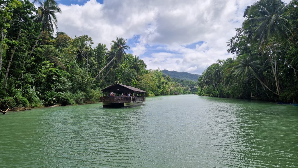 Die Woche startet mit einem langen Ausflug. Mit dem Roller fahren wir nach Loboc. Hier gibt es eine Lunch River Cruise (für uns eher ein spätes Frühstück, es ist halb elf) auf dem gleichnamigen Fluss. Das Essen schmeckt durchschnittlich, aber mit Blick auf den von Palmen gesäumten, grünen Fluss, ist es doch etwas Besonderes. Ungefähr 45 Minuten lang fahren wir, begeleitet von Livemusik, flussaufwärts. Als der Fluss zu schmal für das Schiff wird, gibt es eine Fotopause. Nachdem jeder sein Selfie mit sämtlichen mitgebrachten Omas und Tanten gemacht hat, geht es wieder zurück. Auf dem Weg bekommen wir noch traditionelle Tänze von den Frauen aus dem Dorf gezeigt.
