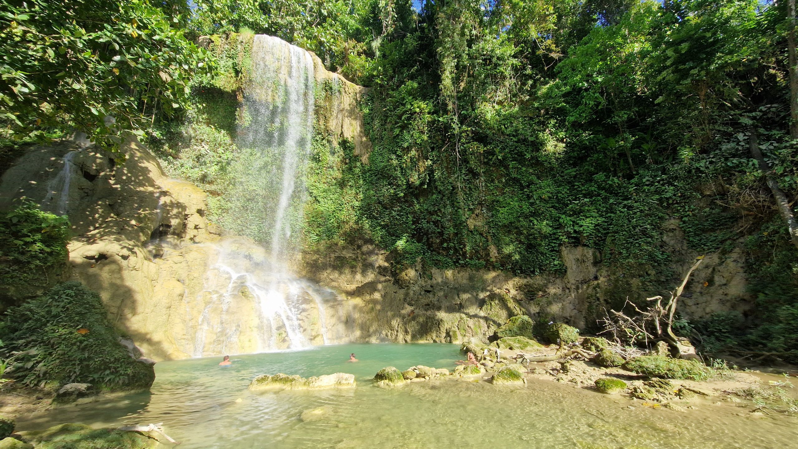 Um den weiten Rückweg etwas aufzulockern, machen wir einen weiteren Stopp. Der Kawasan Wasserfall war mal eine Touristenattraktion mit entsprechender Infrastruktur. Die wurde beim letzten Taifun teils zerstört und ist nicht mehr in Betrieb. Trotzdem ist die Treppe frei von Schmutz und der Rasen gemäht, es scheint sich also jemand zumindest ein bisschen zu kümmern. Außer uns sind nur drei andere Leute hier. Wir kühlen uns im Wasser ab und genießen die relative Ruhe (der Wasserfall ist laut, obwohl er gerade nur wenig Wasser führt).