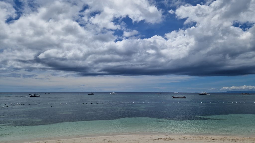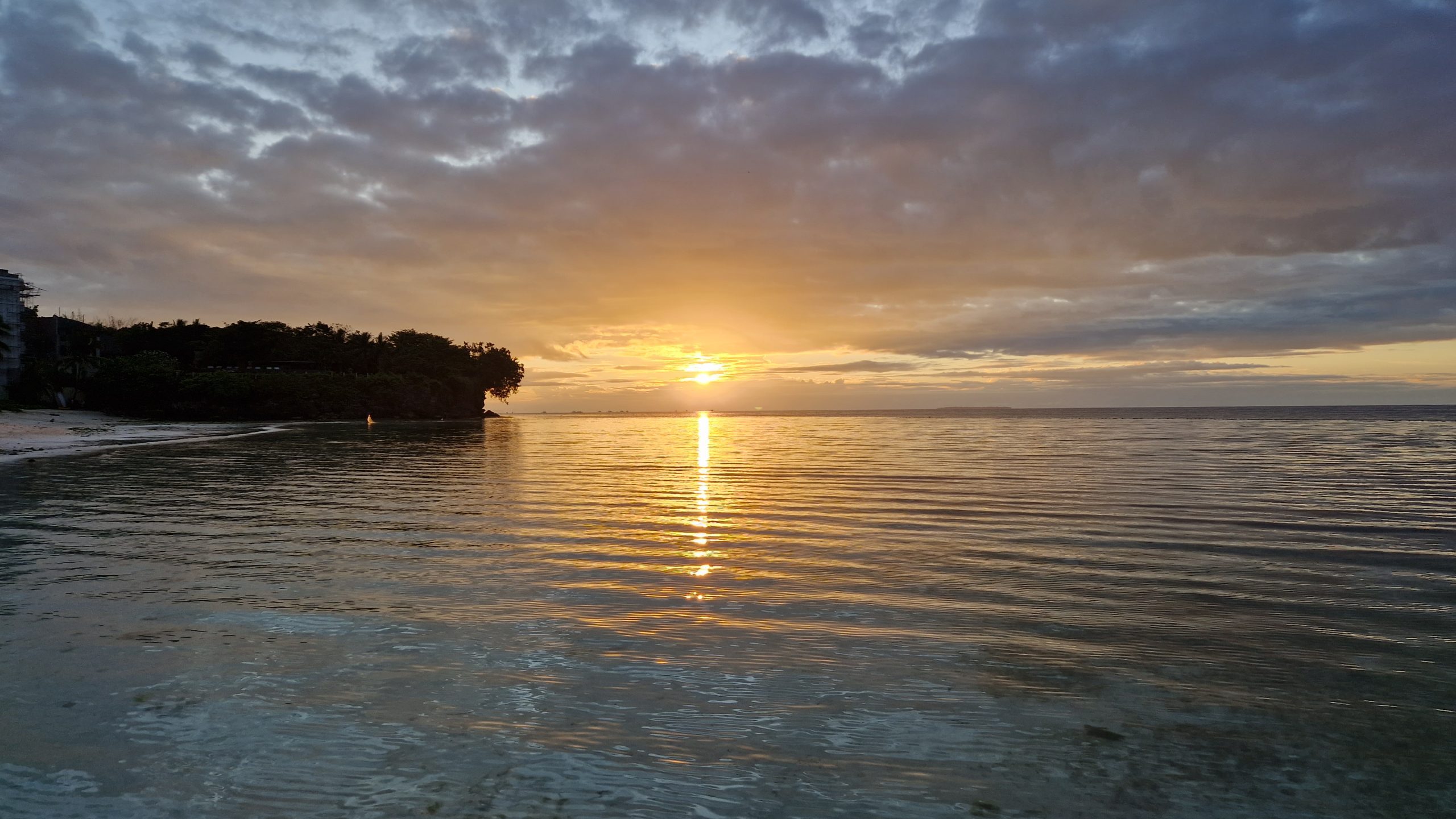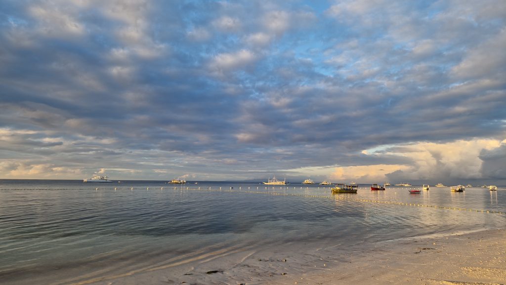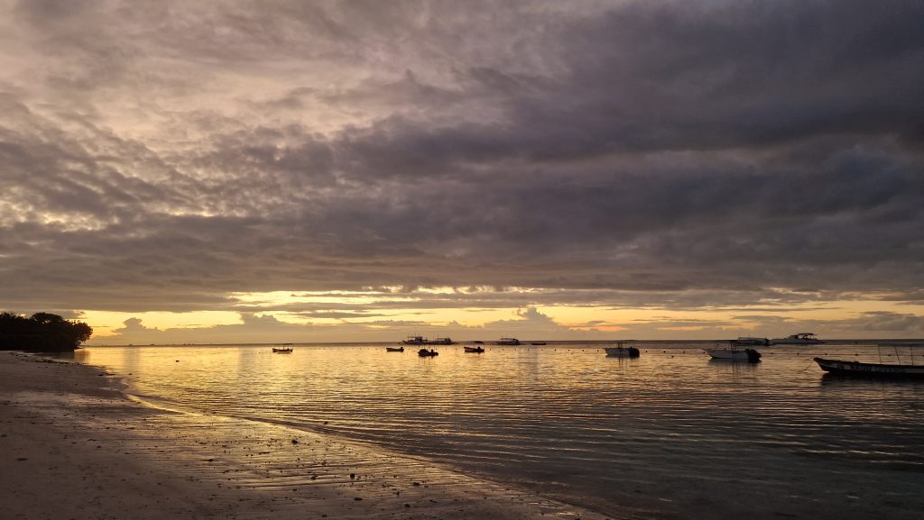 Die restlichen Tage auf Panglao verbringen wir am Strand. Das Wetter ist beständiger geworden, aber auch heißer. In der prallen Sonne fühlt man sich sprichwörtlich wie im Backofen. Wir freuen uns über jede Wolke – kaum zu glauben. Eigentlich wollten wir auch einmal bei Sonnenaufgang schwimmen gehen, bevor es so warm wird und die ganzen Verkäufer den Strand entlang laufen. Morgens um sechs ist aber Ebbe und man kann nur knietief ins Wasser laufen, bevor man das Seegras (und die Seeigel) erreicht. Es bleibt also ein normales (wasserfreies) Sonnenaufgangserlebnis.