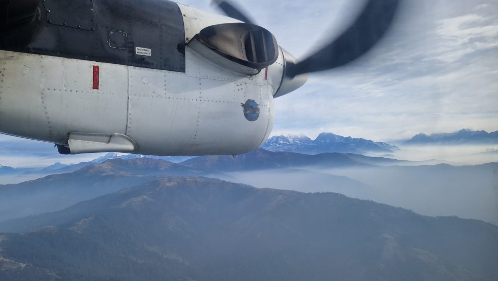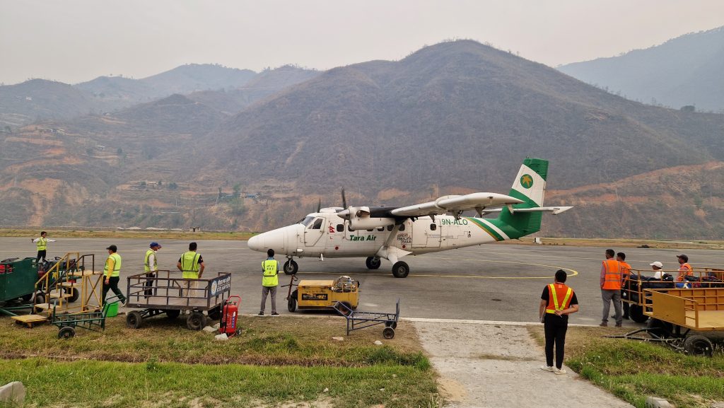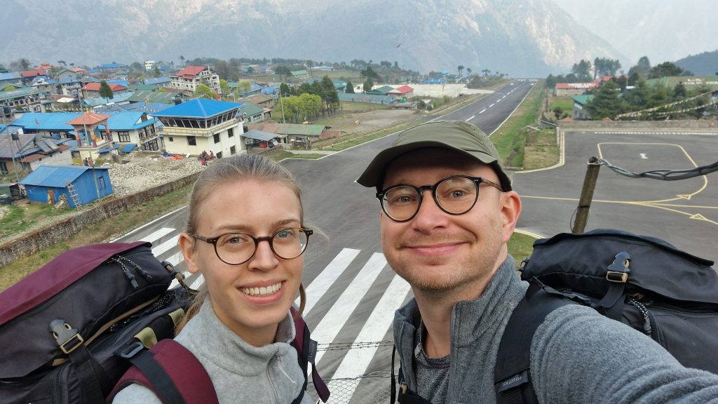 Die Abfahrtszeit wurde, von zuerst halb drei Uhr nachts, schrittweise vorverlegt auf halb zwei und am Ende ist der Fahrer schon Viertel nach eins da. Das Auto ist sehr neu, ein Elektroauto (hätte ich hier in Anbetracht des instabilen Stromnetzes gar nicht erwartet). Leider fährt noch eine andere Person mit, sodass wir uns zu dritt auf die schmale Rückbank qetschen müssen. Um diese Uhrzeit ist naturgemäß wenig Verkehr, aber unser Fahrer drängelt rücksichtslos, wenn gelegentlich andere Fahrzeuge auftauchen. Die Straße führt immer schmaler und kurviger den Berg hinauf, der Asphalt ist längst verschwunden. Stellenweise gleicht der Anblick mehr Baugrube als Fahrbahn. Noch immer rast der Fahrer viel zu schnell durch die Schlaglöcher. Wir sind müde, durchgeschüttelt und heilfroh, als wir endlich ankommen – eine Stunde früher als vorgesehen. Das Flughafengelände ist noch verschlossen. Seit einiger Zeit fungiert Ramechhap als Abflughafen Richtung Lukla, weil man hier flexibler, als im weiter entfernten Kathmandu, auf Wetterumschwünge am Ziel reagieren kann. Als wir endlich eingecheckt sind, steigt meine Nervosität. Ich habe keine Flugangst, aber die Aussicht auf Landung auf dem angeblich gefährlichsten Flughafen der Welt lässt mich nicht ganz kalt. Alle schauen gespannt zu, wie die ersten drei Maschinen abheben. Dann sind wir dran. Knapp 15 Leute passen in die Twin Otter, es ist ziemlich eng und laut. Das ganze Tal hängt voll Nebel oder Smog, aber der Flug ist überraschend ruhig. Wer am richtigen Fenster sitzt, kann die schneebedeckten Himalaya-Gipfel schon sehen. Häuser tauchen neben uns auf, Sekunden später setzt das Flugzeug auf und fährt in einer schwungvollen Kurve vor das Flughafengebäude. Alles gut gegangen. Wir atmen erstmal durch, genießen den Blick über die berüchtigte Landebahn und die Berge dahinter. Nach dem Frühstück geht es endlich los: Elf Tage (oder mehr) zu Fuß durchs Gebirge, bis zum Everest Basecamp und wieder zurück.