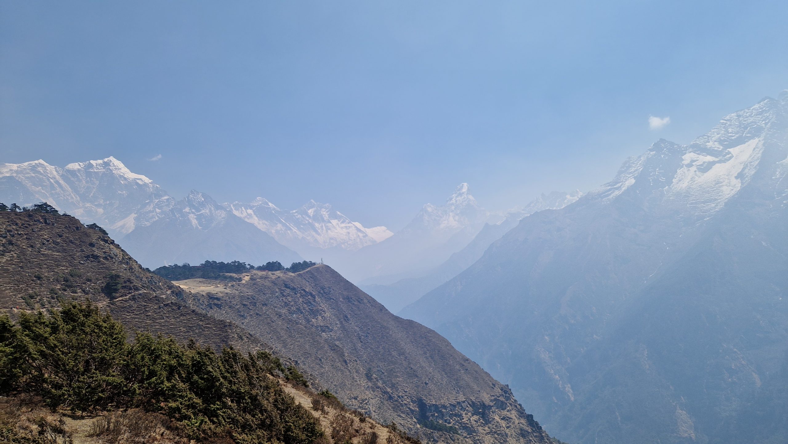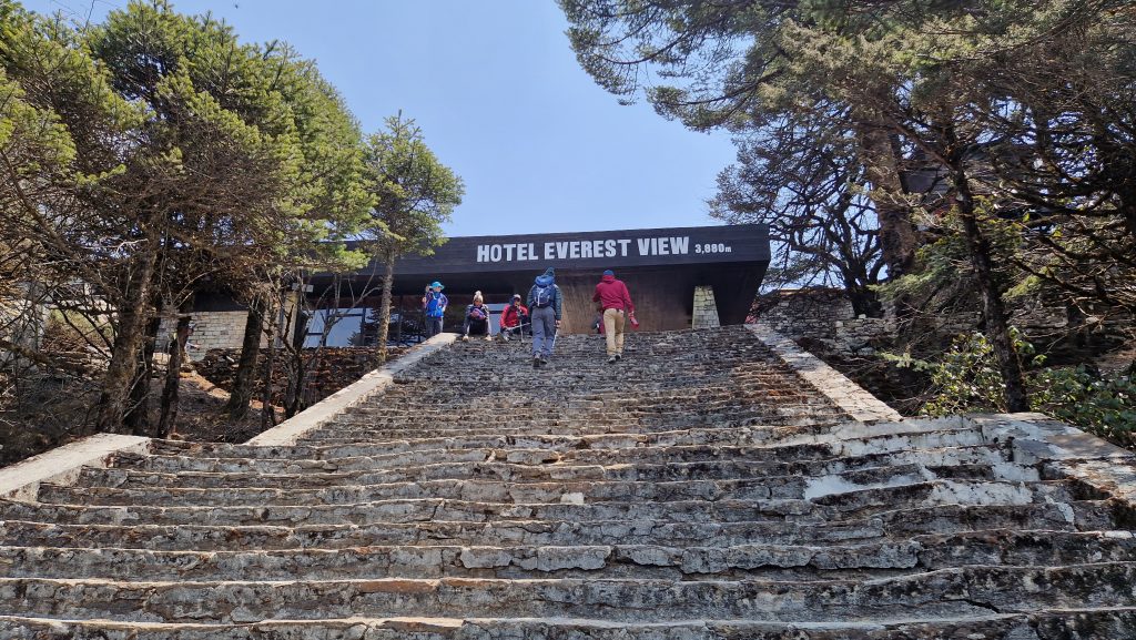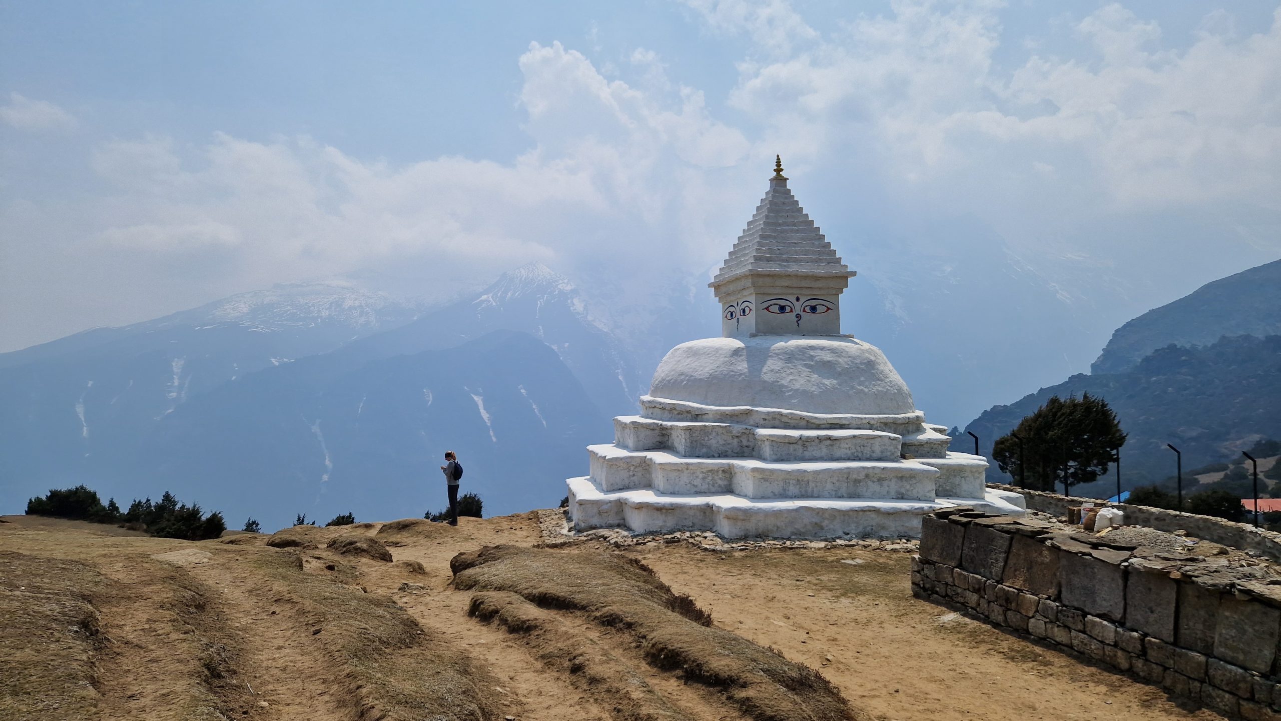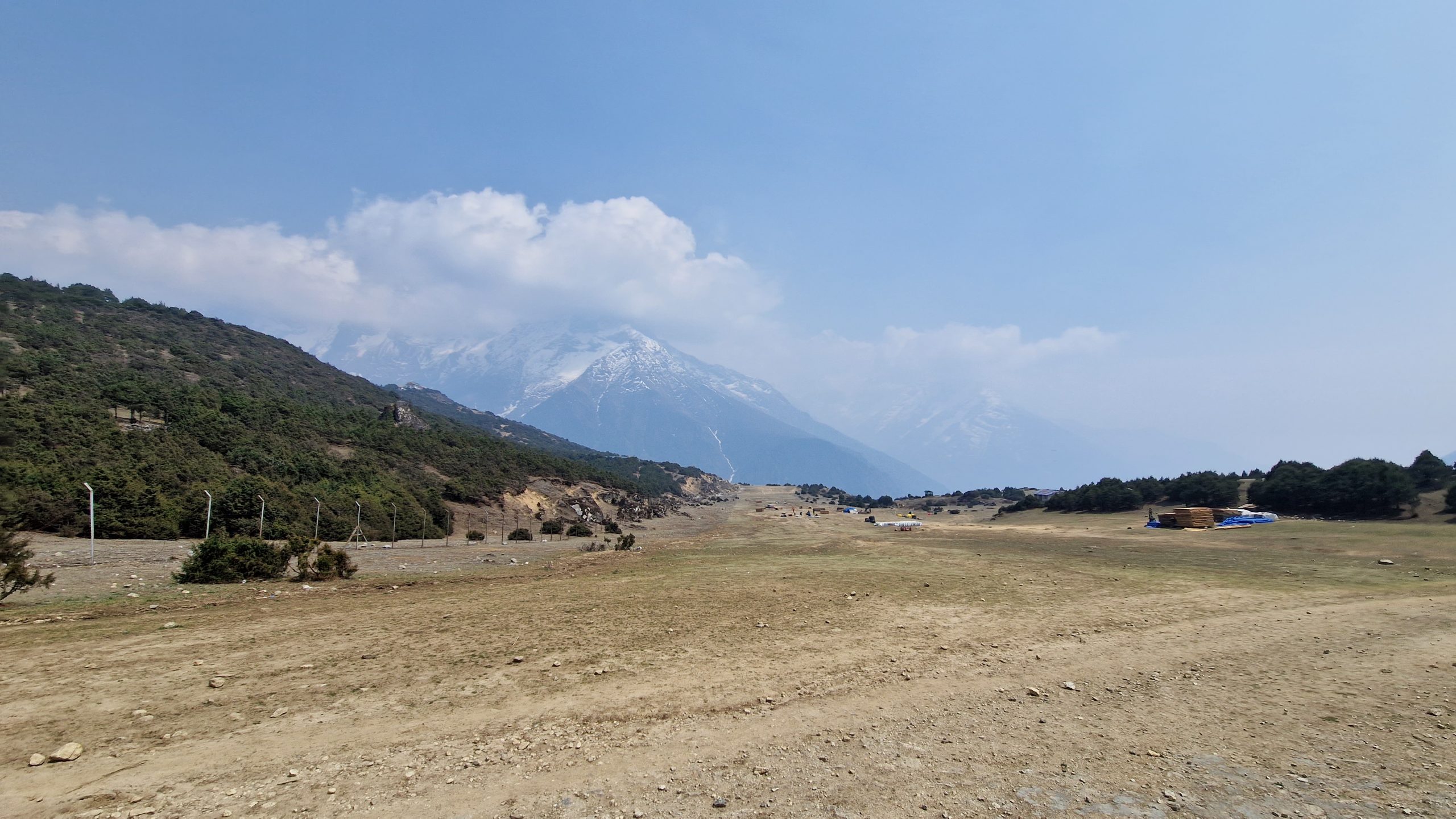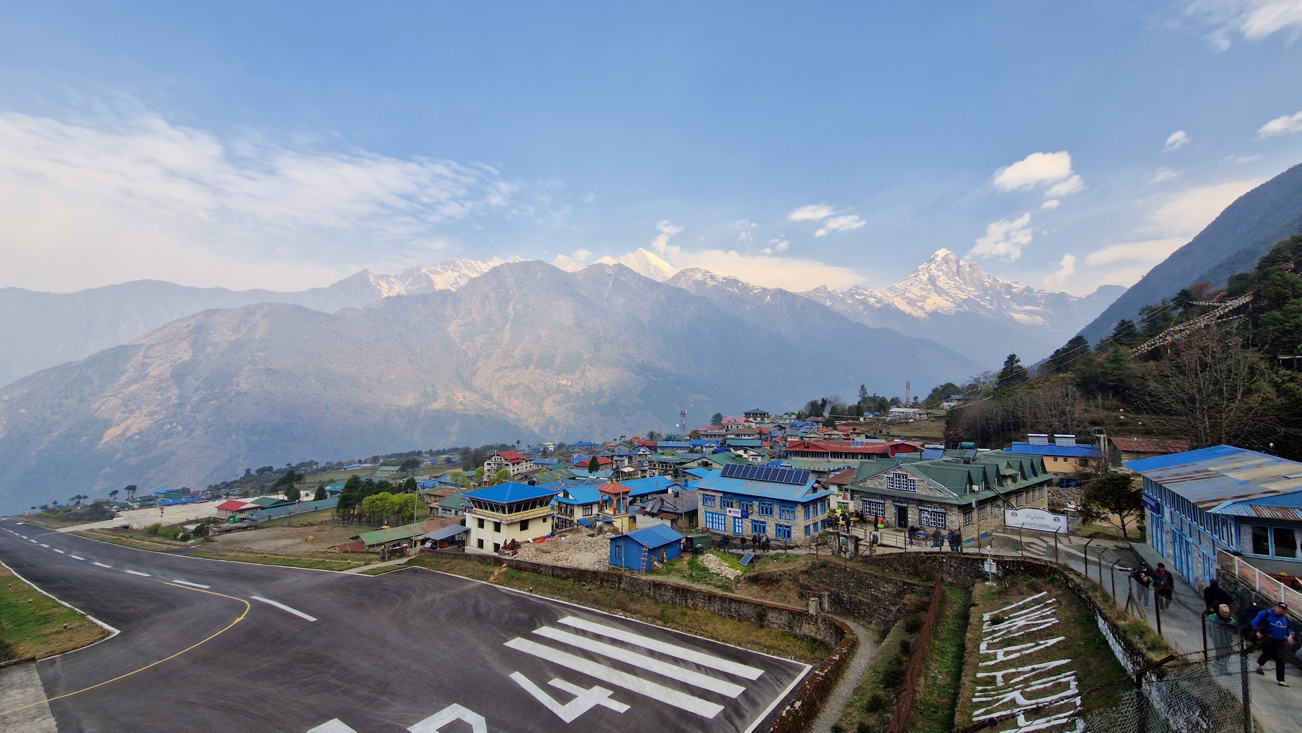 Am Morgen ist die Sicht, wie immer, viel klarer als am Nachmittag. Für heute ist nur ein Tagesausflug geplant. 400m oberhalb der Stadt liegt das Hotel Everest View, dorthin laufen wir und genießen von der Terrasse aus das Bergpanorama. Jetzt ist der Mount Everest bzw. seine Spitze auch wirklich deutlich erkennbar. Außerdem sieht man die markant geformte Ama Dablam, deren Anblick uns noch mehrere Tage begleiten wird. In dem kleinen Dorf Khumjung bestellen wir Masala Tee und Kuchen, bevor wir den Rückweg antreten. Dabei kommen wir an einem alten Flughafen vorbei, der wohl zu gefährlich für regulären Betrieb ist.