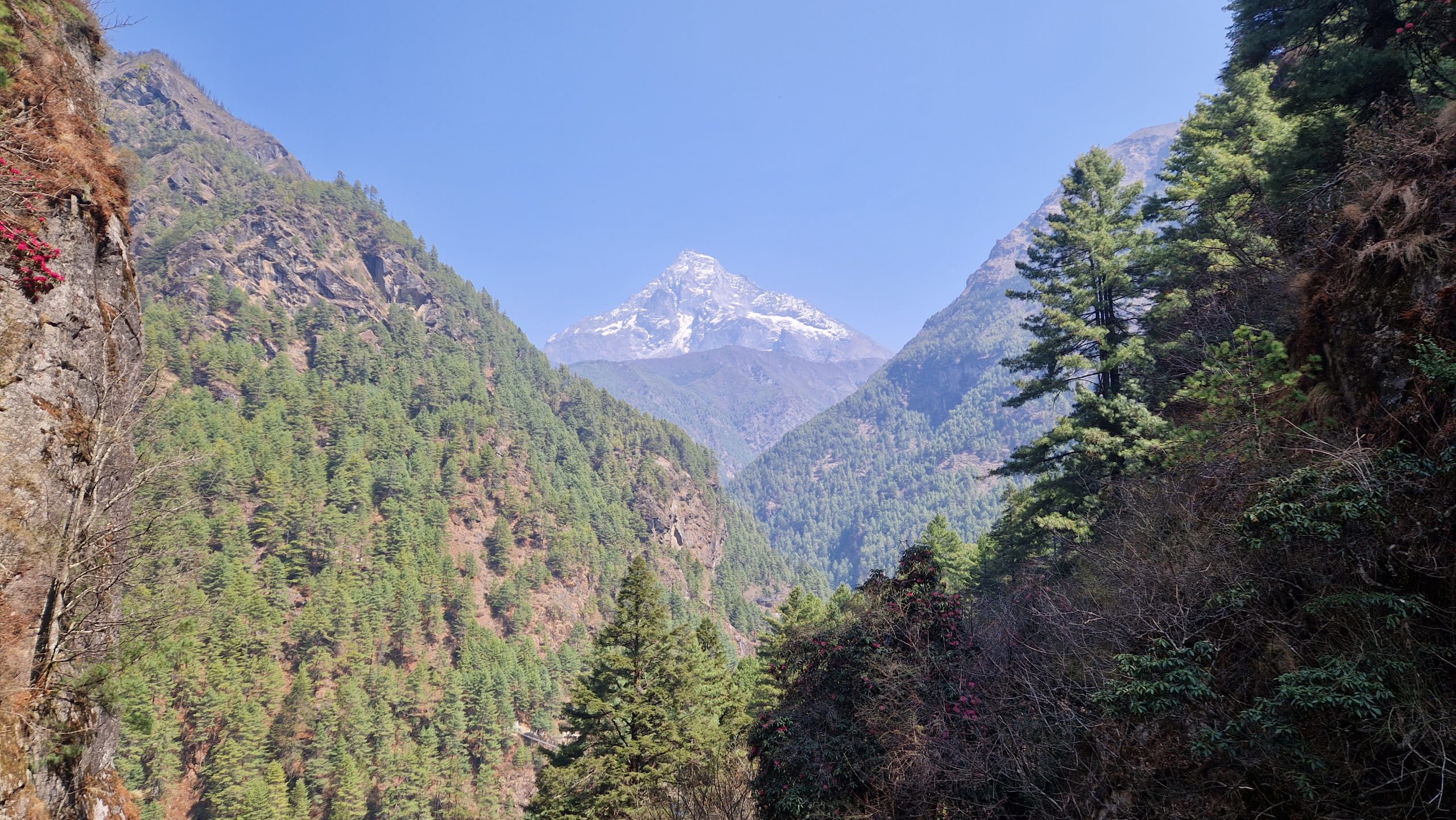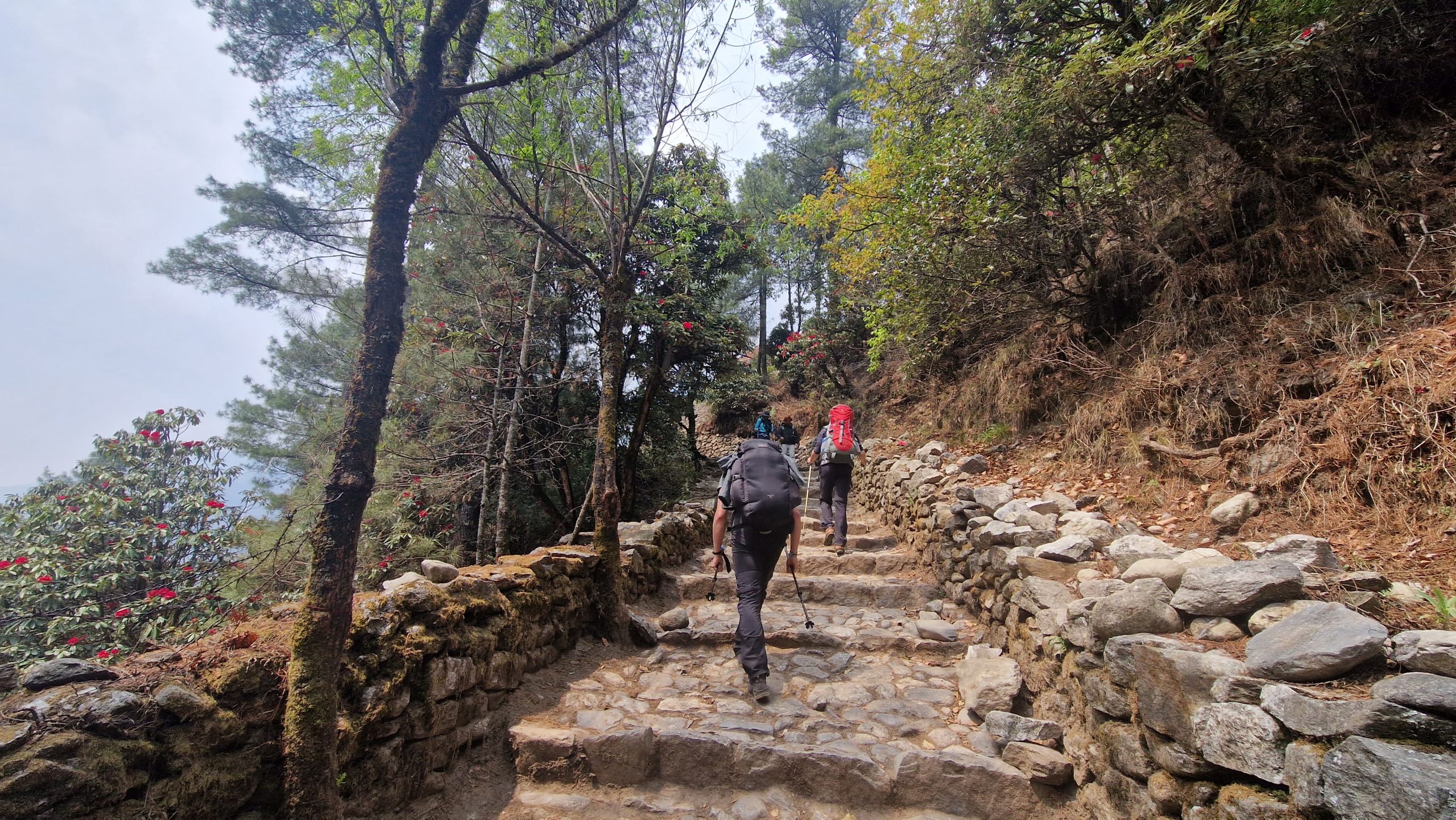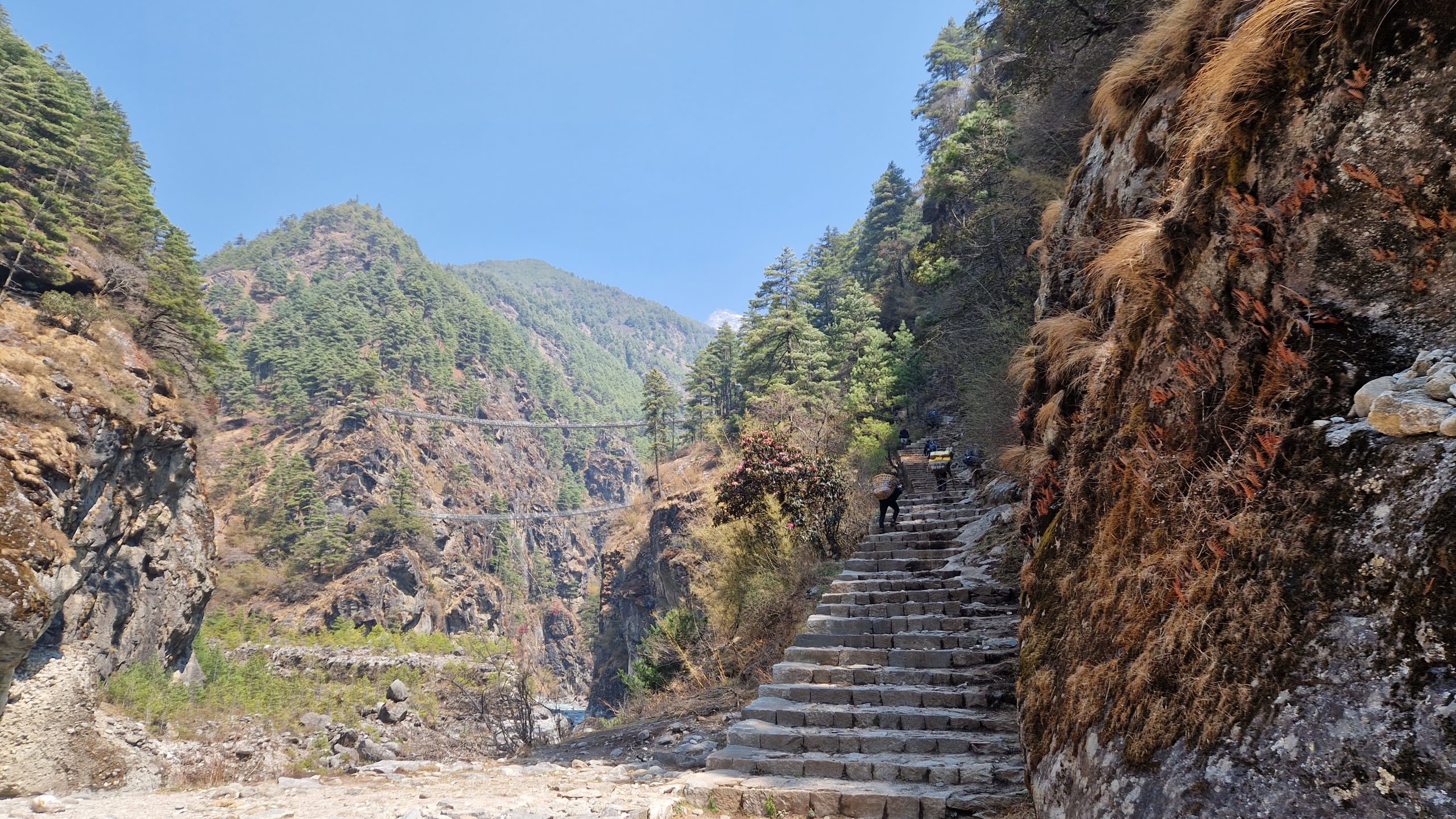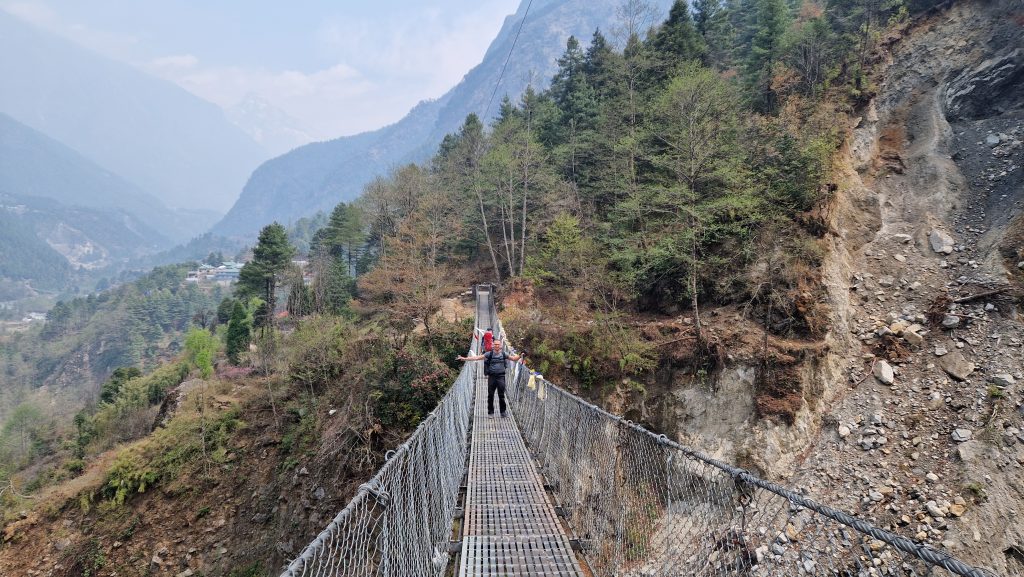 Da unser Ziel im Sagarmatha Nationalpark liegt, müssen wir Permits für die Wanderung kaufen. Nach einer halben Stunden warten am Schalter (direkt hinter Lukla), hat sich die Schlange immer noch nicht verkürzt, deswegen beschließen wir weiter zu laufen. Angeblich kann man das in einem späteren Ort nachholen. Die Temperatur ist angenehm. Es geht moderat bergauf und bergab, an blühenden Rhododendren vorbei. Nur auf die Füße muss man achten, sonst stolpert man leicht auf den groben Steinblöcken, aus denen der Weg besteht. Religion scheint hier eine wichtige Rolle zu spielen, entlang des Weges befinden sich Chörten und Gebetsmühlen und unzählige Manisteine. Nach etwa einer Stunde laufen, erreichen wir die erste Hängebrücke (es gibt viele hier). Nach dem Mittagessen (es gibt eine erstaunlich große Auswahl an Gerichten) beginnt es zu regnen, wir suchen uns deswegen schon kurz vor Monjo eine Unterkunft für die Nacht. Die Teehäuser, wie sie hier genannt werden, vermieten einfache Doppelzimmer (teils mit Bad) für wenig Geld, dafür wird erwartet, dass man dort zu Abend isst. Die Zimmer in diesem hier sind hübsch, es riecht nach frischem Holz, aber wir sind die einzigen Gäste und die Stube ist nicht geheizt (wie es normalerweise der Fall ist), deshalb gehen wir früh ins Bett.