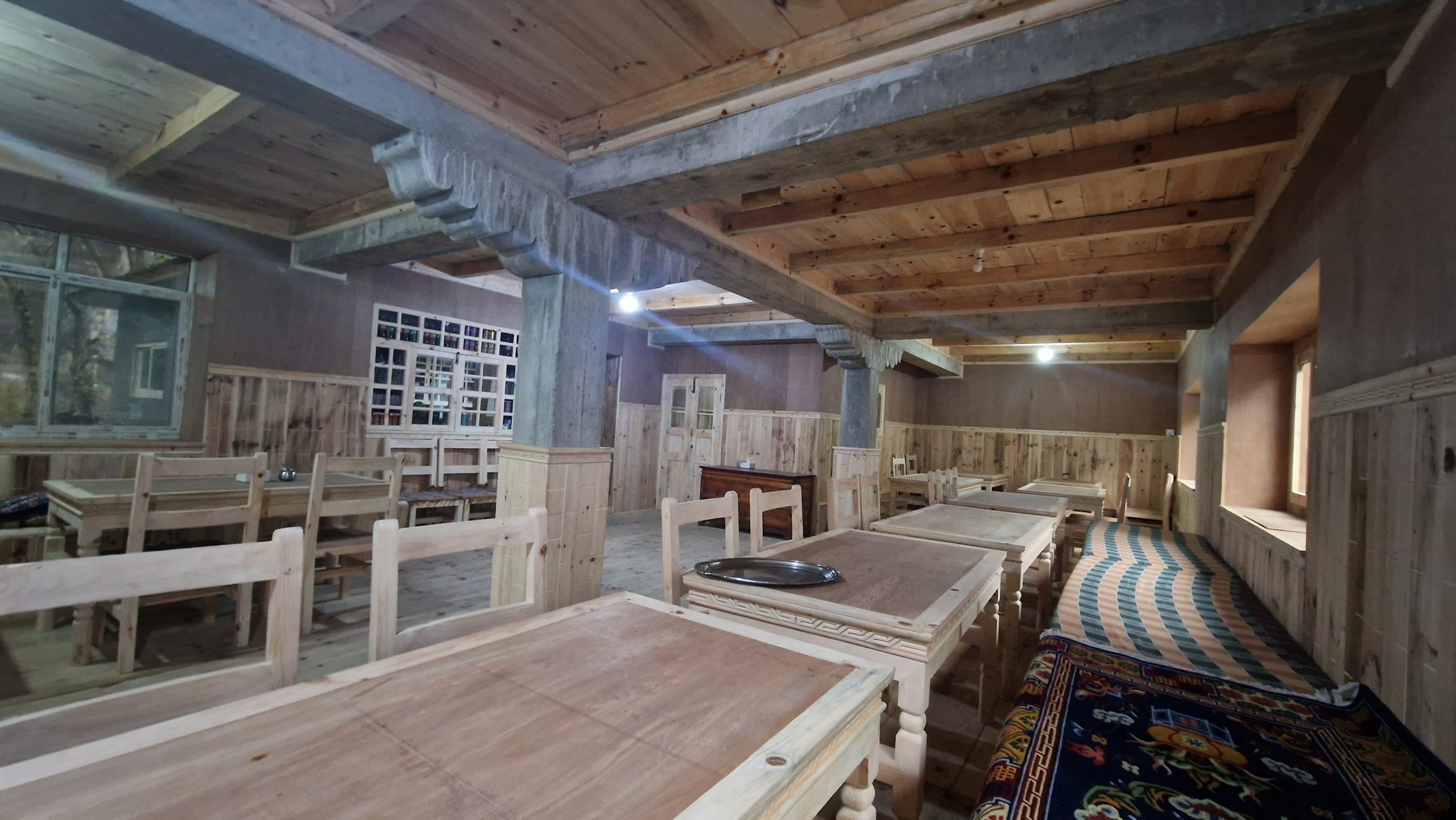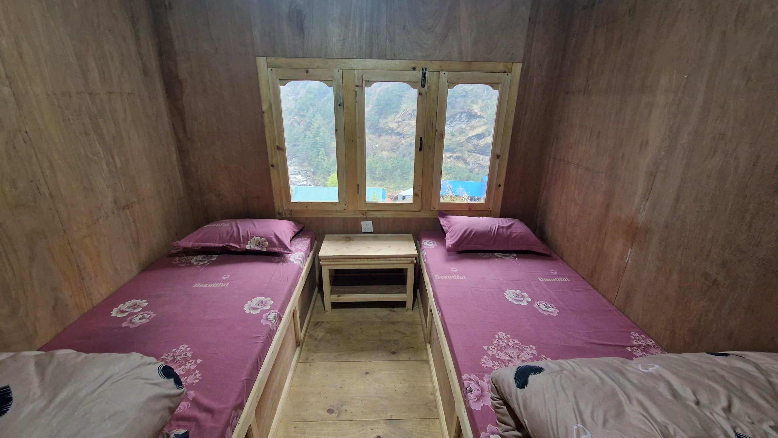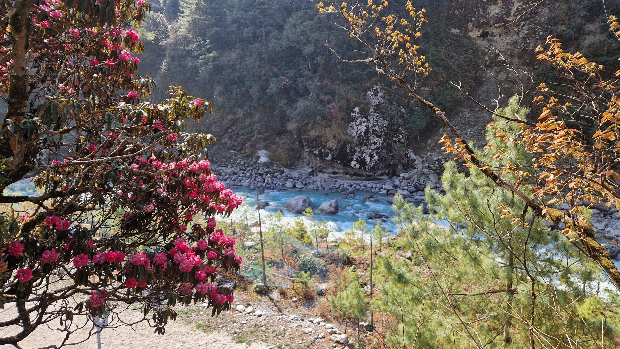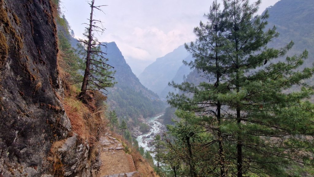 Da unser Ziel im Sagarmatha Nationalpark liegt, müssen wir Permits für die Wanderung kaufen. Nach einer halben Stunden warten am Schalter (direkt hinter Lukla), hat sich die Schlange immer noch nicht verkürzt, deswegen beschließen wir weiter zu laufen. Angeblich kann man das in einem späteren Ort nachholen. Die Temperatur ist angenehm. Es geht moderat bergauf und bergab, an blühenden Rhododendren vorbei. Nur auf die Füße muss man achten, sonst stolpert man leicht auf den groben Steinblöcken, aus denen der Weg besteht. Religion scheint hier eine wichtige Rolle zu spielen, entlang des Weges befinden sich Chörten und Gebetsmühlen und unzählige Manisteine. Nach etwa einer Stunde laufen, erreichen wir die erste Hängebrücke (es gibt viele hier). Nach dem Mittagessen (es gibt eine erstaunlich große Auswahl an Gerichten) beginnt es zu regnen, wir suchen uns deswegen schon kurz vor Monjo eine Unterkunft für die Nacht. Die Teehäuser, wie sie hier genannt werden, vermieten einfache Doppelzimmer (teils mit Bad) für wenig Geld, dafür wird erwartet, dass man dort zu Abend isst. Die Zimmer in diesem hier sind hübsch, es riecht nach frischem Holz, aber wir sind die einzigen Gäste und die Stube ist nicht geheizt (wie es normalerweise der Fall ist), deshalb gehen wir früh ins Bett.