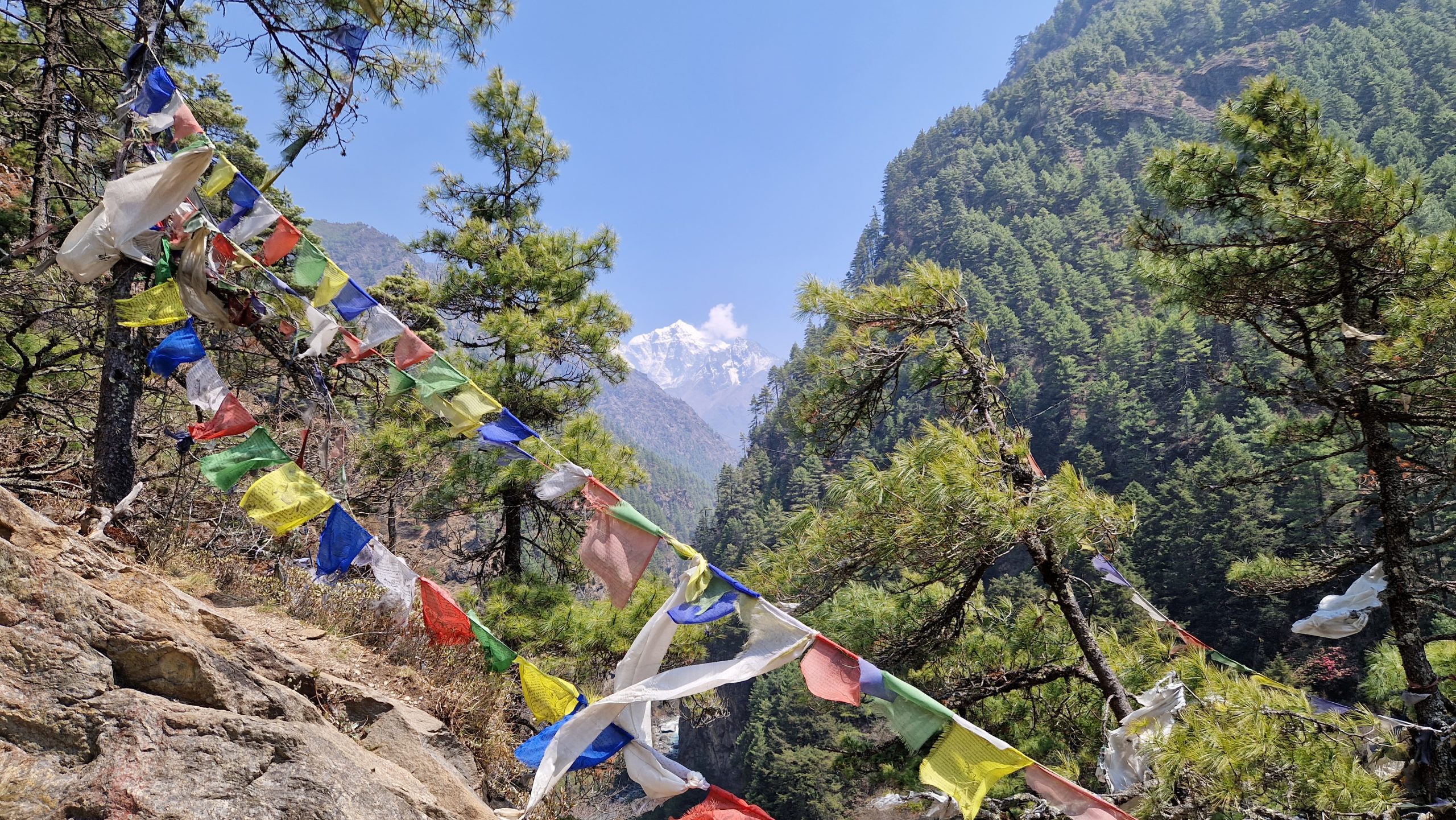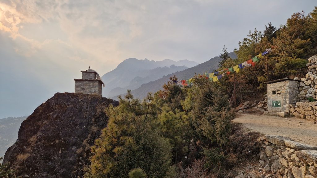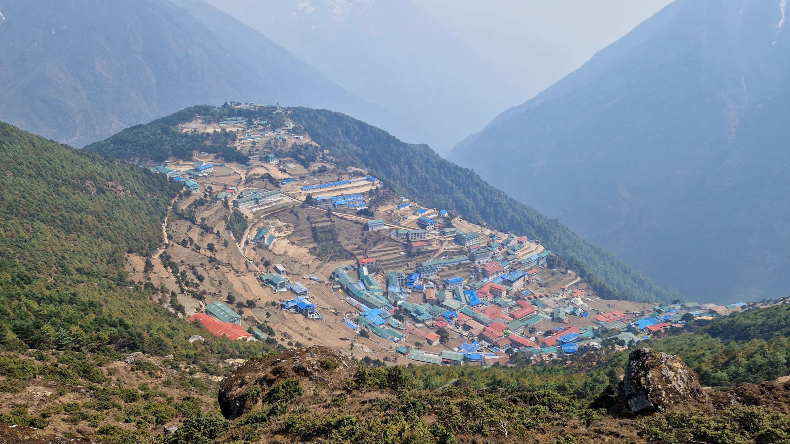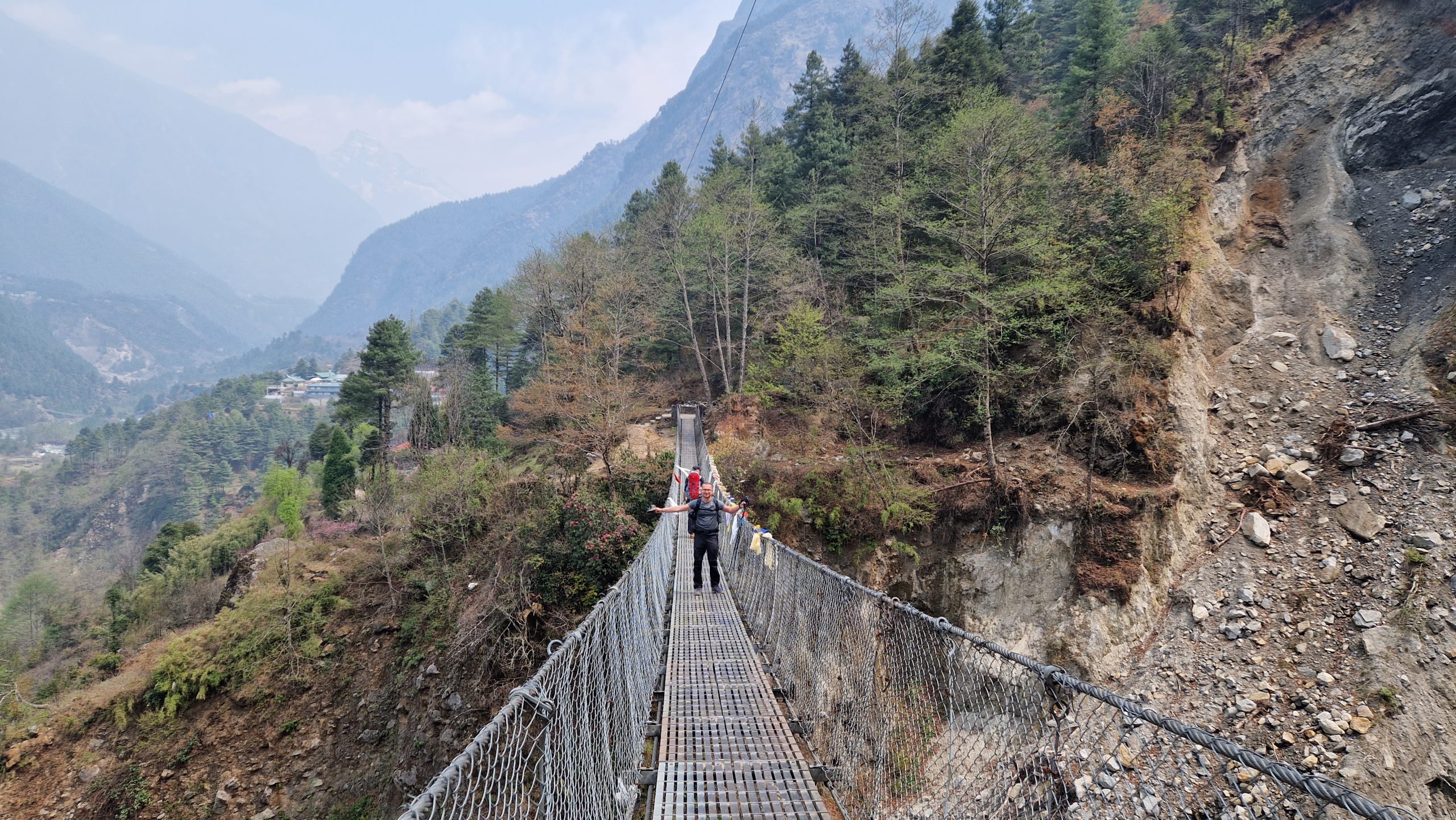 Der nächste Tag beginnt mit Sonnenschein und weiteren Hängebrücken. Nach einer knappen Stunde erreichen wir das Eingangstor zum Beyul Khumbu, eine Art heiliges, verstecktes Tal. Hier lebt die Volksgruppe der Sherpas. Es markiert gleichzeitig die Grenze des Nationalparks. Wir steigen eine Weile abwärts, bis wir neben dem Dhudh Kosi Fluss her laufen. Dann beginnt der anstrengende Teil der Etappe. Über Treppen und enge Kehren geht es steil bergauf. Zuerst bis zur markanten Hillary Bridge, von wo aus man einen ersten tollen Blick in Richtung unseres Ziels hat. Dann weiter zum Everst Viewpoint (ich hab ihn nicht sehen können). Auf dem letzten Stück bis Namche Bazaar verlassen mich die Kräfte, ich bin froh als wir ankommen. Wir laden unser Gepäck ab und gehen mittagessen. Danach quälen wir uns noch ein paar Meter weiter hoch zu einem kleinen Aussichtspunkt, man soll ja immer höher laufen, als man später schläft, um sich besser an die Höhenluft zu gewöhnen. Besonders gut geht es uns heute allen nicht (Kopfschmerzen). Die 3400m machen sich schon bemerkbar.