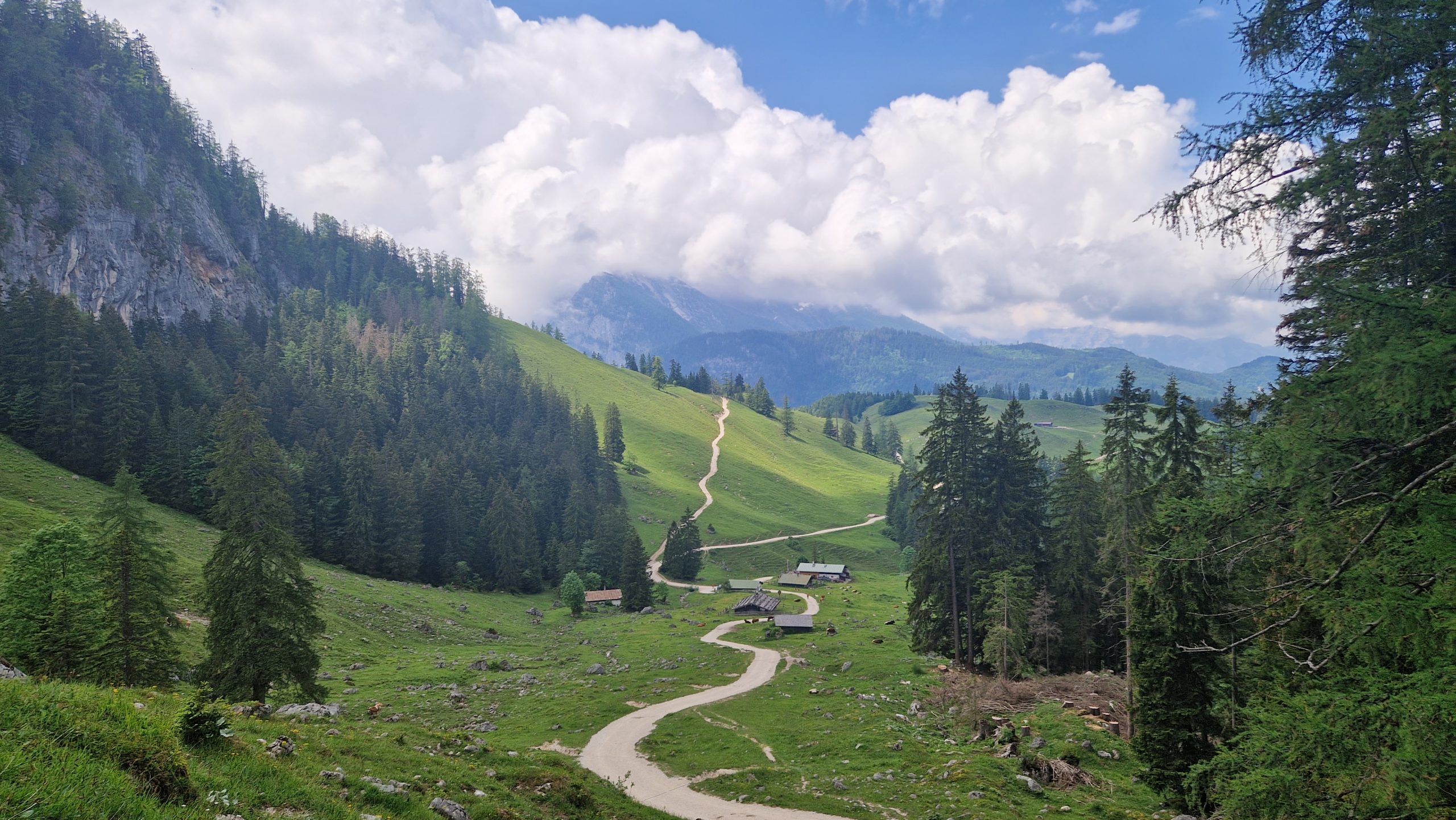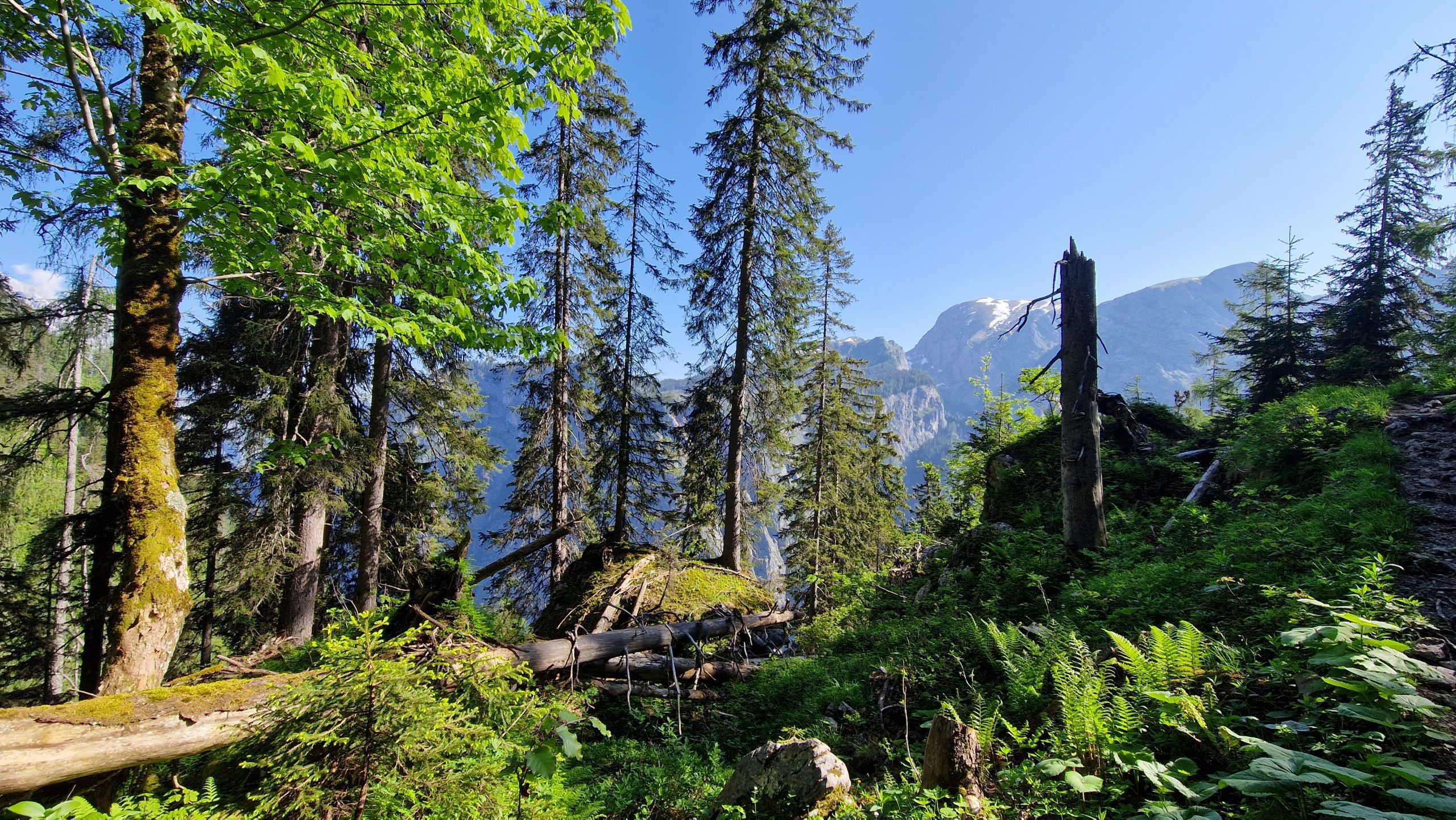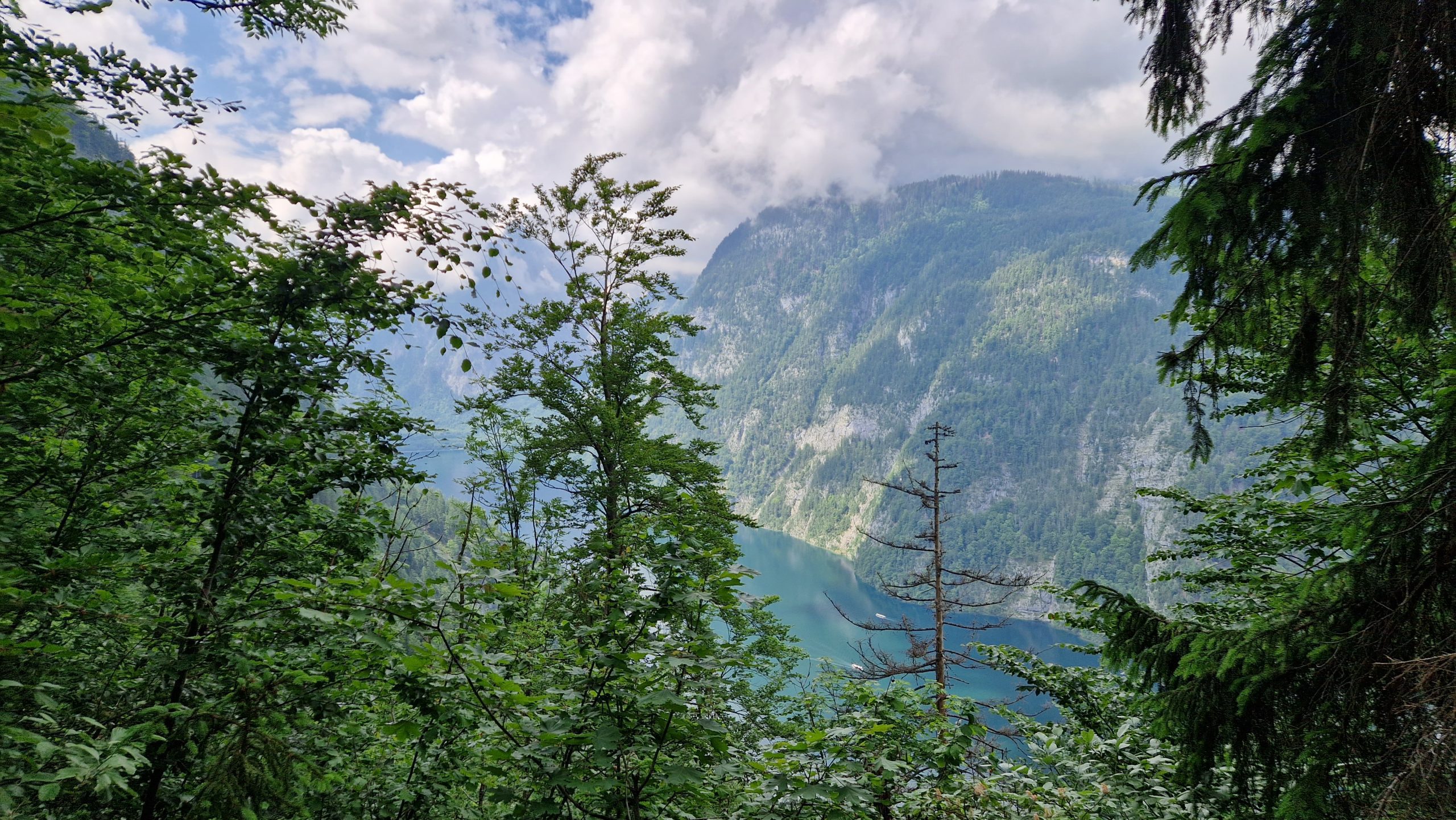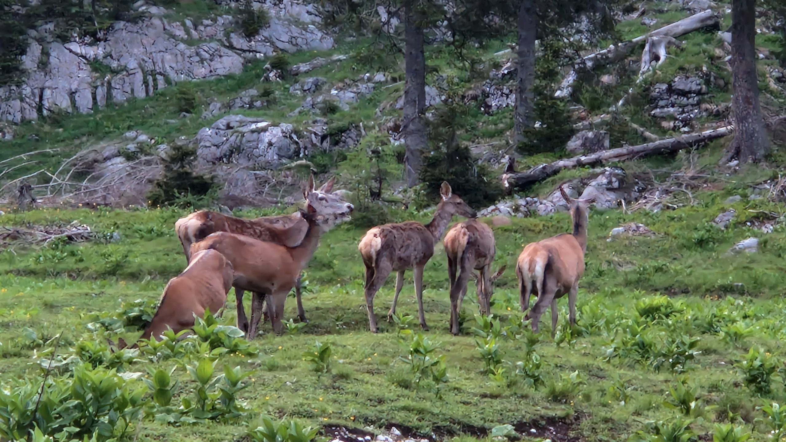 Nach langem Hin und Her haben wir es uns anders überlegt. Der Schneibstein sieht von hier zwar schneefrei aus, wir sind aber unsicher, was den Abstieg auf der schattigeren Rückseite angeht. Also nehmen wir den Weg ohne Aussicht, der weiter unten entlang führt. Nach einem reichhaltigen Frühstücksbuffet geht es los, erstmal bergab. Mir gefällt der schmale Pfad, der uns zwischen Bäumen hindurch und über eine sumpfige Blumenwiese führt. Eine Stunde lang sehen wir niemanden sonst. Mit dem Watzmann immer im Blick laufen wir weiter. Vom Feuerpalfen aus schauen wir auf den Königssee tief unter uns. Ganz in der Nähe befindet sich die Gotzenalm, der perfekte Platz fürs Mittagessen. In der Ferne sehen wir schon das Steinerne Meer, leider überwiegend schneebedeckt. Man merkt zunehmend, dass wir uns in einem Nationalpark befinden. Abgestorbene Bäume bleiben einfach an Ort und Stelle stehen bzw. liegen. Es fliegen auch viel mehr Insekten herum. Wir gehen lange bergab, langsam fangen die Füße an weh zu tun. Der eigentliche Anstieg liegt noch vor uns. Jetzt kommt der Obersee in Sicht. Der Hang neben uns stürzt gefährlich steil nach unten ab. Nach einer weiteren Stunde erreichen wir erschöpft die Wasseralm, genau pünktlich zum Abendessen. Als es dämmrig wird, taucht nur wenige Meter entfernt eine Gruppe Rehe auf und lockt die Wanderer kurz nach draußen.