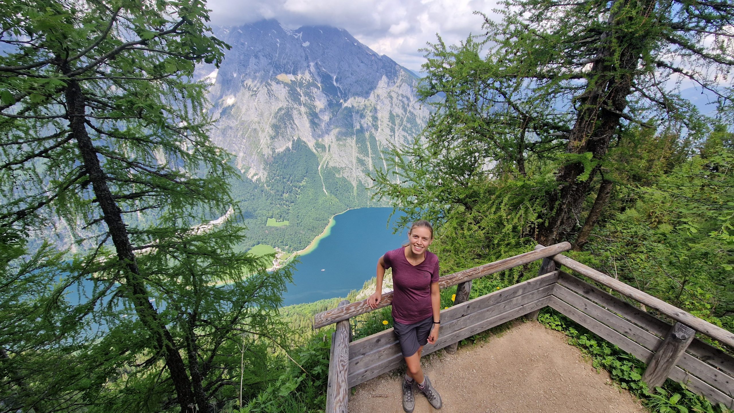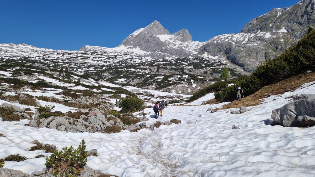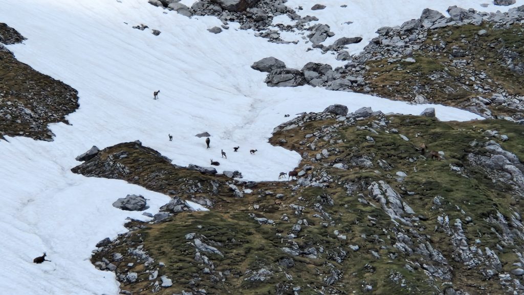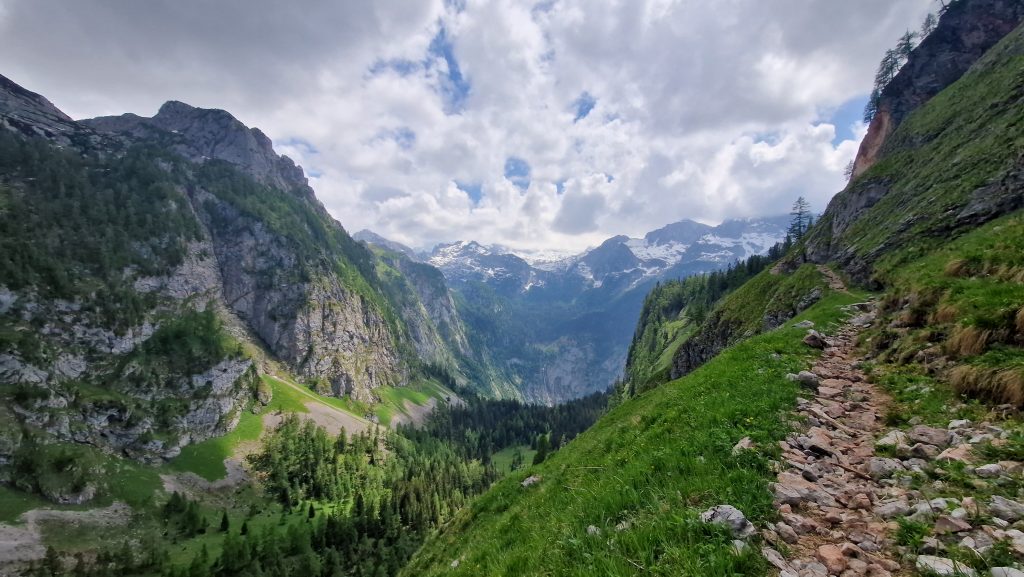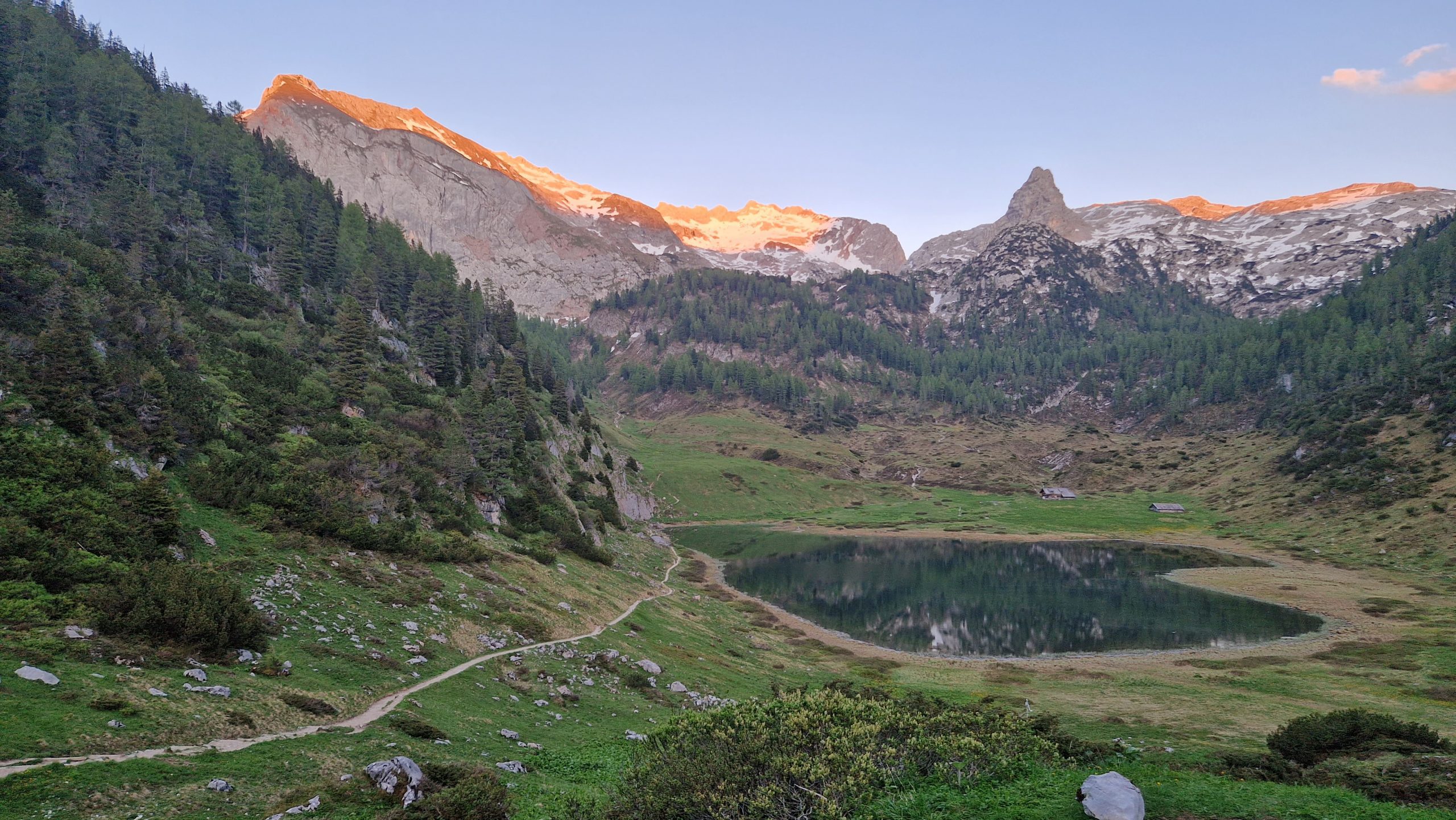 Nach langem Hin und Her haben wir es uns anders überlegt. Der Schneibstein sieht von hier zwar schneefrei aus, wir sind aber unsicher, was den Abstieg auf der schattigeren Rückseite angeht. Also nehmen wir den Weg ohne Aussicht, der weiter unten entlang führt. Nach einem reichhaltigen Frühstücksbuffet geht es los, erstmal bergab. Mir gefällt der schmale Pfad, der uns zwischen Bäumen hindurch und über eine sumpfige Blumenwiese führt. Eine Stunde lang sehen wir niemanden sonst. Mit dem Watzmann immer im Blick laufen wir weiter. Vom Feuerpalfen aus schauen wir auf den Königssee tief unter uns. Ganz in der Nähe befindet sich die Gotzenalm, der perfekte Platz fürs Mittagessen. In der Ferne sehen wir schon das Steinerne Meer, leider überwiegend schneebedeckt. Man merkt zunehmend, dass wir uns in einem Nationalpark befinden. Abgestorbene Bäume bleiben einfach an Ort und Stelle stehen bzw. liegen. Es fliegen auch viel mehr Insekten herum. Wir gehen lange bergab, langsam fangen die Füße an weh zu tun. Der eigentliche Anstieg liegt noch vor uns. Jetzt kommt der Obersee in Sicht. Der Hang neben uns stürzt gefährlich steil nach unten ab. Nach einer weiteren Stunde erreichen wir erschöpft die Wasseralm, genau pünktlich zum Abendessen. Als es dämmrig wird, taucht nur wenige Meter entfernt eine Gruppe Rehe auf und lockt die Wanderer kurz nach draußen.