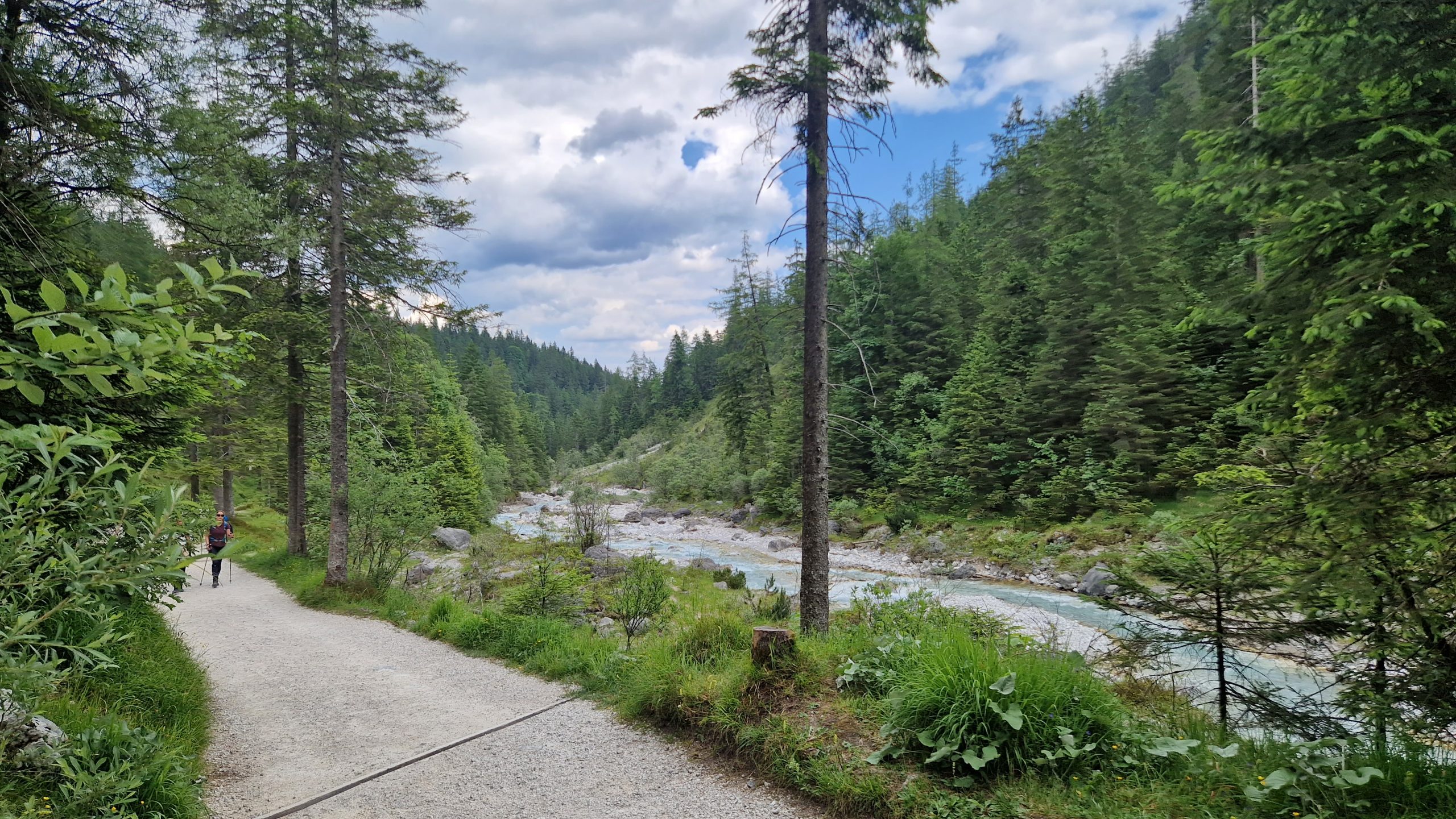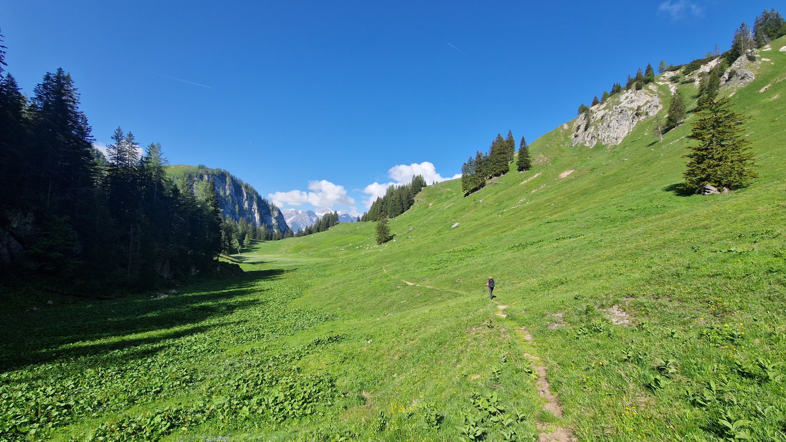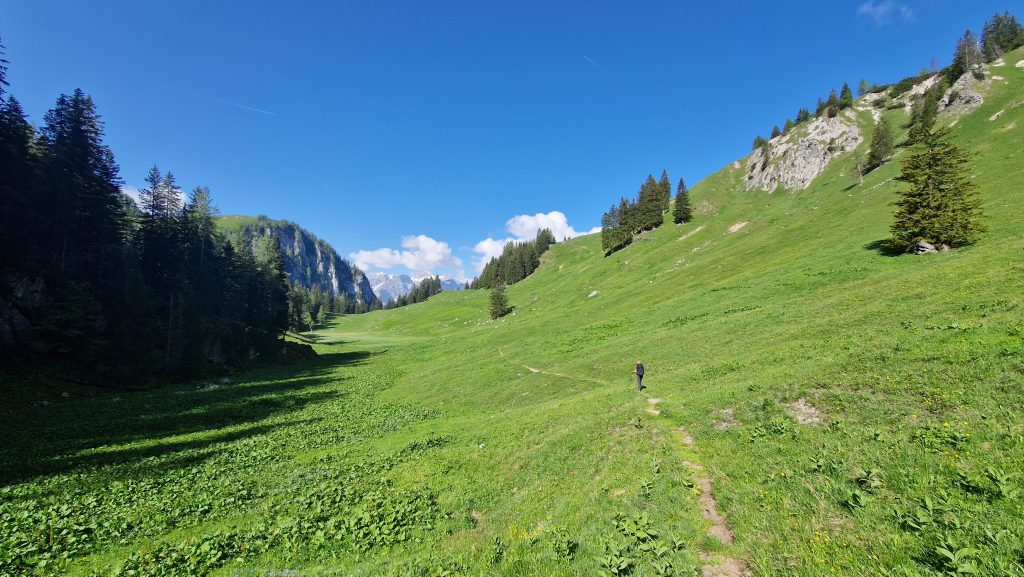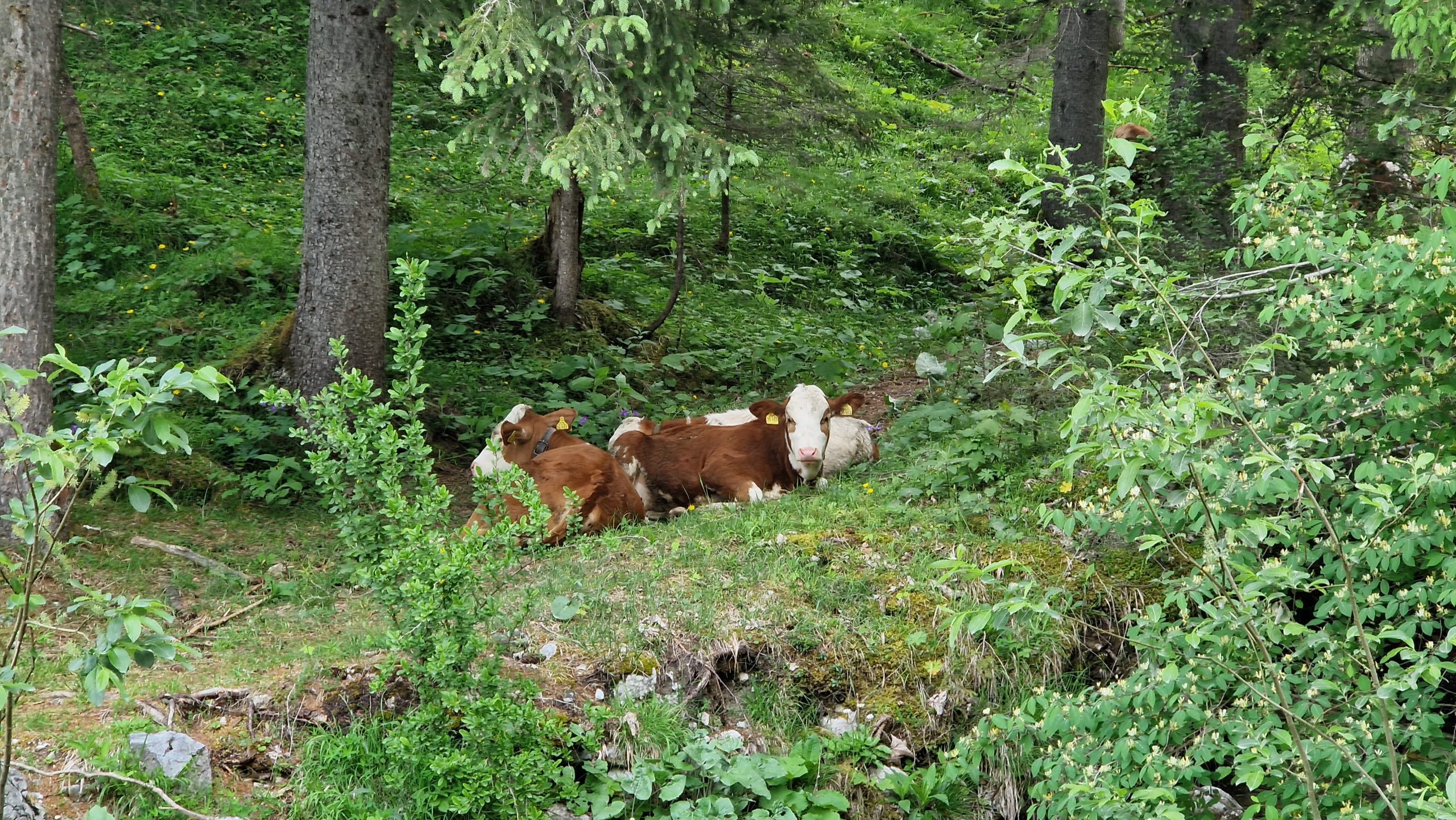 Nach langem Hin und Her haben wir es uns anders überlegt. Der Schneibstein sieht von hier zwar schneefrei aus, wir sind aber unsicher, was den Abstieg auf der schattigeren Rückseite angeht. Also nehmen wir den Weg ohne Aussicht, der weiter unten entlang führt. Nach einem reichhaltigen Frühstücksbuffet geht es los, erstmal bergab. Mir gefällt der schmale Pfad, der uns zwischen Bäumen hindurch und über eine sumpfige Blumenwiese führt. Eine Stunde lang sehen wir niemanden sonst. Mit dem Watzmann immer im Blick laufen wir weiter. Vom Feuerpalfen aus schauen wir auf den Königssee tief unter uns. Ganz in der Nähe befindet sich die Gotzenalm, der perfekte Platz fürs Mittagessen. In der Ferne sehen wir schon das Steinerne Meer, leider überwiegend schneebedeckt. Man merkt zunehmend, dass wir uns in einem Nationalpark befinden. Abgestorbene Bäume bleiben einfach an Ort und Stelle stehen bzw. liegen. Es fliegen auch viel mehr Insekten herum. Wir gehen lange bergab, langsam fangen die Füße an weh zu tun. Der eigentliche Anstieg liegt noch vor uns. Jetzt kommt der Obersee in Sicht. Der Hang neben uns stürzt gefährlich steil nach unten ab. Nach einer weiteren Stunde erreichen wir erschöpft die Wasseralm, genau pünktlich zum Abendessen. Als es dämmrig wird, taucht nur wenige Meter entfernt eine Gruppe Rehe auf und lockt die Wanderer kurz nach draußen.