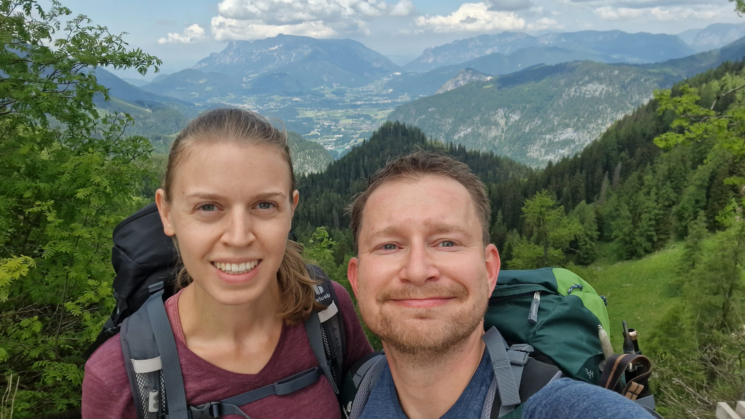 Die Fahrt zum Königssee ist ohne Auto eine kleine Weltreise für sich. Mit drei Zügen und einem Bus schaffen wir es in knapp vier Stunden zu unserem Startpunkt in der Nähe von Schönau. Das Wetter ist wunderschön. Zuerst laufen wir durch Buchenwald und erhaschen auch einen Blick auf den Königssee. Als die erste Alm auftaucht, machen wir eine Mittagspause. Jetzt geht es auf breiten Schotterwegen mal durch Fichtenwald und mal an Kuhweiden entlang. Meine Kondition lässt zu wünschen übrig. Obwohl diese erste Etappe sehr kurz und wenig anspruchsvoll ist, schleiche ich im Schneckentempo den Berg hoch. Ich bin wirklich erleichtert, als das Schneibsteinhaus in Sicht kommt. Am Nachmittag blättern wir in Ruhe in den Bergsteigermagazinen. Nach dem Abendessen genießen wir, gemeinsam mit den beiden einzigen anderen Gästen, die letzten Sonnenstrahlen auf der Terrasse. Hinter uns ragt der Schneibstein, den wir morgen besteigen wollen, auf.