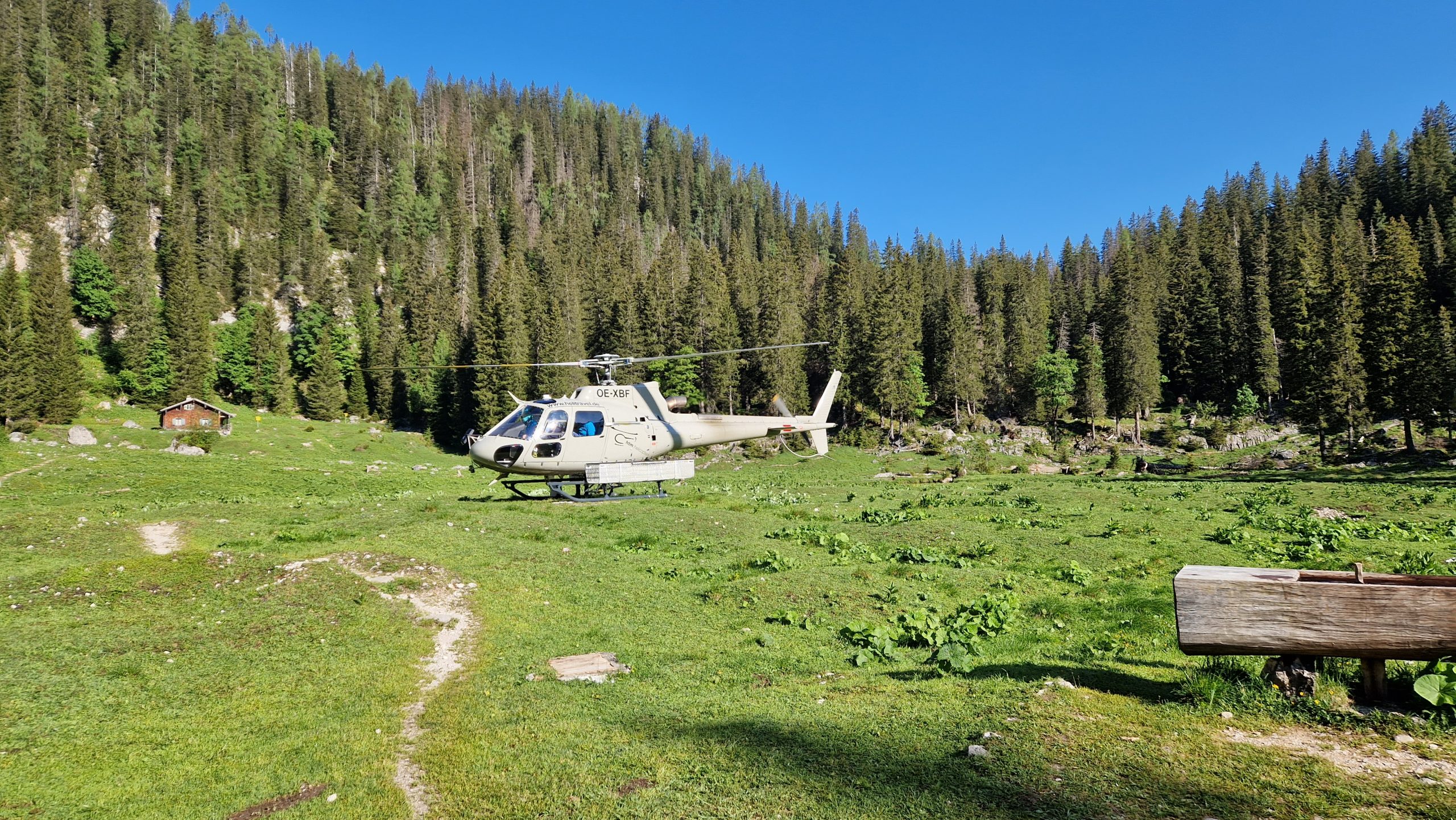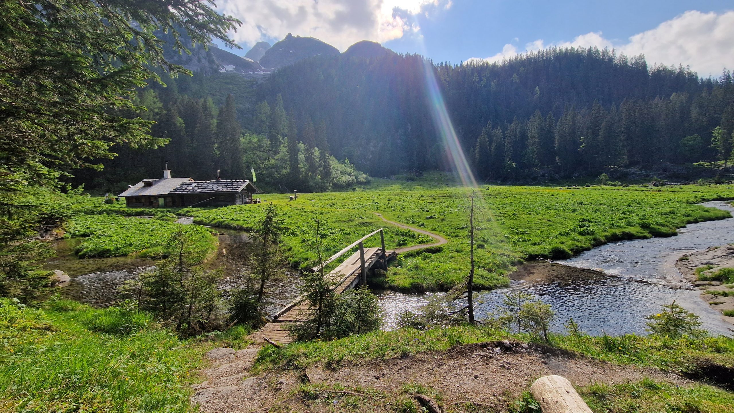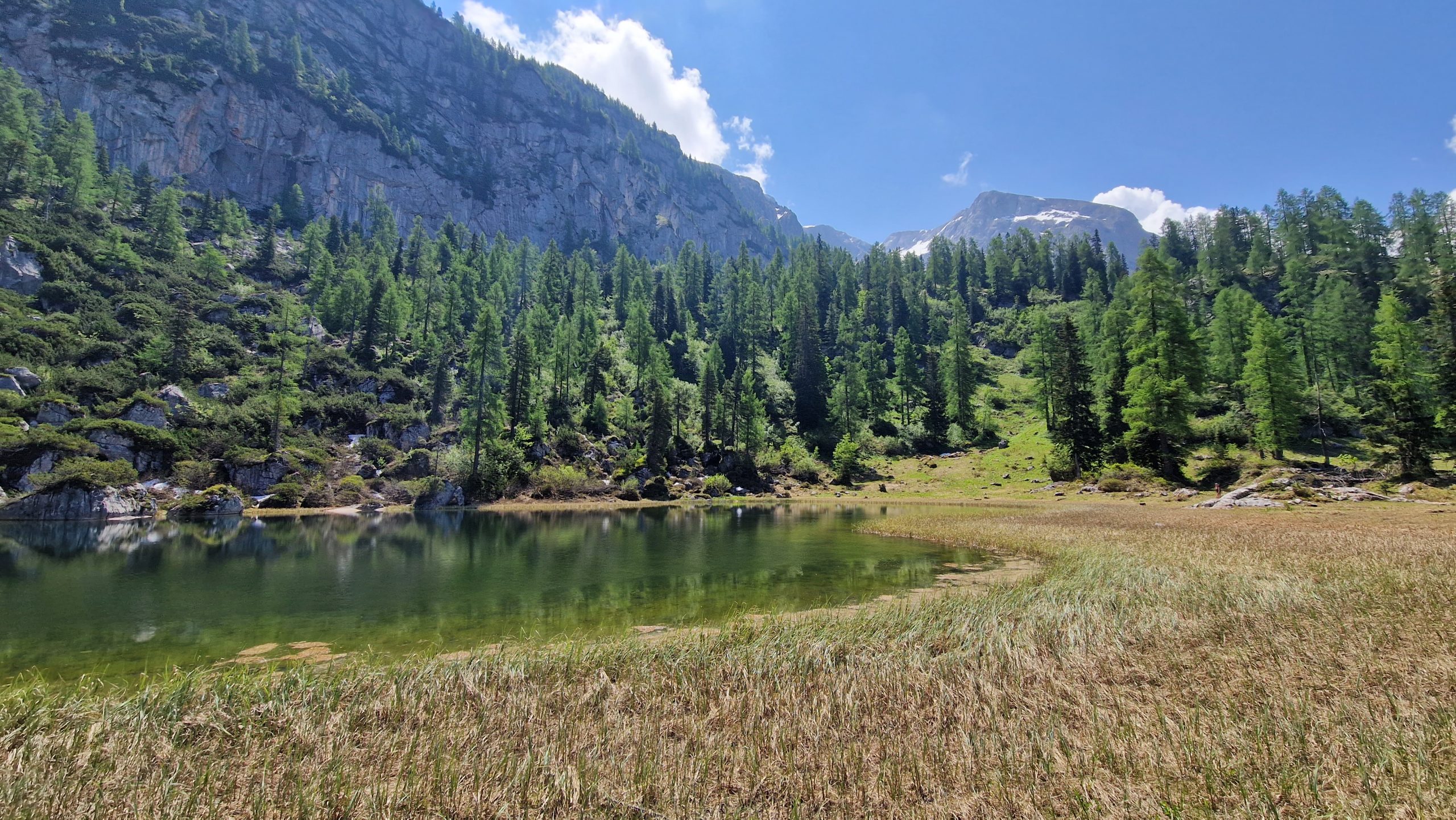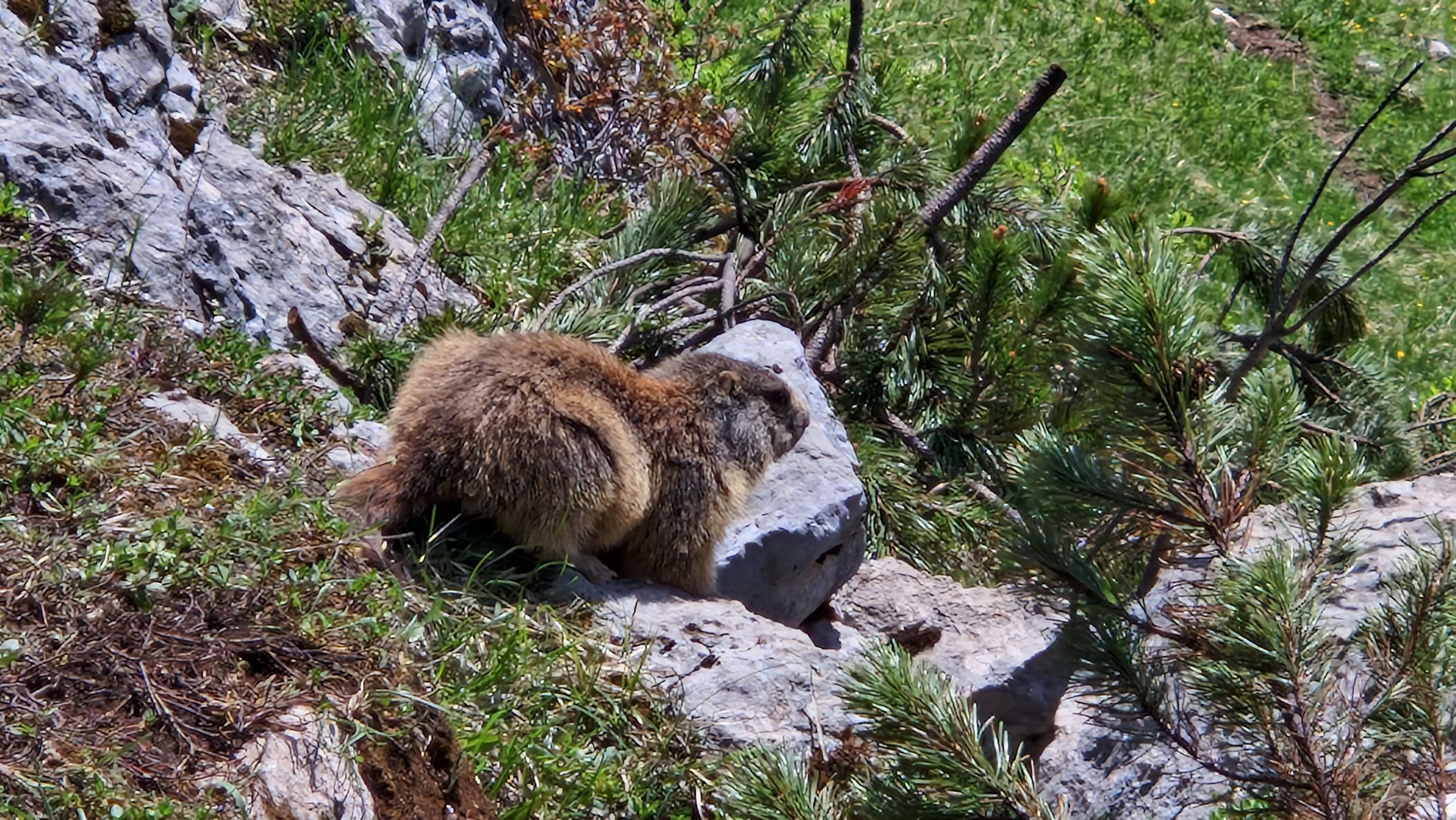 Die Alm wird einmal wöchtenlich per Hubschrauber versorgt, so auch heute. Alle schauen neugierig zu, bevor die Wanderung durch lichten Wald startet. Auf dem Halsköpfl, dem höchsten Punkt heute, machen wir eine kurze Pause. Wir genießen den Ausblick und schauen den tanzenden Schmetterlingen zu. Außerdem gibt es Handyempfang, zum ersten Mal seit zwei Tagen. Auf dem Weg nach unten laufen wir am Schwarzensee vorbei, später am Grünsee. Dann geht es wieder steil bergauf. Ich bin total k.o. Als wir es nach oben geschafft haben, treffen wir ein Murmeltier, das scheinbar furchtlos für die Kamera posiert. Im Kärlinger Haus essen wir und laden unser Gepäck ab. Die Zimmer sind hübsch renoviert, ansonsten ist die Hütte etwas unpersönlich. Am Nachmittag laufen wir die paar Meter hinunter zum Ufer des Funtensees. Er ist berühmt für seine winterlichen Tiefsttemperaturen. Um diese Jahreszeit ist er einfach ein kleiner Bergsee, ein paar Motivierte gehen sogar schwimmern.