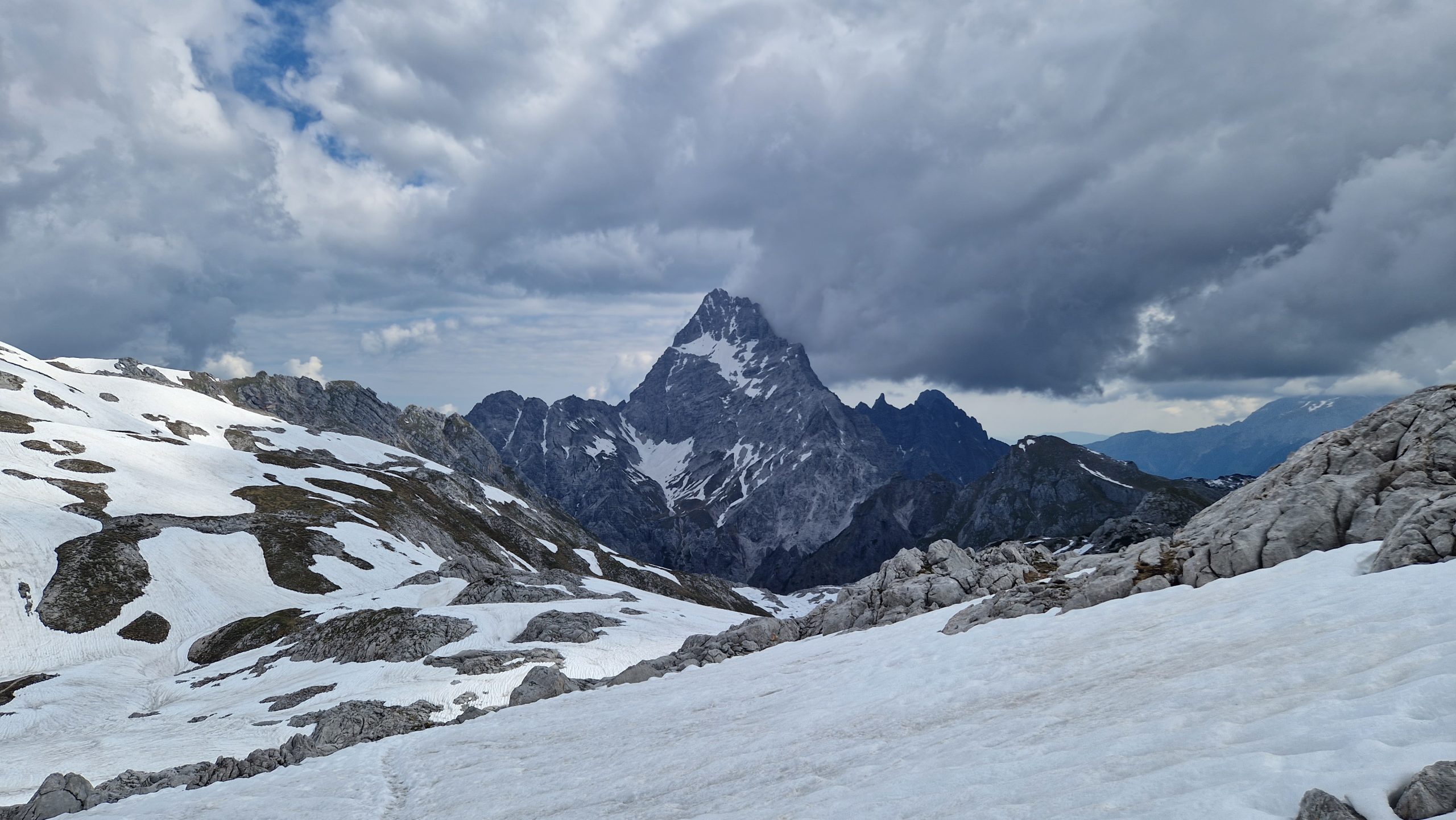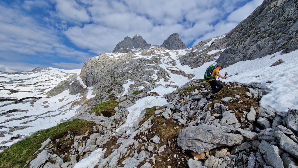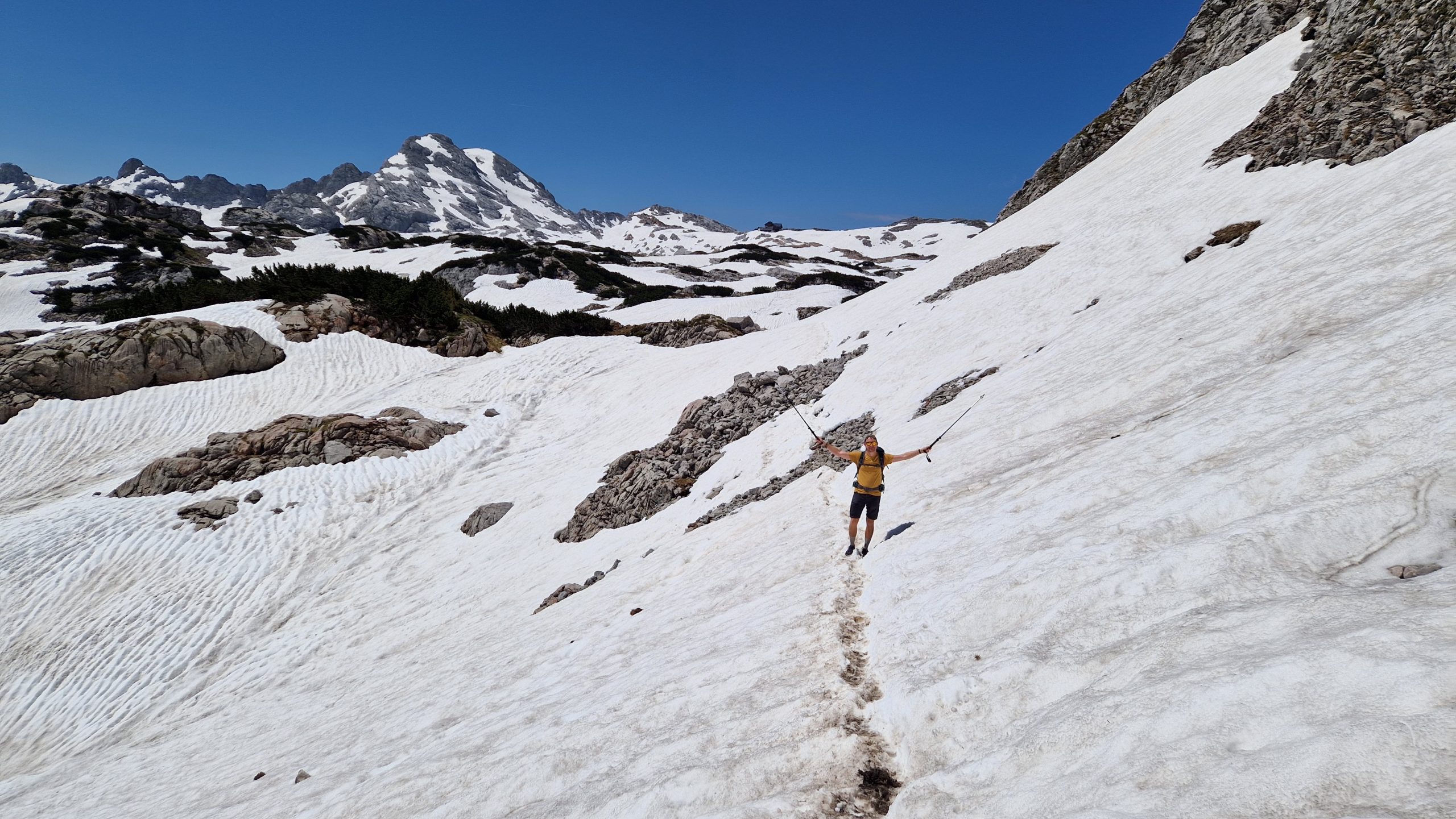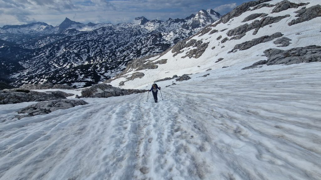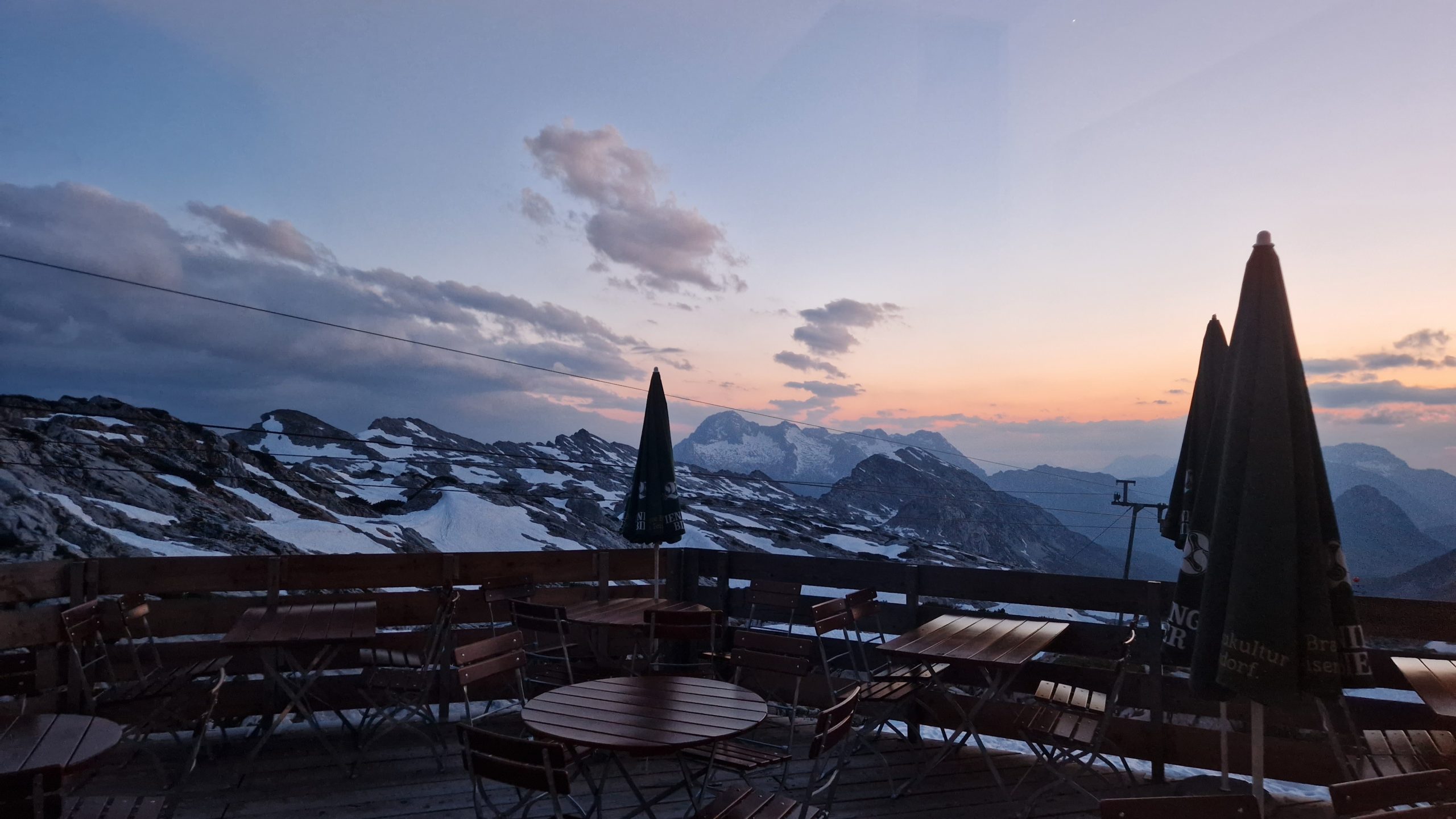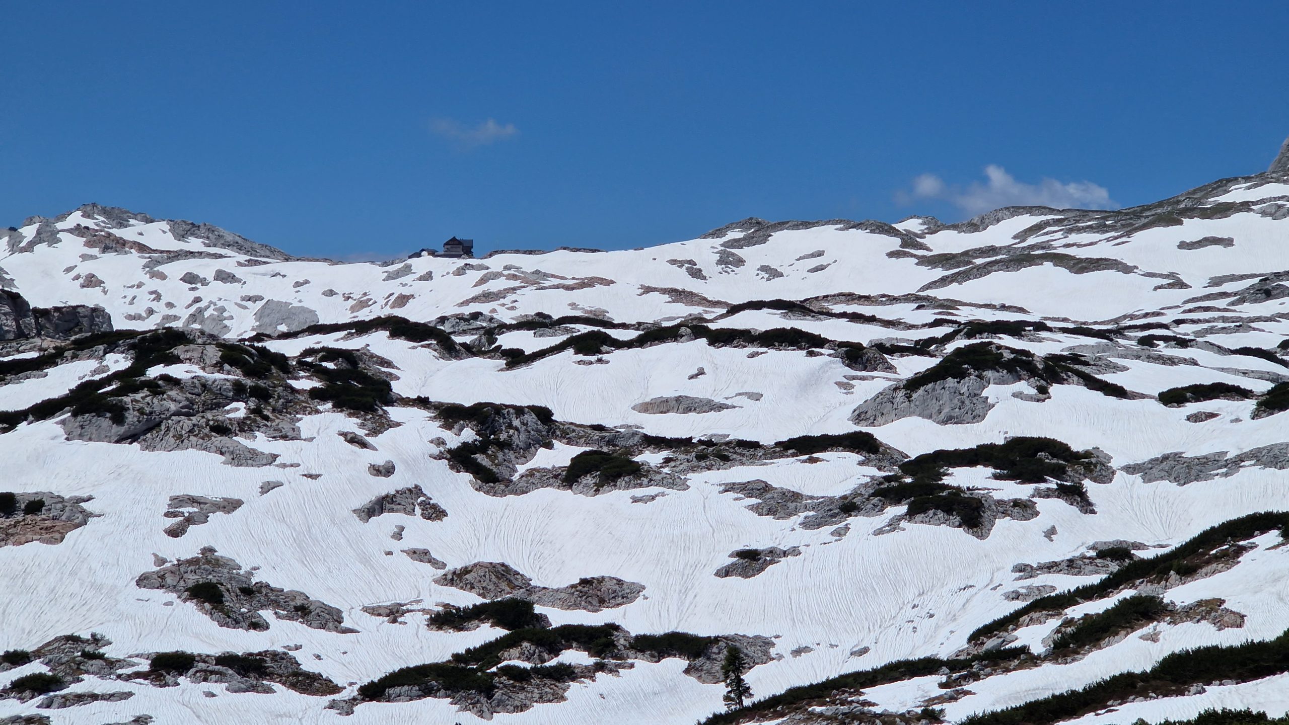 Auch am nächsten Tag müssen wir unsere Pläne anpassen. Auf der langen Route durch das Steinerne Meer sollen noch bis zu zwei Meter Schnee liegen. Stattdessen nehmen wir den direkten Weg zum Ingolstädter Haus. Auch hier laufen wir zwei Drittel der Zeit über Schneefelder. Mittags kommen wir an der Hütte an, die knapp hinter der österreichischen Grenze liegt. Wir sind so ziemlich die Ersten. Den Nachmittag verbringen wir mal wieder mit Zeitschriftenlesen, während langsam mehr Leute eintrudeln. Dem Sonnenuntergang schauen wir nur durchs Fenster zu, draußen ist es kalt geworden.