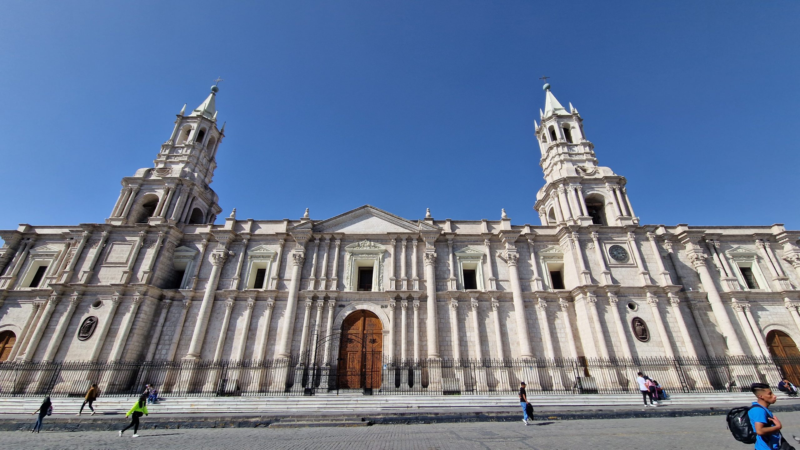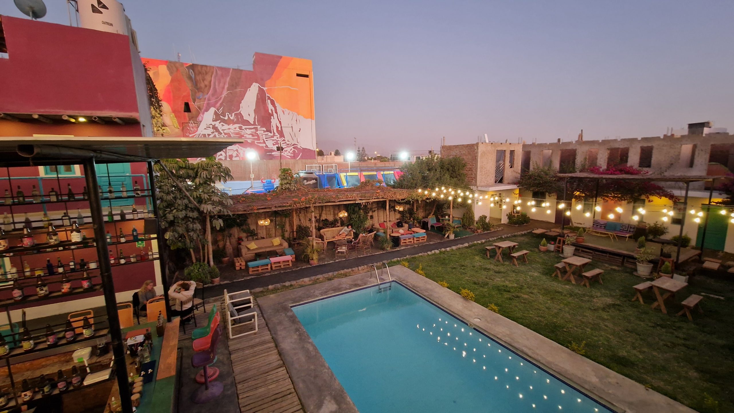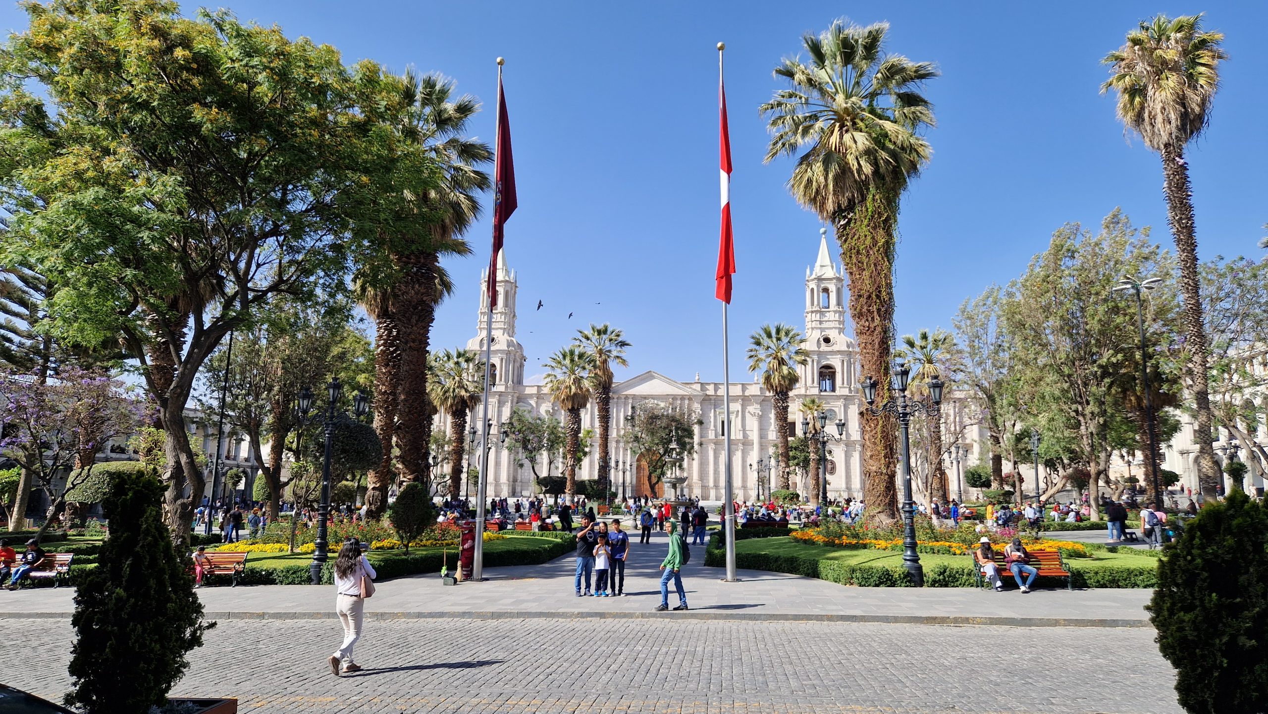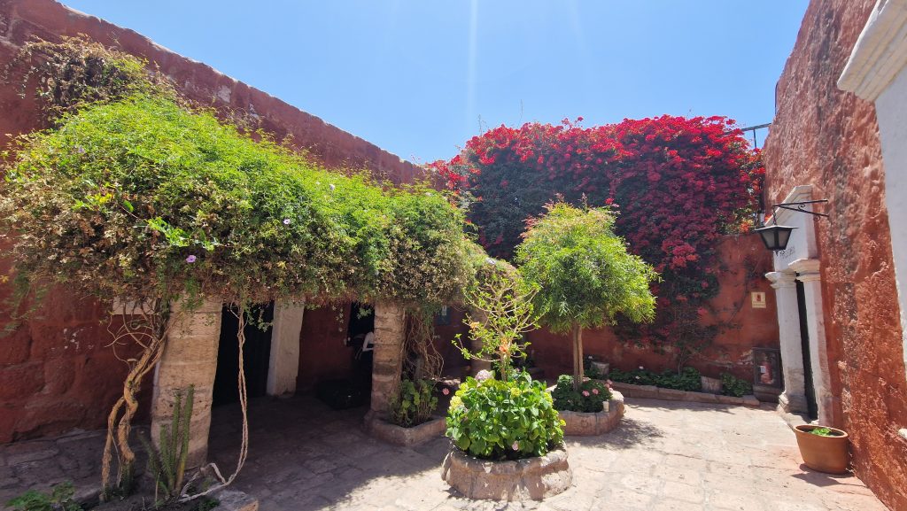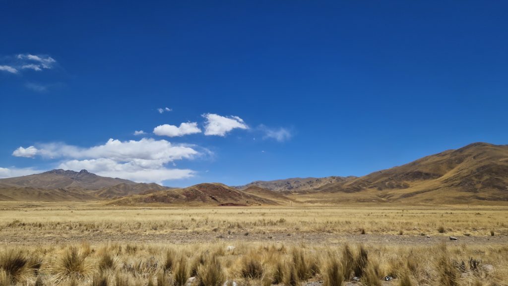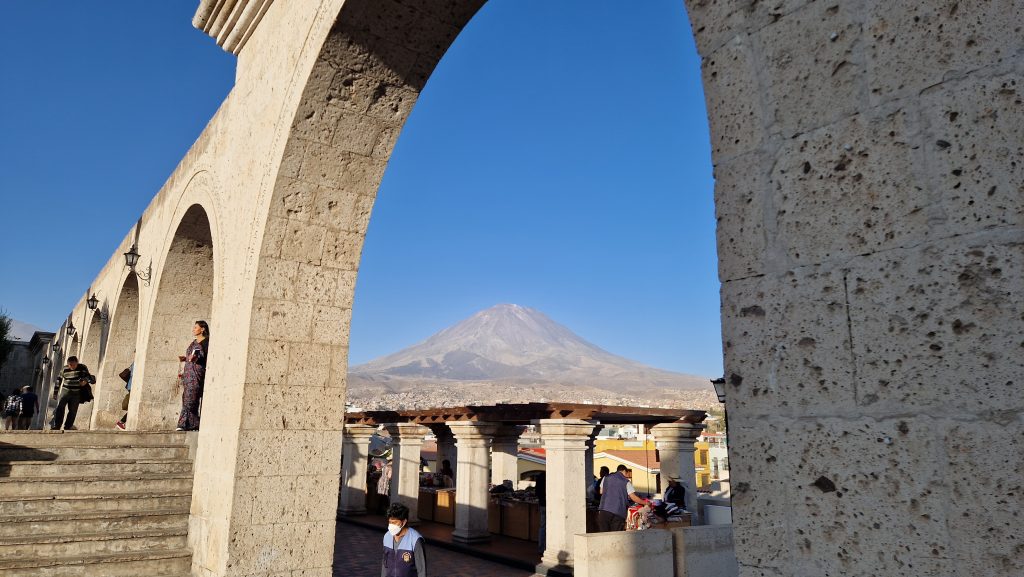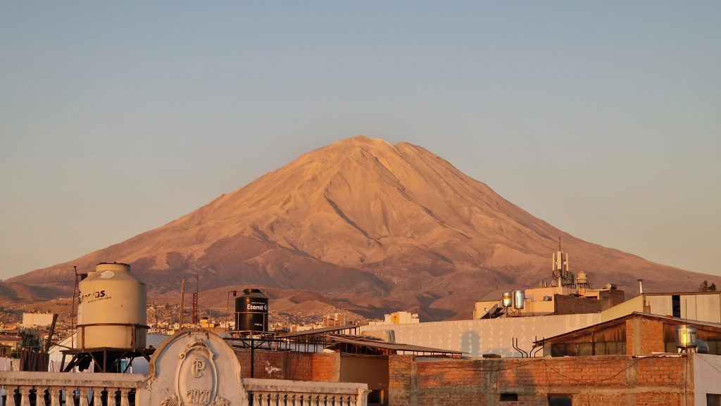 Die Fahrt von Puno nach Arequipa ist lang, aber nicht so lang, dass sich ein Nachtbus lohnen würde. Wir verbringen also den Tag größtenteils im Bus. Arequipa liegt deutlich tiefer als Puno, also dachten wir, der Bus würde überwiegend bergab fahren. Falsch gedacht. Es geht immer weiter nach oben, bis auf 4500m! Später durchqueren wir den Nationalpark Salinas y Aguada Blanca. Man sieht blaue Bergseen, grasende Vicunas und irgendwann auch die Vulkane nordöstlich der Stadt. All das liegt eingebettet in eine karge Wüstenlandschaft mit, leider, stellenweise recht viel Müll. Den Abend verbringen wir in einer kleinen, hübschen Rooftop-Bar.