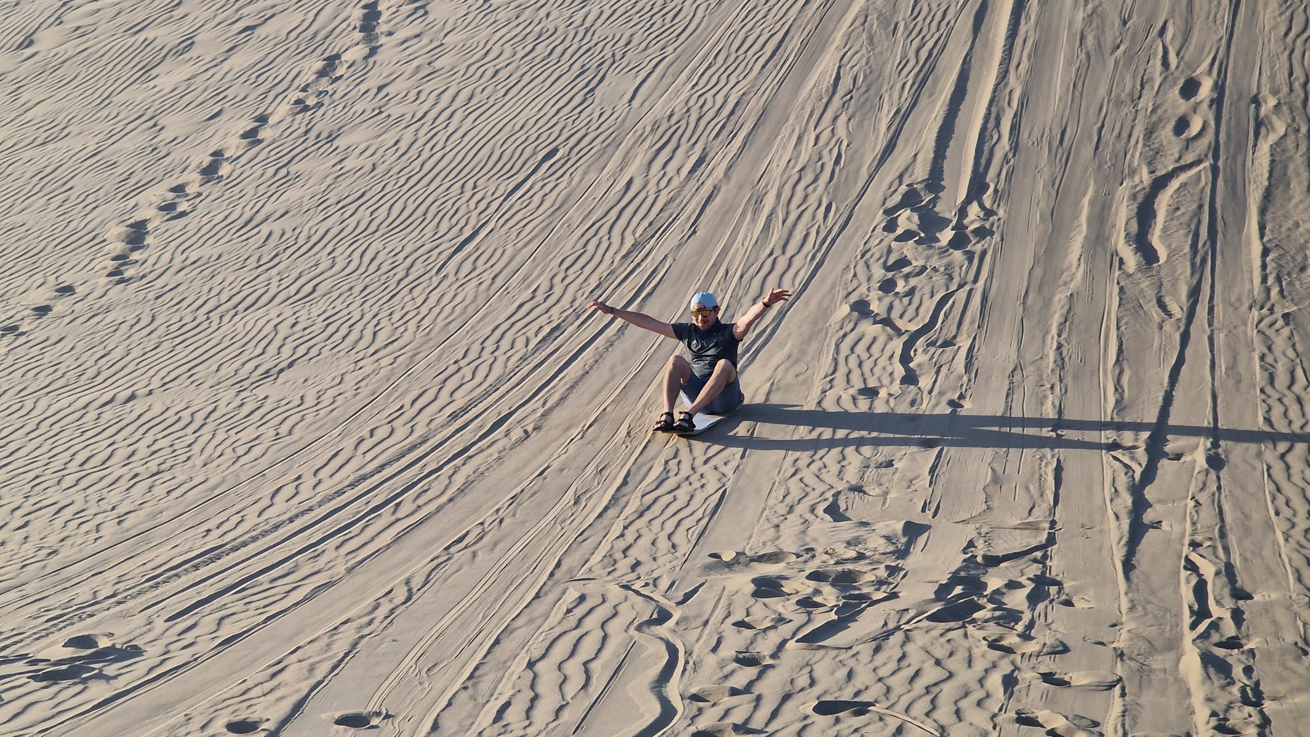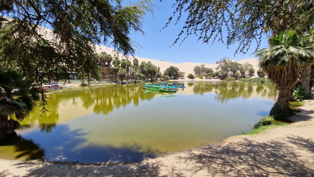 Die nächsten zwei Nächte verbringen wir in einem wirklich coolen Hostel am Stadtrand von Ica. Von dort kann man in ein paar Minuten nach Huacachina laufen. Diese Wüstenoase ist angeblich die einzige in ganz Südamerika. Die Hauptattraktion sind Fahrten in einem Sandbuggy, kombiniert mit Sandboarding. Es gefällt mir besser als erwartet, mich auf den Dünen durchschütteln zu lassen und selbige anschließen auf einem Brett hinunter zu rutschen.